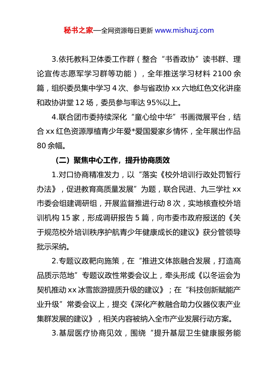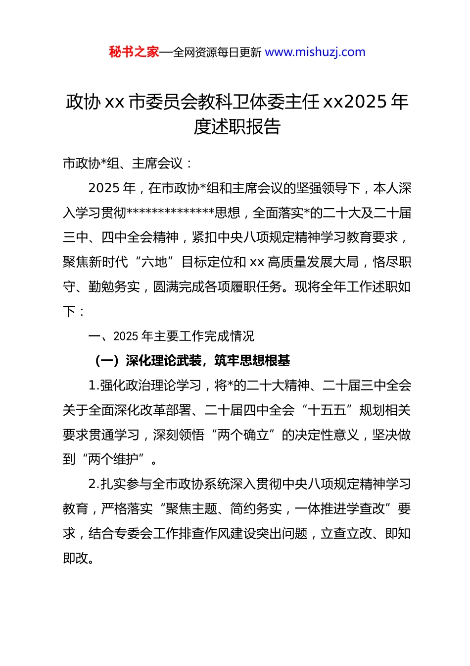 秘书之家—全网资源每日更新 www.mishuzj.com政协 xx 市委员会教科卫体委主任 xx2025 年度述职报告市政协*组、主席会议:2025 年,在市政协*组和主席会议的坚强领导下,本人深入学习贯彻**************思想,全面落实*的二十大及二十届三中、四中全会精神,紧扣中央八项规定精神学习教育要求,聚焦新时代“六地”目标定位和 xx 高质量发展大局,恪尽职守、勤勉务实,圆满完成各项履职任务。现将全年工作述职如下:一、2025 年主要工作完成情况(一)深化理论武装,筑牢思想根基1.强化政治理论学习,将*的二十大精神、二十届三中全会关于全面深化改革部署、二十届四中全会“十五五”规划相关要求贯通学习,深刻领悟“两个确立”的决定性意义,坚决做到“两个维护”。2.扎实参与全市政协系统深入贯彻中央八项规定精神学习教育,严格落实“聚焦主题、简约务实,一体推进学查改”要求,结合专委会工作排查作风建设突出问题,立查立改、即知即改。秘书之家—全网资源每日更新 www.mishuzj.com3.依托教科卫体委工作群(整合“书香政协”读书群、理论宣传志愿军学习群等功能),全年推送学习材料 2100 余篇,组织委员集中学习 4 次、参与省政协 xx 六地红色文化讲座和政协讲堂 12 场,委员参与率达 95%以上。4.联合团市委持续深化“童心绘中华”书画微展平台,结合 xx 红色资源厚植青少年爱*爱国爱家乡情怀,全年展出作品80 余幅。(二)聚焦中心工作,提升协商质效1.对口协商精准发力,以“落实《校外培训行政处罚暂行办法》,促进教育高质量发展”为题,联合民进、九三学社 xx市委会组建调研组,开展监督推进行动 8 次,实地核查校外培训机构 15 家,形成调研报告 5 篇,向市委市政府报送的《关于规范校外培训秩序护航青少年健康成长的建议》获分管领导批示采纳。2.专题议政靶向施策,在“推进文体旅融合发展,打造高品质示范地”专题议政性常委会议上,牵头形成《以冬运会为契机推动 xx 冰雪旅游提质升级的建议》;在“科技创新赋能产业升级”常委会议上,提交《深化产教融合助力仪器仪表产业集群发展的建议》,相关内容被纳入全市产业发展行动方案。3.基层医疗协商见效,围绕“提升基层卫生健康服务能秘书之家—全网资源每日更新 www.mishuzj.com力”,组织市卫健委、医保局等部门召开专题座谈会 6 次,实地走访乡镇卫生院、社区卫生服务中心 20 个,形成的《关于加强基层医疗卫生人才队伍建设的实施建议》,推动省属高校定向培养 xx 乡村医生计划扩容至每年 30 人。(三)服务发展大局,强化议政建言1.全力配合省政协工作,参与“推动东北全面振兴强化科技人才支撑”常委会议筹备,上报《提升高新技术企业自主创新能力助力 xx 产业转型》等 3 篇发言材料,全部被省政协建议报告采用。2.配合省政协开展“推动仪器仪表产业集群式发展”“义务教育优质均衡发展”专题调研,牵头撰写汇报材料 15 篇,其中“支持 xx 仪器仪表产业创新平台建设”“完善乡村教师激励机制”等 4 条建议获省政府领导批示。3.参与地方立法协商,组织委员对《xx 省文明行为促进条例(修订草案)》《xx 市文体旅融合发展促进条例(征求意见稿)》提出修改建议 8 条,其中 3 条被采纳吸收。(四)坚持守正创新,夯实履职基础1.健全工作制度,修订《专委会工作简则》《委员履职量化考核明细表》,编制《教科卫体领域政策法规与发展数据汇编》,为委员精准履职提供参考。秘书之家—全网资源每日更新 www.mishuzj.com2.强化智库支撑,从医疗、科技、教育领域遴选 7 名本地专家扩充智库,参与重大课题调研和建言论证 10 次,提升履职专业性。3.优化界别活动,将 80 名委员划分为基础教育体育、高校、科技、医疗卫生 4 个界别活动组,新建界别活动站 2 个,全年组织界别小组活动 12 次,覆盖委员 160 人次。4.深化委员工作室建设,推动 48 个社区(村)委员工作室常态化开展服务,金崮村委员工作室协调市农科院专家开展蓝莓、软枣猕猴桃种植技术培训 6 场,惠及村民 300 余人;九连城社区委员工作室牵头解决老旧小区供水改造、支路硬化等...
