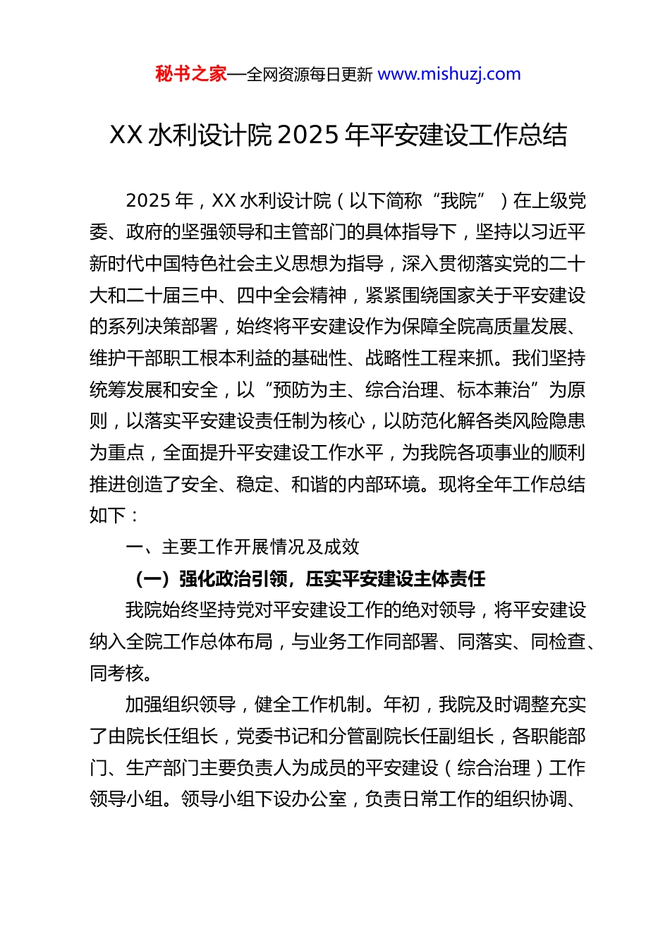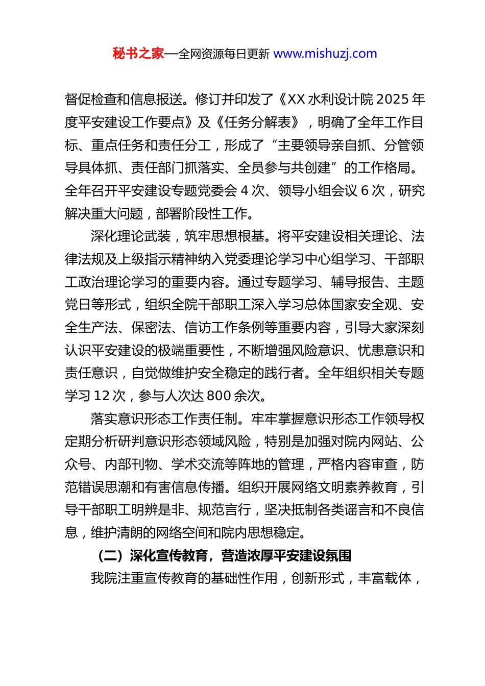 秘书之家—全网资源每日更新 www.mishuzj.comXX 水利设计院 2025 年平安建设工作总结2025 年,XX 水利设计院(以下简称“我院”)在上级党委、政府的坚强领导和主管部门的具体指导下,坚持以习近平新时代中国特色社会主义思想为指导,深入贯彻落实党的二十大和二十届三中、四中全会精神,紧紧围绕国家关于平安建设的系列决策部署,始终将平安建设作为保障全院高质量发展、维护干部职工根本利益的基础性、战略性工程来抓。我们坚持统筹发展和安全,以“预防为主、综合治理、标本兼治”为原则,以落实平安建设责任制为核心,以防范化解各类风险隐患为重点,全面提升平安建设工作水平,为我院各项事业的顺利推进创造了安全、稳定、和谐的内部环境。现将全年工作总结如下:一、主要工作开展情况及成效(一)强化政治引领,压实平安建设主体责任我院始终坚持党对平安建设工作的绝对领导,将平安建设纳入全院工作总体布局,与业务工作同部署、同落实、同检查、同考核。加强组织领导,健全工作机制。年初,我院及时调整充实了由院长任组长,党委书记和分管副院长任副组长,各职能部门、生产部门主要负责人为成员的平安建设(综合治理)工作领导小组。领导小组下设办公室,负责日常工作的组织协调、秘书之家—全网资源每日更新 www.mishuzj.com督促检查和信息报送。修订并印发了《XX 水利设计院 2025 年度平安建设工作要点》及《任务分解表》,明确了全年工作目标、重点任务和责任分工,形成了“主要领导亲自抓、分管领导具体抓、责任部门抓落实、全员参与共创建”的工作格局。全年召开平安建设专题党委会 4 次、领导小组会议 6 次,研究解决重大问题,部署阶段性工作。深化理论武装,筑牢思想根基。将平安建设相关理论、法律法规及上级指示精神纳入党委理论学习中心组学习、干部职工政治理论学习的重要内容。通过专题学习、辅导报告、主题党日等形式,组织全院干部职工深入学习总体国家安全观、安全生产法、保密法、信访工作条例等重要内容,引导大家深刻认识平安建设的极端重要性,不断增强风险意识、忧患意识和责任意识,自觉做维护安全稳定的践行者。全年组织相关专题学习 12 次,参与人次达 800 余次。落实意识形态工作责任制。牢牢掌握意识形态工作领导权定期分析研判意识形态领域风险,特别是加强对院内网站、公众号、内部刊物、学术交流等阵地的管理,严格内容审查,防范错误思潮和有害信息传播。组织开展网络文明素养教育,引导干部职工明辨是非、规范言行,坚决抵制各类谣言和不良信息,维护清朗的网络空间和院内思想稳定。(二)深化宣传教育,营造浓厚平安建设氛围我院注重宣传教育的基础性作用,创新形式,丰富载体,秘书之家—全网资源每日更新 www.mishuzj.com着力提升全院干部职工的安全素养和法治观念。突出重点内容宣传。紧密结合水利设计行业特点,围绕安全生产、消防安全、交通安全、网络安全、保密管理、防灾减灾、反间谍反恐怖、扫黑除恶、禁毒防艾等重点内容,开展常态化宣传教育。利用“安全生产月”“国家宪法日”“消防安全宣传日”等重要节点,组织开展大型集中宣传活动 8 次,举办专题讲座、知识竞赛、应急演练等活动 15 场次。拓展宣传教育渠道。充分利用院内宣传栏、电子显示屏、内部网站、微信公众号等平台,持续推送平安建设知识、典型案例警示、工作动态等信息。制作并更新平安建设专题宣传展板 20 块,悬挂宣传横幅标语 35 条,发放各类安全知识手册、宣传折页 2000 余份。创新运用短视频、H5 等新媒体形式,制作推送易懂易记的安全提示和普法内容,提升宣传的吸引力和覆盖面。注重法治文化建设。组织开展“法治进院所”“平安建设大家谈”等主题活动,邀请法律顾问、公安干警、消防专家等进行现场授课和咨询答疑。举办“以案释法”警示教育会,选取行业内外发生的安全事故、泄密案件、信访案例等进行深入剖析,用身边事教育身边人,引导干部职工尊法学法守法用法。全年接受各类法律、安全咨询 150 余人次,有效提升了干部职工的法治意识和自我保护能力。(三)健全防控体系,提升内部治安防范能力秘书之家—全网资源每...
