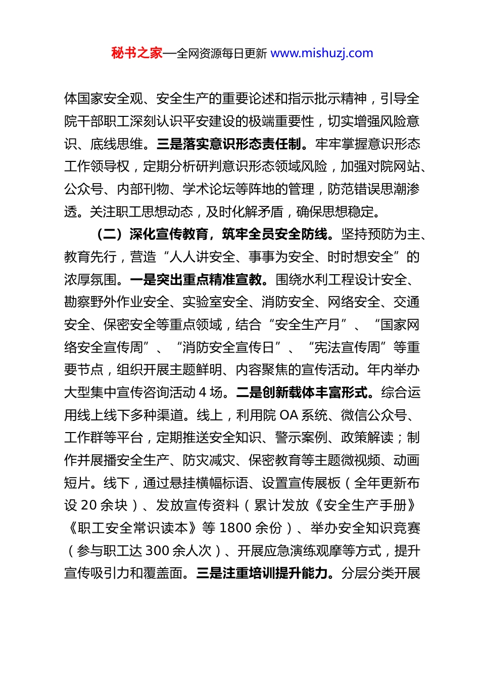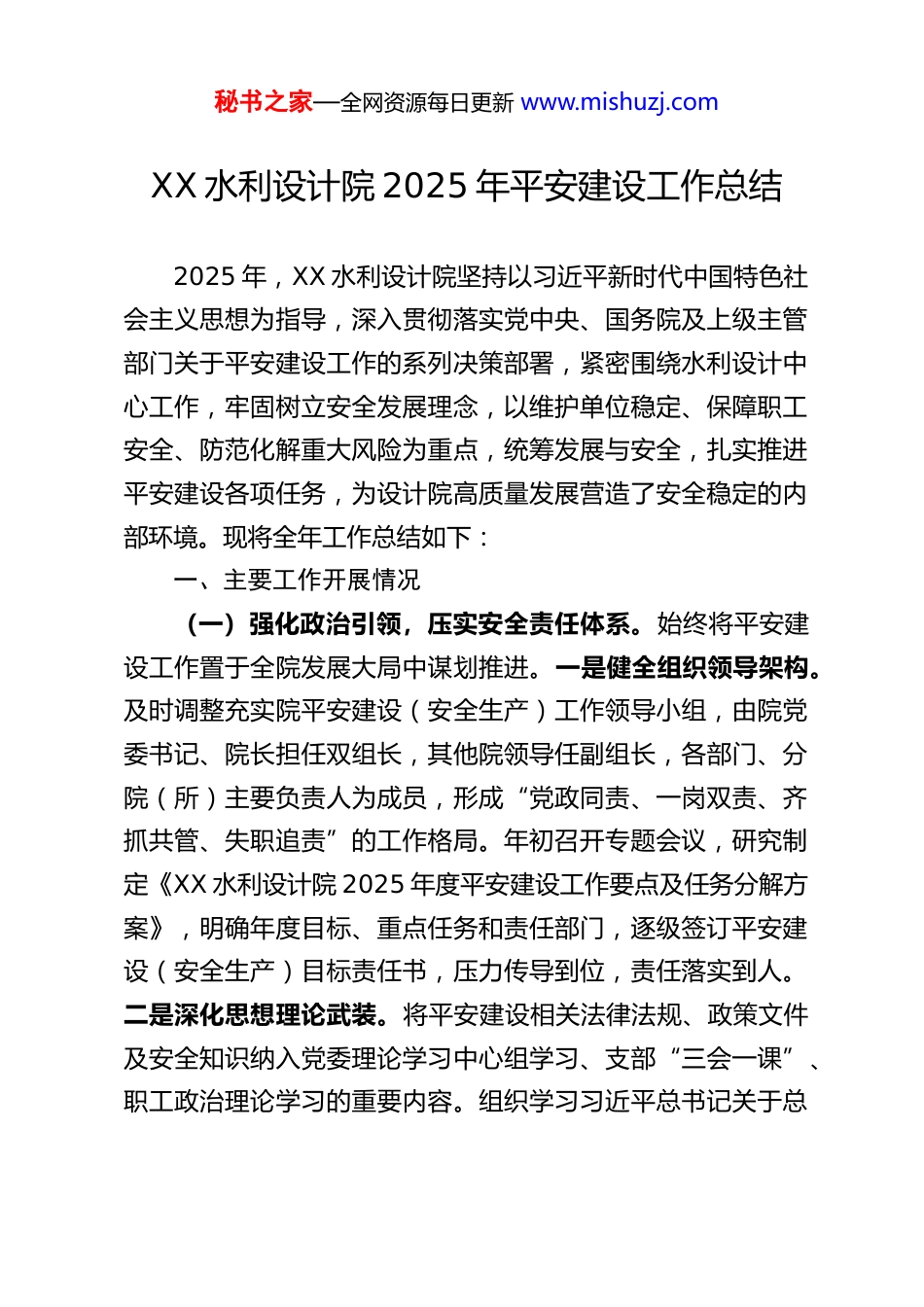 秘书之家—全网资源每日更新 www.mishuzj.comXX 水利设计院 2025 年平安建设工作总结2025 年,XX 水利设计院坚持以习近平新时代中国特色社会主义思想为指导,深入贯彻落实党中央、国务院及上级主管部门关于平安建设工作的系列决策部署,紧密围绕水利设计中心工作,牢固树立安全发展理念,以维护单位稳定、保障职工安全、防范化解重大风险为重点,统筹发展与安全,扎实推进平安建设各项任务,为设计院高质量发展营造了安全稳定的内部环境。现将全年工作总结如下:一、主要工作开展情况(一)强化政治引领,压实安全责任体系。始终将平安建设工作置于全院发展大局中谋划推进。一是健全组织领导架构。及时调整充实院平安建设(安全生产)工作领导小组,由院党委书记、院长担任双组长,其他院领导任副组长,各部门、分院(所)主要负责人为成员,形成“党政同责、一岗双责、齐抓共管、失职追责”的工作格局。年初召开专题会议,研究制定《XX 水利设计院 2025 年度平安建设工作要点及任务分解方案》,明确年度目标、重点任务和责任部门,逐级签订平安建设(安全生产)目标责任书,压力传导到位,责任落实到人。二是深化思想理论武装。将平安建设相关法律法规、政策文件及安全知识纳入党委理论学习中心组学习、支部“三会一课”、职工政治理论学习的重要内容。组织学习习近平总书记关于总秘书之家—全网资源每日更新 www.mishuzj.com体国家安全观、安全生产的重要论述和指示批示精神,引导全院干部职工深刻认识平安建设的极端重要性,切实增强风险意识、底线思维。三是落实意识形态责任制。牢牢掌握意识形态工作领导权,定期分析研判意识形态领域风险,加强对院网站、公众号、内部刊物、学术论坛等阵地的管理,防范错误思潮渗透。关注职工思想动态,及时化解矛盾,确保思想稳定。(二)深化宣传教育,筑牢全员安全防线。坚持预防为主、教育先行,营造“人人讲安全、事事为安全、时时想安全”的浓厚氛围。一是突出重点精准宣教。围绕水利工程设计安全、勘察野外作业安全、实验室安全、消防安全、网络安全、交通安全、保密安全等重点领域,结合“安全生产月”、“国家网络安全宣传周”、“消防安全宣传日”、“宪法宣传周”等重要节点,组织开展主题鲜明、内容聚焦的宣传活动。年内举办大型集中宣传咨询活动 4 场。二是创新载体丰富形式。综合运用线上线下多种渠道。线上,利用院 OA 系统、微信公众号、工作群等平台,定期推送安全知识、警示案例、政策解读;制作并展播安全生产、防灾减灾、保密教育等主题微视频、动画短片。线下,通过悬挂横幅标语、设置宣传展板(全年更新布设 20 余块)、发放宣传资料(累计发放《安全生产手册》《职工安全常识读本》等 1800 余份)、举办安全知识竞赛(参与职工达 300 余人次)、开展应急演练观摩等方式,提升宣传吸引力和覆盖面。三是注重培训提升能力。分层分类开展秘书之家—全网资源每日更新 www.mishuzj.com安全教育培训。组织院领导、中层干部参加安全管理专题研修班;针对项目负责人、安全员、新入职员工、驾驶员、实验室人员、涉密人员等不同群体,开展专项安全技能和操作规程培训 15 期,培训覆盖率达 95%以上。邀请消防、公安、保密、网信等部门专家来院举办讲座 6 次,提升职工安全防范和应急处置能力。(三)健全治理机制,提升风险防控效能。着力构建系统完备、科学规范、运行有效的平安建设长效机制。一是完善安全管理制度体系。对照新形势新要求,全面梳理、修订和完善院内各项安全管理制度。重点修订了《安全生产管理办法》《突发事件综合应急预案》《消防安全管理规定》《网络安全管理办法》《保密工作实施细则》《信访工作制度》等核心制度 20 余项,新增了《海外项目安全风险防控制度》《数据安全管理办法》等,使制度覆盖更全面、操作性更强。二是强化隐患排查治理闭环管理。建立健全“院级季度查、部门月度查、班组(项目组)经常查”的三级隐患排查机制。聚焦办公场所、实验室、档案室、机房、食堂、出租物业、勘察外业现场、设计项目现场(配合检查)等重点部位,紧盯消防、用电、燃气、危化品、...