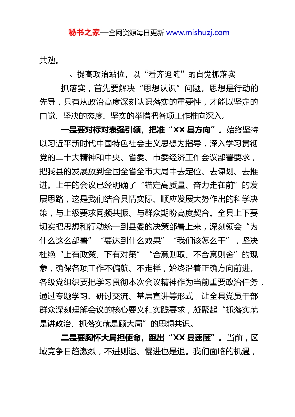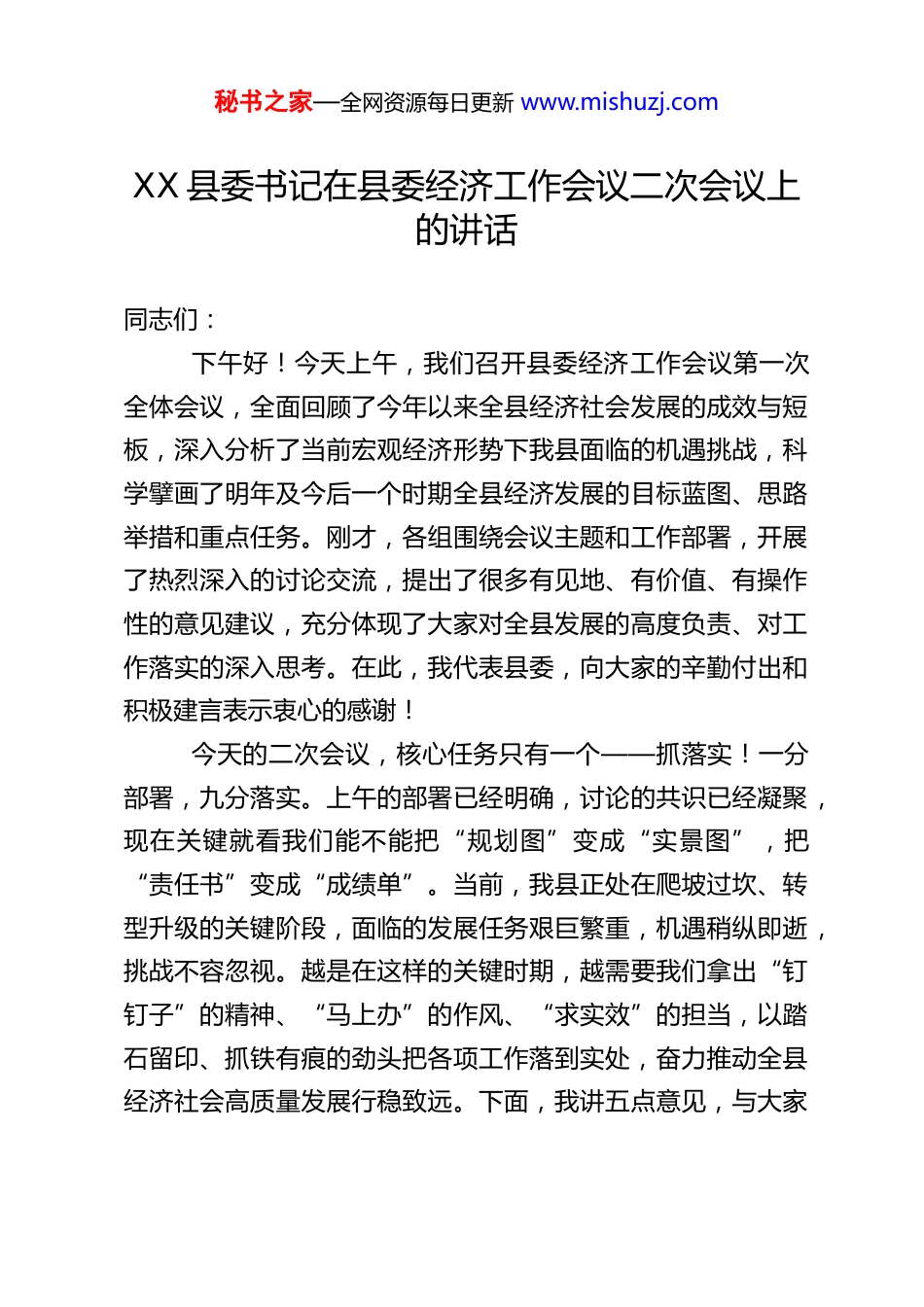 秘书之家—全网资源每日更新 www.mishuzj.comXX 县委书记在县委经济工作会议二次会议上的讲话同志们:下午好!今天上午,我们召开县委经济工作会议第一次全体会议,全面回顾了今年以来全县经济社会发展的成效与短板,深入分析了当前宏观经济形势下我县面临的机遇挑战,科学擘画了明年及今后一个时期全县经济发展的目标蓝图、思路举措和重点任务。刚才,各组围绕会议主题和工作部署,开展了热烈深入的讨论交流,提出了很多有见地、有价值、有操作性的意见建议,充分体现了大家对全县发展的高度负责、对工作落实的深入思考。在此,我代表县委,向大家的辛勤付出和积极建言表示衷心的感谢!今天的二次会议,核心任务只有一个——抓落实!一分部署,九分落实。上午的部署已经明确,讨论的共识已经凝聚,现在关键就看我们能不能把“规划图”变成“实景图”,把“责任书”变成“成绩单”。当前,我县正处在爬坡过坎、转型升级的关键阶段,面临的发展任务艰巨繁重,机遇稍纵即逝,挑战不容忽视。越是在这样的关键时期,越需要我们拿出“钉钉子”的精神、“马上办”的作风、“求实效”的担当,以踏石留印、抓铁有痕的劲头把各项工作落到实处,奋力推动全县经济社会高质量发展行稳致远。下面,我讲五点意见,与大家秘书之家—全网资源每日更新 www.mishuzj.com共勉。一、提高政治站位,以“看齐追随”的自觉抓落实抓落实,首先要解决“思想认识”问题。思想是行动的先导,只有从政治高度深刻认识落实的重要性,才能以坚定的自觉、坚决的态度、坚实的举措把各项工作推向深入。一是要对标对表强引领,把准“XX 县方向”。始终坚持以习近平新时代中国特色社会主义思想为指导,深入学习贯彻党的二十大精神和中央、省委、市委经济工作会议部署要求,把我县的发展放到全国全省全市大局中去定位、去谋划、去推进。上午的会议已经明确了“锚定高质量、奋力走在前”的发展思路,这是我们结合县情实际、顺应发展大势作出的科学决策,与上级要求同频共振、与群众期盼高度契合。全县上下要切实把思想和行动统一到县委的决策部署上来,深刻领会“为什么这么部署”“要达到什么效果”“我们该怎么干”,坚决杜绝“上有政策、下有对策”“合意则取、不合意则舍”的现象,确保各项工作不偏航、不走样,始终沿着正确方向前进。各级党组织要把学习贯彻本次会议精神作为当前重要政治任务,通过专题学习、研讨交流、基层宣讲等形式,让全县党员干部群众深刻理解会议的核心要义和实践要求,凝聚起“抓落实就是讲政治、抓落实就是顾大局”的思想共识。二是要胸怀大局担使命,跑出“XX 县速度”。当前,区域竞争日趋激烈,不进则退、慢进也是退。我们面临的机遇,秘书之家—全网资源每日更新 www.mishuzj.com是政策叠加、要素集聚的机遇;我们面临的挑战,是标兵渐远、追兵渐近的挑战。上午各组讨论中,不少同志都提到,要抢占发展先机,必须拿出“时不我待、只争朝夕”的紧迫感。这种紧迫感,本质上就是政治担当。全县各级党组织和广大党员干部要切实增强“时时放心不下”的责任感,把落实县委部署作为践行“两个维护”的具体行动,以“走在前列”的奋进姿态,主动对标先进地区,敢于同强的比、向高的攀、跟快的赛,在争先进位中展现 XX 县的担当和作为。要建立“对标先进、争先进位”的考核评价机制,把我县的发展指标与先进县市逐一比对,找出差距、分析原因、制定措施,以“拼”的姿态、“抢”的劲头,把失去的时间抢回来、把发展的节奏提起来,用实实在在的发展速度回应组织的信任和群众的期待。三是要强化担当显锐气,激发“XX 县锐气”。抓落实的过程,必然会遇到各种困难和阻力,没有一股子“闯劲”“拼劲”“韧劲”是不行的。我们要传承和发扬敢闯敢试的优良传统,把“比学赶超”作为一种工作常态、一种精神追求。要敢于打破思维定势、路径依赖,在落实中创新、在创新中落实,对于定下来的事情,不等不靠、主动作为;对于遇到的难题,迎难而上、攻坚破难。要坚决摒弃“等靠要”思想和“躺平”心态,以“逢山开路、遇水架桥”的锐气,在破解发展瓶颈、攻克工作难点中推动落实。各级领导干部要发挥...