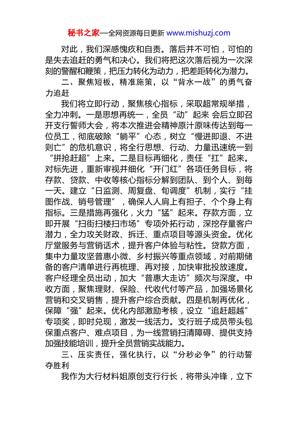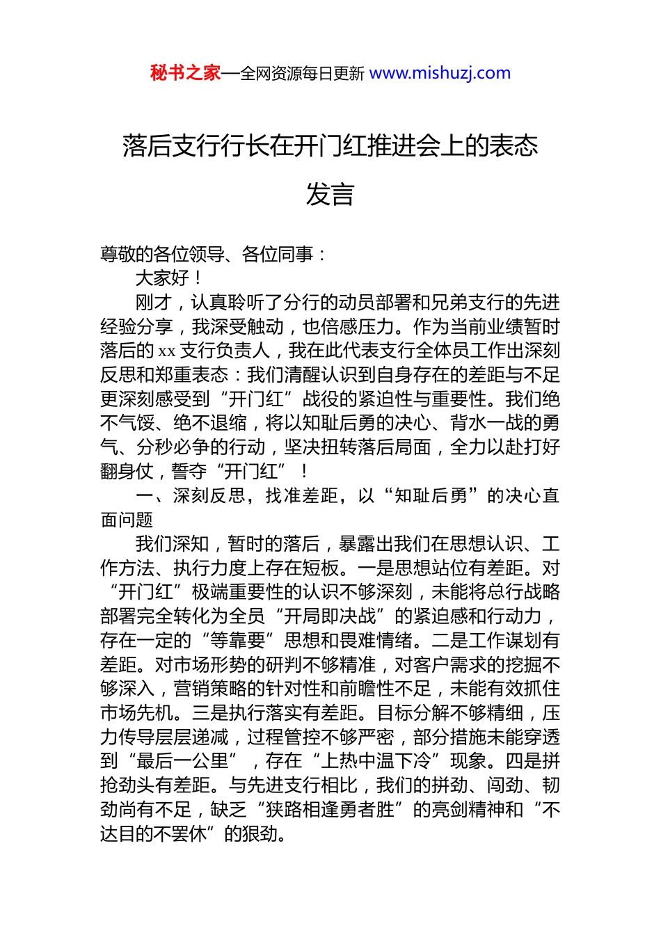 秘书之家—全网资源每日更新 www.mishuzj.com落后支行行长在开门红推进会上的表态发言尊敬的各位领导、各位同事:大家好!刚才,认真聆听了分行的动员部署和兄弟支行的先进经验分享,我深受触动,也倍感压力。作为当前业绩暂时落后的 xx 支行负责人,我在此代表支行全体员工作出深刻反思和郑重表态:我们清醒认识到自身存在的差距与不足更深刻感受到“开门红”战役的紧迫性与重要性。我们绝不气馁、绝不退缩,将以知耻后勇的决心、背水一战的勇气、分秒必争的行动,坚决扭转落后局面,全力以赴打好翻身仗,誓夺“开门红”!一、深刻反思,找准差距,以“知耻后勇”的决心直面问题我们深知,暂时的落后,暴露出我们在思想认识、工作方法、执行力度上存在短板。一是思想站位有差距。对“开门红”极端重要性的认识不够深刻,未能将总行战略部署完全转化为全员“开局即决战”的紧迫感和行动力,存在一定的“等靠要”思想和畏难情绪。二是工作谋划有差距。对市场形势的研判不够精准,对客户需求的挖掘不够深入,营销策略的针对性和前瞻性不足,未能有效抓住市场先机。三是执行落实有差距。目标分解不够精细,压力传导层层递减,过程管控不够严密,部分措施未能穿透到“最后一公里”,存在“上热中温下冷”现象。四是拼抢劲头有差距。与先进支行相比,我们的拼劲、闯劲、韧劲尚有不足,缺乏“狭路相逢勇者胜”的亮剑精神和“不达目的不罢休”的狠劲。秘书之家—全网资源每日更新 www.mishuzj.com对此,我们深感愧疚和自责。落后并不可怕,可怕的是失去追赶的勇气和决心。我们将把这次落后视为一次深刻的警醒和鞭策,把压力转化为动力,把差距转化为潜力。二、聚焦短板,精准施策,以“背水一战”的勇气奋力追赶我们将立即行动,聚焦核心指标,采取超常规举措,全力冲刺。一是思想再统一,全员“动”起来 会后立即召开支行誓师大会,将本次推进会精神原汁原味传达到每一位员工,彻底破除“躺平”心态,树立“慢进即退、不进则亡”的危机意识,将全行思想、行动、力量迅速统一到“拼抢赶超”上来。二是目标再细化,责任“扛”起来。对标先进,重新审视并细化“开门红”各项任务目标,将存款、贷款、中收等核心指标分解到团队、到个人、到每一天。建立“日监测、周复盘、旬调度”机制,实行“挂图作战、销号管理”,确保人人肩上有担子、个个身上有指标。三是措施再强化,火力“猛”起来。存款方面,立即开展“扫街扫楼扫市场”专项外拓行动,深挖存量客户潜力,全力攻关财政、拆迁、重点项目等源头资金。优化厅堂服务与营销话术,提升客户体验与粘性。贷款方面,集中力量攻坚普惠小微、乡村振兴等重点领域,对前期储备的客户清单进行再梳理、再对接,加快审批投放速度。客户经理全员出动,加大“普惠大走访”频次与深度。中收方面,聚焦理财、保险、代收代付等产品,加强场景化营销和交叉销售,提升客户综合贡献。四是机制再优化,保障“强”起来。优化内部激励考核,设立“追赶超越”专项奖,即时兑现,激发一线活力。支行班子成员带头包保重点客户、难点项目,为一线营销扫清障碍、提供支持加强技能培训,提升全员营销实战能力。三、压实责任,强化执行,以“分秒必争”的行动誓夺胜利我作为大行材料姐原创支行行长,将带头冲锋,立下秘书之家—全网资源每日更新 www.mishuzj.com军令状。一是带头扛起责任。我将把主要精力和时间投入到“开门红”冲刺中,亲自跑市场、攻大户、解难题,与员工并肩战斗在最前线。二是带头转变作风。大力弘扬“事不过夜、案无积卷”的实干作风,坚决杜绝形式主义以结果论英雄,用业绩说话。三是带头严格督战。对支行“开门红”进展实行“一日一通报、一周一点评”,对进度滞后的团队和个人及时约谈、帮扶,对表现突出的及时表彰、重奖,在全行营造“比学赶超、奋勇争先”的浓厚氛围。各位领导、同事们,逆水行舟,不进则退。xx 支行全体将士已经深刻认识到形势的严峻和自身的不足。我们恳请总行领导和兄弟支行给予我们更多的指导与支持。我们坚信,没有爬不过的坡,没有跨不过的坎。我们将以破釜沉舟的决心、卧薪尝胆的毅力,全员出击、全力拼抢,坚...