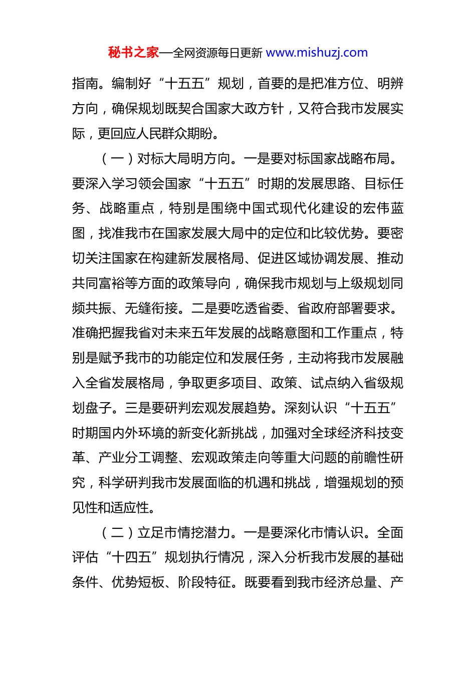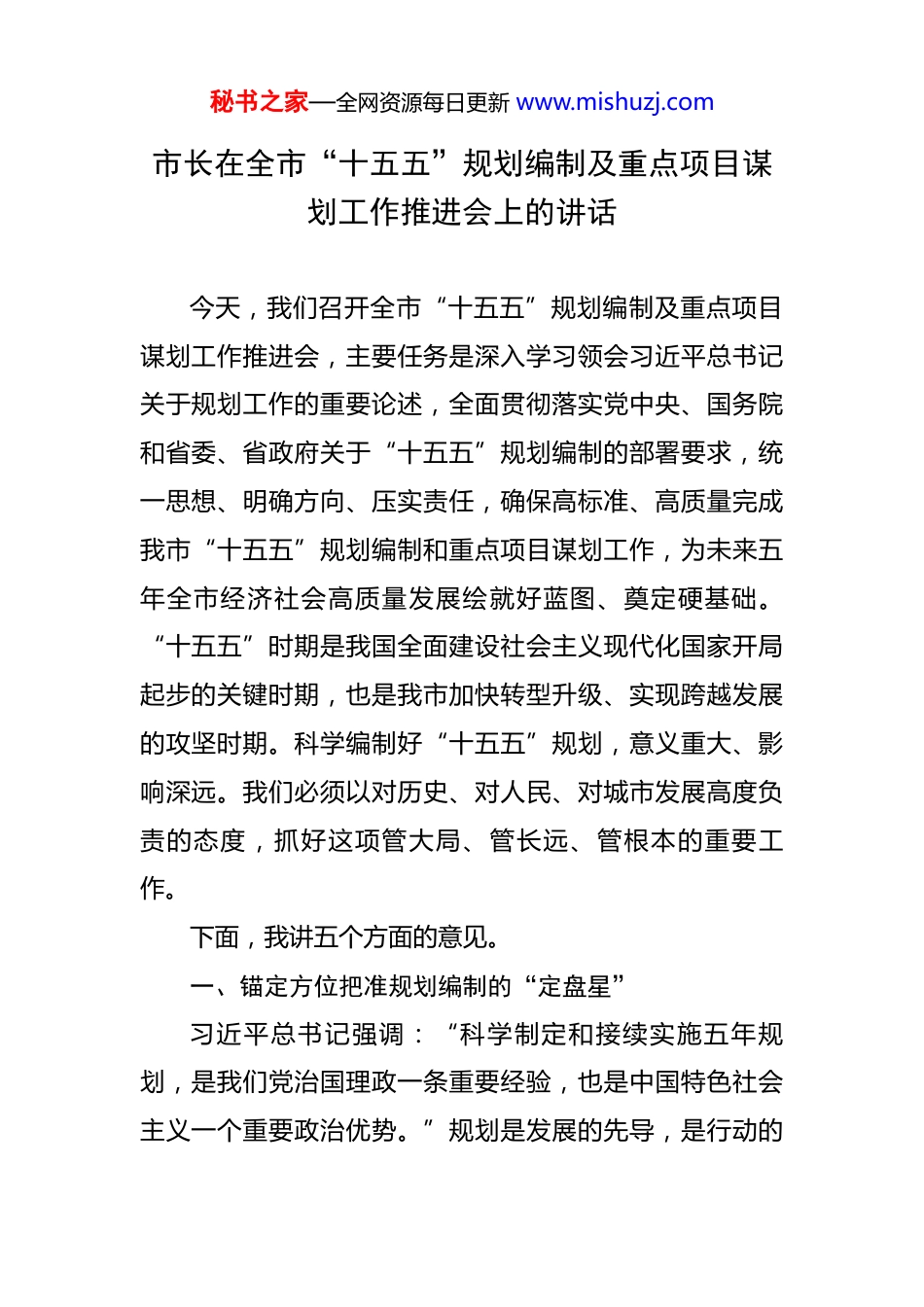 秘书之家—全网资源每日更新 www.mishuzj.com市长在全市“十五五”规划编制及重点项目谋划工作推进会上的讲话 今天,我们召开全市“十五五”规划编制及重点项目谋划工作推进会,主要任务是深入学习领会习近平总书记关于规划工作的重要论述,全面贯彻落实党中央、国务院和省委、省政府关于“十五五”规划编制的部署要求,统一思想、明确方向、压实责任,确保高标准、高质量完成我市“十五五”规划编制和重点项目谋划工作,为未来五年全市经济社会高质量发展绘就好蓝图、奠定硬基础。“十五五”时期是我国全面建设社会主义现代化国家开局起步的关键时期,也是我市加快转型升级、实现跨越发展的攻坚时期。科学编制好“十五五”规划,意义重大、影响深远。我们必须以对历史、对人民、对城市发展高度负责的态度,抓好这项管大局、管长远、管根本的重要工作。下面,我讲五个方面的意见。一、锚定方位把准规划编制的“定盘星”习近平总书记强调:“科学制定和接续实施五年规划,是我们党治国理政一条重要经验,也是中国特色社会主义一个重要政治优势。”规划是发展的先导,是行动的秘书之家—全网资源每日更新 www.mishuzj.com指南。编制好“十五五”规划,首要的是把准方位、明辨方向,确保规划既契合国家大政方针,又符合我市发展实际,更回应人民群众期盼。(一)对标大局明方向。一是要对标国家战略布局。要深入学习领会国家“十五五”时期的发展思路、目标任务、战略重点,特别是围绕中国式现代化建设的宏伟蓝图,找准我市在国家发展大局中的定位和比较优势。要密切关注国家在构建新发展格局、促进区域协调发展、推动共同富裕等方面的政策导向,确保我市规划与上级规划同频共振、无缝衔接。二是要吃透省委、省政府部署要求。准确把握我省对未来五年发展的战略意图和工作重点,特别是赋予我市的功能定位和发展任务,主动将我市发展融入全省发展格局,争取更多项目、政策、试点纳入省级规划盘子。三是要研判宏观发展趋势。深刻认识“十五五”时期国内外环境的新变化新挑战,加强对全球经济科技变革、产业分工调整、宏观政策走向等重大问题的前瞻性研究,科学研判我市发展面临的机遇和挑战,增强规划的预见性和适应性。(二)立足市情挖潜力。一是要深化市情认识。全面评估“十四五”规划执行情况,深入分析我市发展的基础条件、优势短板、阶段特征。既要看到我市经济总量、产秘书之家—全网资源每日更新 www.mishuzj.com业结构、创新能力等方面的长足进步,也要清醒认识到在城乡区域发展、民生社会事业、生态环境治理等方面存在的不足和差距。二是要挖掘潜在优势。立足我市资源禀赋、产业基础、区位特点、人文底蕴,深入挖掘在科技创新、产业发展、对外开放、绿色发展等方面的潜在优势和增长点。例如,要深入研究如何将我市的科教资源、产业配套、交通枢纽等优势转化为发展胜势。三是要找准发力重点。坚持问题导向和目标导向相结合,围绕制约我市高质量发展的突出短板和人民群众反映强烈的急难愁盼问题,明确“十五五”期间需要集中攻坚的关键领域和重点任务,确保规划提出的目标和举措有的放矢、精准发力。(三)倾听民声汇民智。一是要坚持开门编规划。规划编制不能闭门造车,要畅通民意渠道,通过座谈会、听证会、网络平台征求意见等多种形式,广泛听取人大代表、政协委员、专家学者、企业家、基层干部和广大市民的意见建议,让规划编制过程成为凝聚社会共识、汇聚各方智慧的过程。二是要聚焦民生关切。坚持人民城市人民建、人民城市为人民,把促进共同富裕、提升公共服务水平、改善人居环境、保障公共安全等民生福祉内容作为规划的重中之重,努力使规划更好地反映人民意愿、保障人民权益、增进人民福祉。要认真研究吸纳人民群众在“十秘书之家—全网资源每日更新 www.mishuzj.com五五”规划编制网络征求意见活动中提出的有价值建议。三是要推动成果共享。使规划真正体现发展为了人民、发展依靠人民、发展成果由人民共享的价值取向,将群众的“急难愁盼”转化为规划的“重点清单”,让越来越多群众的“指尖建议”走上“政府案头”,最终转化为令人满意的“民生答卷”。二、聚焦...