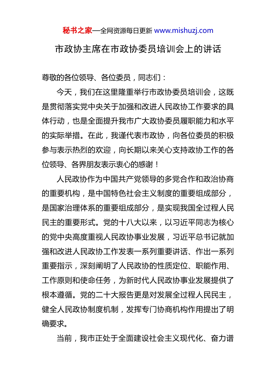 秘书之家—全网资源每日更新 www.mishuzj.com市政协主席在市政协委员培训会上的讲话 尊敬的各位领导、各位委员,同志们:今天,我们在这里隆重举行市政协委员培训会,这既是贯彻落实党中央关于加强和改进人民政协工作要求的具体行动,也是全面提升我市广大政协委员履职能力和水平的实际举措。在此,我谨代表市政协,向各位委员的积极参与表示热烈的欢迎,向长期以来关心支持政协工作的各位领导、各界朋友表示衷心的感谢!人民政协作为中国共产党领导的多党合作和政治协商的重要机构,是中国特色社会主义制度的重要组成部分,是国家治理体系的重要组成部分,是实现我国全过程人民民主的重要形式。党的十八大以来,以习近平同志为核心的党中央高度重视人民政协事业发展,习近平总书记就加强和改进人民政协工作发表一系列重要讲话、作出一系列重要指示,深刻阐明了人民政协的性质定位、职能作用、工作原则和使命任务,为新时代人民政协事业发展提供了根本遵循。党的二十大报告更是对发展全过程人民民主,健全人民政协制度机制,发挥专门协商机构作用提出了明确要求。当前,我市正处于全面建设社会主义现代化、奋力谱秘书之家—全网资源每日更新 www.mishuzj.com写高质量发展新篇章的关键时期。市政协肩负着凝聚共识、汇聚力量、建言资政的重要使命。政协委员作为政协工作的主体,是履行职能、发挥作用的骨干力量。提升委员素质能力,是推动政协事业高质量发展的内在要求,也是服务市委、市政府中心工作、回应人民群众期盼的必然选择。此次培训,旨在引导各位委员深入学习党的创新理论,深刻理解人民政协的制度优势和职能定位,全面提升政治把握能力、调查研究能力、联系群众能力、合作共事能力(“四种能力”),更好地把智慧和力量汇聚到推动全市高质量发展的各项事业中来。在此,我结合当前形势和政协工作实际,向各位委员提出几点希望和要求:一、深化理论武装,筑牢政治忠诚的“压舱石”,以思想自觉引领行动自觉政治上的坚定源于理论上的清醒。作为新时代的人民政协委员,首要任务就是加强理论学习,筑牢政治忠诚,始终在思想上政治上行动上同以习近平同志为核心的党中央保持高度一致,确保政协工作始终沿着正确方向前进。第一,要深学细悟习近平新时代中国特色社会主义思想。要坚持把学习贯彻习近平新时代中国特色社会主义思想作为首要政治任务和终身必修课,全面系统学、及时跟秘书之家—全网资源每日更新 www.mishuzj.com进学、深入思考学、联系实际学。特别要深入学习习近平总书记关于加强和改进人民政协工作的重要思想,深刻领悟“两个确立”的决定性意义,增强“四个意识”、坚定“四个自信”、做到“两个维护”。要把学习成果转化为坚定理想信念、锤炼党性修养、指导履职实践、推动政协工作的强大动力,真正做到学思用贯通、知信行统一,以理论上的清醒确保政治上的坚定。第二,要始终坚持党对政协工作的全面领导。人民政协事业是中国共产党领导的伟大事业。要深刻认识到,党的领导是人民政协事业发展最根本的保证。各位委员要自觉把政协工作置于市委的坚强领导之下,坚决贯彻落实市委的决策部署和工作要求。要自觉遵守政治纪律和政治规矩,在大是大非面前头脑清醒,在原则问题上立场坚定,不折不扣地执行党的路线方针政策,以实际行动维护党的领导核心和党中央的集中统一领导。第三,要深刻把握人民政协的性质定位。人民政协是政治组织,政协委员是政治身份。要准确理解人民政协作为统一战线组织、多党合作和政治协商机构、全过程人民民主重要实现形式的深刻内涵。要牢记自己的政治责任,旗帜鲜明讲政治,善于从政治的高度观察问题、分析问题、解决问题,努力提高政治判断力、政治领悟力、政治秘书之家—全网资源每日更新 www.mishuzj.com执行力,确保在任何时候、任何情况下都始终与党同心同德、同向同行。二、聚焦主责主业,提升履职尽责的“宽肩膀”,以实干实效展现担当作为政协委员是荣誉,更是责任。高质量的履职能力是委员发挥作用、贡献力量的基础。各位委员要以本次培训为契机,全面提升履职尽责的各项本领,以扎实的作风和过硬的能力展现新时代政协委员的...