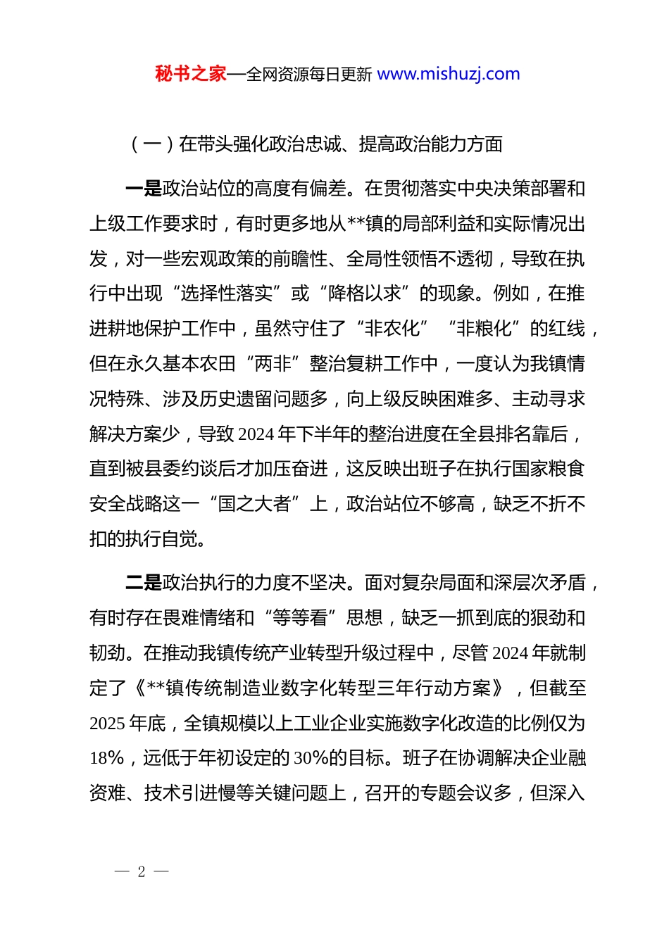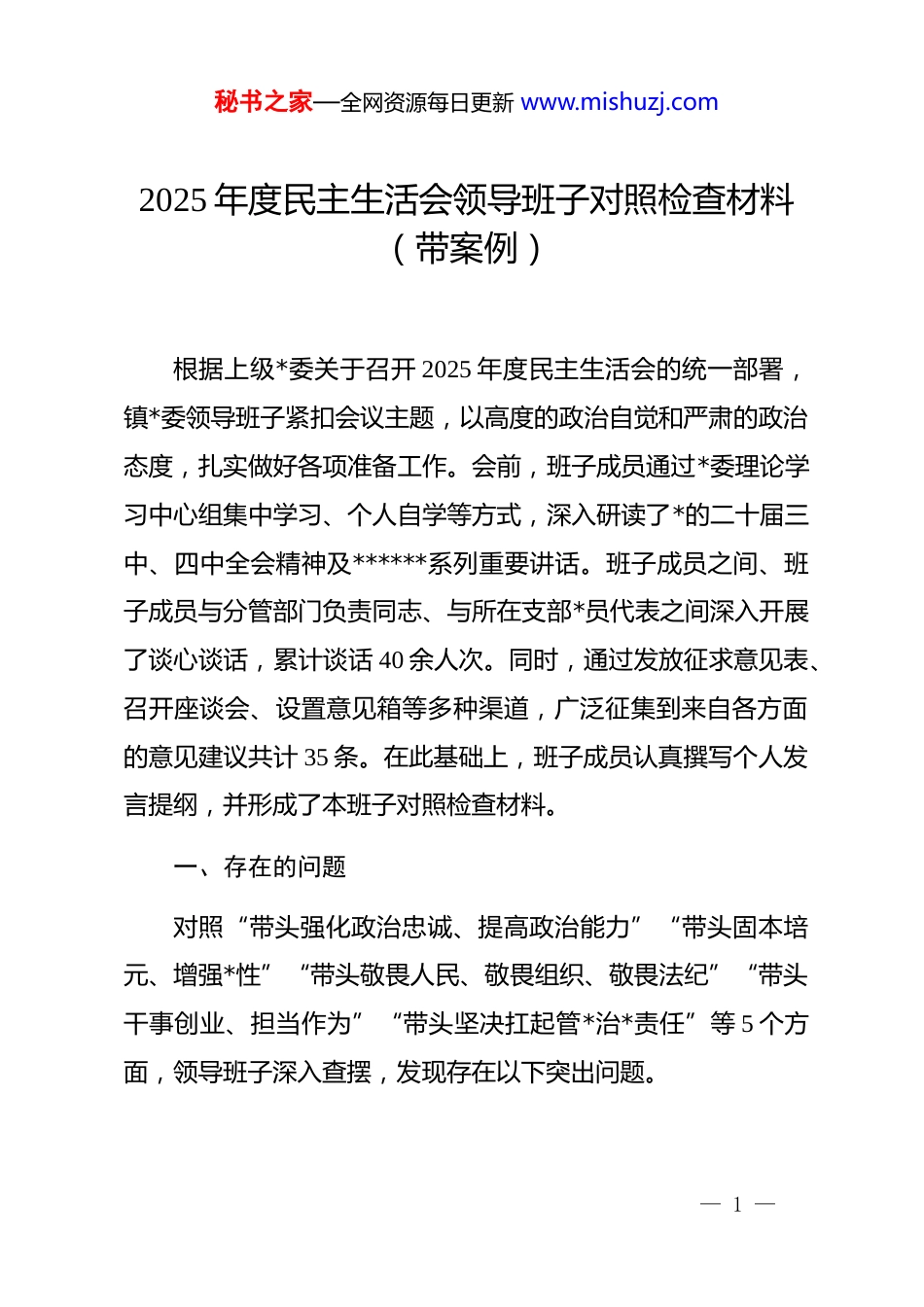 秘书之家—全网资源每日更新 www.mishuzj.com2025 年度民主生活会领导班子对照检查材料(带案例)根据上级*委关于召开 2025 年度民主生活会的统一部署,镇*委领导班子紧扣会议主题,以高度的政治自觉和严肃的政治态度,扎实做好各项准备工作。会前,班子成员通过*委理论学习中心组集中学习、个人自学等方式,深入研读了*的二十届三中、四中全会精神及******系列重要讲话。班子成员之间、班子成员与分管部门负责同志、与所在支部*员代表之间深入开展了谈心谈话,累计谈话 40 余人次。同时,通过发放征求意见表、召开座谈会、设置意见箱等多种渠道,广泛征集到来自各方面的意见建议共计 35 条。在此基础上,班子成员认真撰写个人发言提纲,并形成了本班子对照检查材料。一、存在的问题对照“带头强化政治忠诚、提高政治能力”“带头固本培元、增强*性”“带头敬畏人民、敬畏组织、敬畏法纪”“带头干事创业、担当作为”“带头坚决扛起管*治*责任”等 5 个方面,领导班子深入查摆,发现存在以下突出问题。— 1 —秘书之家—全网资源每日更新 www.mishuzj.com(一)在带头强化政治忠诚、提高政治能力方面一是政治站位的高度有偏差。在贯彻落实中央决策部署和上级工作要求时,有时更多地从**镇的局部利益和实际情况出发,对一些宏观政策的前瞻性、全局性领悟不透彻,导致在执行中出现“选择性落实”或“降格以求”的现象。例如,在推进耕地保护工作中,虽然守住了“非农化”“非粮化”的红线,但在永久基本农田“两非”整治复耕工作中,一度认为我镇情况特殊、涉及历史遗留问题多,向上级反映困难多、主动寻求解决方案少,导致 2024 年下半年的整治进度在全县排名靠后,直到被县委约谈后才加压奋进,这反映出班子在执行国家粮食安全战略这一“国之大者”上,政治站位不够高,缺乏不折不扣的执行自觉。二是政治执行的力度不坚决。面对复杂局面和深层次矛盾,有时存在畏难情绪和“等等看”思想,缺乏一抓到底的狠劲和韧劲。在推动我镇传统产业转型升级过程中,尽管 2024 年就制定了《**镇传统制造业数字化转型三年行动方案》,但截至2025 年底,全镇规模以上工业企业实施数字化改造的比例仅为18%,远低于年初设定的 30%的目标。班子在协调解决企业融资难、技术引进慢等关键问题上,召开的专题会议多,但深入— 2 —秘书之家—全网资源每日更新 www.mishuzj.com企业现场办公、“一企一策”解决实际问题的次数屈指可数,导致政策悬在空中,执行力在“最后一公里”打了折扣。三是政治规矩的尺度不严明。对一些社会上的错误思潮和网络上的不当言论,班子成员有时存在“见怪不怪”的麻痹思想,认为只要自己不信不传就无大碍,缺乏旗帜鲜明进行斗争的勇气和主动性。2025 年上半年,针对网络上出现的个别抹黑我镇营商环境的言论,班子未能第一时间组织力量进行正面引导和有力回击,导致不实信息在一定范围内发酵,对个别招商引资项目造成了负面影响。这暴露出班子在维护意识形态安全、严守政治纪律和政治规矩方面,敏感性不强,斗争精神不足。(二)在带头固本培元、增强*性方面一是理论武装的“深”度不够。对**************思想的学习,存在碎片化、浅表化的问题,满足于读了、学了,但在“钻进去”“悟出来”上功夫下得不深。*委理论学习中心组学习有时存在“以会代学”“以读代学”的现象,2025 年度组织的 12 次中心组学习中,有 8 次是以传达上级文件和领导讲话为主,真正围绕某一专题进行深入研讨、并结合**镇实际提出转化思路的次数偏少。这导致班子成员在运用*的创新理论指导实践、破解发展难题方面的能力存在短板。— 3 —秘书之家—全网资源每日更新 www.mishuzj.com二是*性淬炼的“硬”度不强。在严格的*内政治生活锤炼上有所松懈,自我革命精神有所减弱。民主生活会和组织生活会上,有时存在“闯关”思想,批评与自我批评辣味不足,存在以工作建议代替批评意见、以表态发言代替思想剖析的现象。在 2025 年 7 月召开的一次专题民主生活会上,班子成员相互批评环节,提出的 20 余条意见中,涉及思想根源和*性修养的不足 1/4,大多停留在工作层...