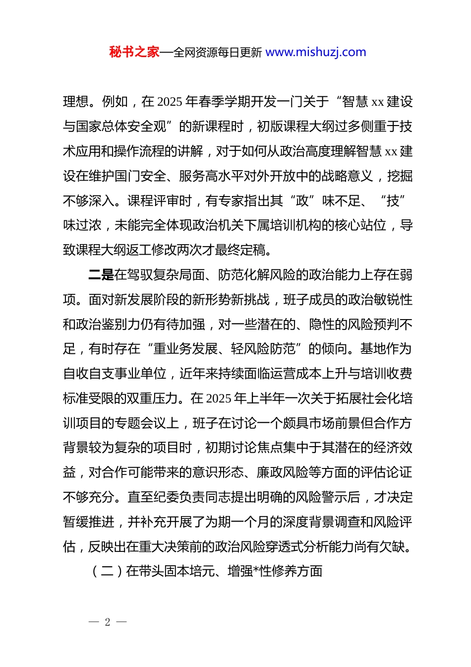 秘书之家—全网资源每日更新 www.mishuzj.comxx 教育培训基地 2025 年度民主生活会班子对照检查材料(带案例)根据总署*组和 xx 市委关于召开 2025 年度民主生活会的统一部署,xx 教育培训基地领导班子紧扣会议主题,在扎实开展会前准备工作的基础上,深入查摆问题、剖析根源、明确整改方向。会前,班子成员通过*委理论学习中心组集中学习研讨 5次,个人自学*的二十届三中、四中全会精神等文件超过 40 小时。班子成员之间、与分管部门负责同志、与所在*支部*员代表之间深入开展谈心谈话 18 人次,通过线上线下渠道广泛征求干部职工意见建议 32 条,为开好此次民主生活会奠定了坚实的思想和工作基础。现将班子对照检查情况报告如下。一、存在的主要问题(一)在带头强化政治忠诚、提高政治能力方面一是在政治理论与业务实践的融通结合上存在温差。班子在推动学习贯彻**************思想上态度坚决,能够严格执行“第一议题”制度,2025 年共组织*委理论学习中心组专题学习 15 次。但在将*的创新理论最新成果,特别是******关于中国式现代化、高质量发展的重要论述,转化为指导基地培训业务创新发展的具体思路和实践成果上,转化效率和效果不够— 1 —秘书之家—全网资源每日更新 www.mishuzj.com理想。例如,在 2025 年春季学期开发一门关于“智慧 xx 建设与国家总体安全观”的新课程时,初版课程大纲过多侧重于技术应用和操作流程的讲解,对于如何从政治高度理解智慧 xx 建设在维护国门安全、服务高水平对外开放中的战略意义,挖掘不够深入。课程评审时,有专家指出其“政”味不足、“技”味过浓,未能完全体现政治机关下属培训机构的核心站位,导致课程大纲返工修改两次才最终定稿。二是在驾驭复杂局面、防范化解风险的政治能力上存在弱项。面对新发展阶段的新形势新挑战,班子成员的政治敏锐性和政治鉴别力仍有待加强,对一些潜在的、隐性的风险预判不足,有时存在“重业务发展、轻风险防范”的倾向。基地作为自收自支事业单位,近年来持续面临运营成本上升与培训收费标准受限的双重压力。在 2025 年上半年一次关于拓展社会化培训项目的专题会议上,班子在讨论一个颇具市场前景但合作方背景较为复杂的项目时,初期讨论焦点集中于其潜在的经济效益,对合作可能带来的意识形态、廉政风险等方面的评估论证不够充分。直至纪委负责同志提出明确的风险警示后,才决定暂缓推进,并补充开展了为期一个月的深度背景调查和风险评估,反映出在重大决策前的政治风险穿透式分析能力尚有欠缺。(二)在带头固本培元、增强*性修养方面— 2 —秘书之家—全网资源每日更新 www.mishuzj.com一是以理论武装淬炼*性的自觉性和主动性不够强。班子成员能够坚持学习,但有时存在“要我学”多于“我要学”的情况,满足于完成规定的学习任务,但在将学习成果内化为坚定纯粹的*性修养、外化为指导工作的强大思想武器方面,功夫下得不深。在*性分析和思想汇报中,引经据典、阐述理论头头是道,但联系个人思想实际、触及灵魂深处的自我剖析不够深刻。2025 年组织的 4 次*支部专题组织生活会上,抽查部分班子成员的发言提纲,发现存在用工作总结代替思想剖析的现象,对个人世界观、人生观、价值观这个“总开关”问题的检视,未能做到常掸思想尘、常破“心中贼”。二是以*规 dj 砥砺*性的敬畏心和戒惧心不够牢。班子对*章*规 dj 的学习是严肃的,但在日常工作和生活中,对一些纪律规矩的“细枝末节”重视不够,未能时时刻刻以最高标准、最严要求检身正己。例如,在执行*员干部“八小时之外”监督管理方面,更多的是进行原则性要求和口头提醒,缺乏具体有效的抓手和机制。2025 年第三季度,基地一名青年干部因在社交媒体发布涉及单位工作场景的不当言论,造成了小范围的负面影响。事件发生后,班子才意识到在规范干部网络言行、加强日常监督提醒方面存在短板,暴露出用纪律标尺严格约束自身和队伍的防线筑得不够严密。— 3 —秘书之家—全网资源每日更新 www.mishuzj.com(三)在带头敬畏人民、敬畏组织、敬畏法纪方面一是践行新时代群众路线、服务基层干部不够彻底...