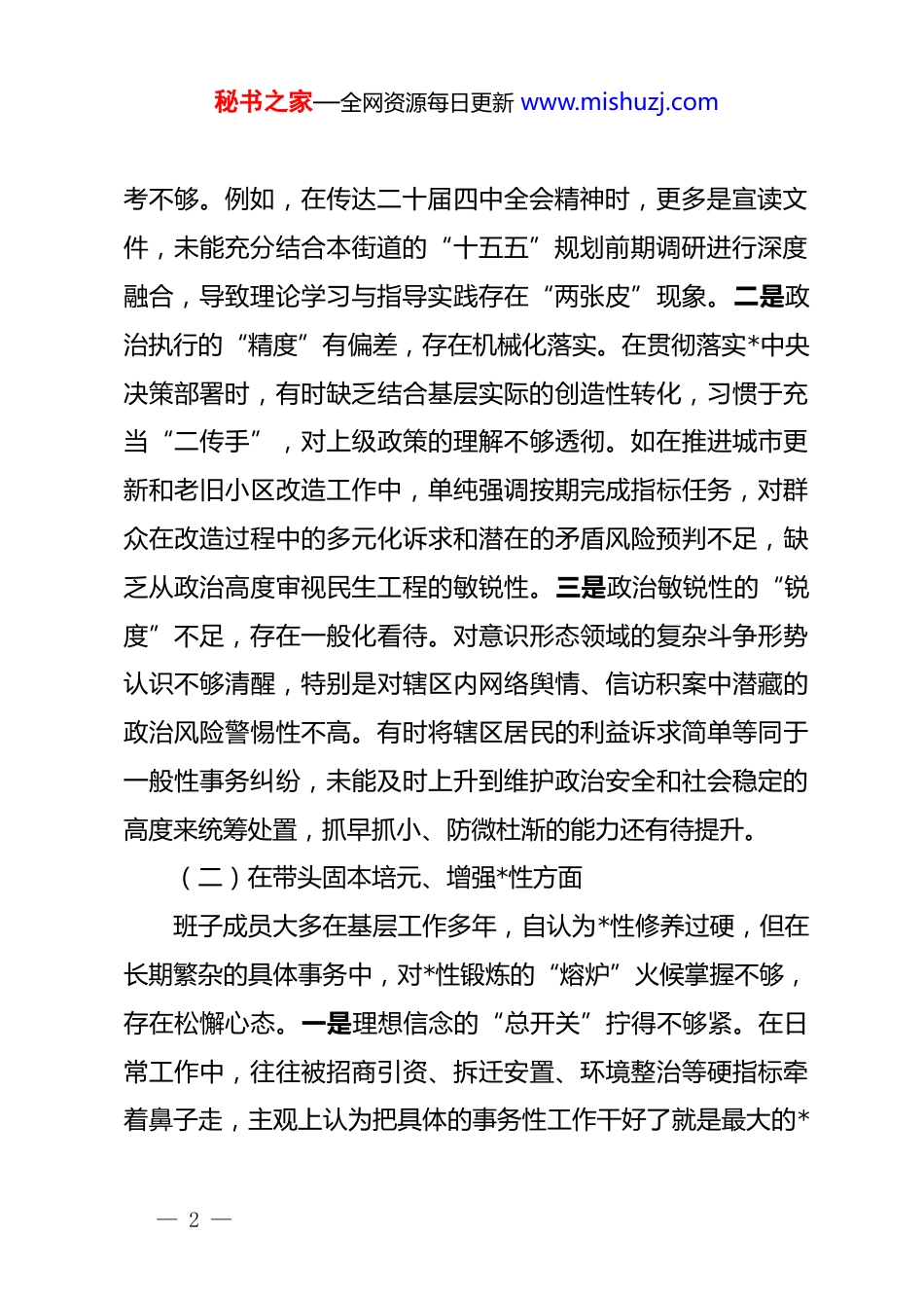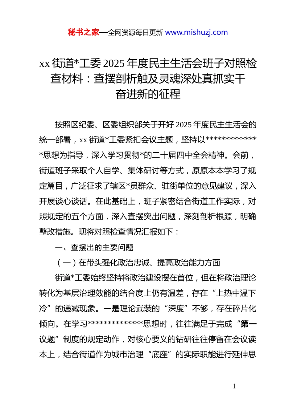 秘书之家—全网资源每日更新 www.mishuzj.comxx 街道*工委 2025 年度民主生活会班子对照检查材料:查摆剖析触及灵魂深处真抓实干奋进新的征程按照区纪委、区委组织部关于开好 2025 年度民主生活会的统一部署,xx 街道*工委紧扣会议主题,坚持以**************思想为指导,深入学习贯彻*的二十届四中全会精神。会前,街道班子采取个人自学、集体研讨等方式,原原本本学习了规定篇目,广泛征求了辖区*员群众、驻街单位的意见建议,深入开展谈心谈话。在此基础上,班子紧密结合街道工作实际,对照规定的五个方面,深入查摆突出问题,深刻剖析根源,明确整改措施。现将对照检查情况汇报如下:一、查摆出的主要问题(一)在带头强化政治忠诚、提高政治能力方面街道*工委始终坚持将政治建设摆在首位,但在将政治理论转化为基层治理效能的结合度上仍有温差,存在“上热中温下冷”的递减现象。一是理论武装的“深度”不够,存在碎片化倾向。在学习**************思想时,往往满足于完成“第一议题”制度的规定动作,对核心要义的钻研往往停留在会议读本上,结合街道作为城市治理“底座”的实际职能进行延伸思— 1 —秘书之家—全网资源每日更新 www.mishuzj.com考不够。例如,在传达二十届四中全会精神时,更多是宣读文件,未能充分结合本街道的“十五五”规划前期调研进行深度融合,导致理论学习与指导实践存在“两张皮”现象。二是政治执行的“精度”有偏差,存在机械化落实。在贯彻落实*中央决策部署时,有时缺乏结合基层实际的创造性转化,习惯于充当“二传手”,对上级政策的理解不够透彻。如在推进城市更新和老旧小区改造工作中,单纯强调按期完成指标任务,对群众在改造过程中的多元化诉求和潜在的矛盾风险预判不足,缺乏从政治高度审视民生工程的敏锐性。三是政治敏锐性的“锐度”不足,存在一般化看待。对意识形态领域的复杂斗争形势认识不够清醒,特别是对辖区内网络舆情、信访积案中潜藏的政治风险警惕性不高。有时将辖区居民的利益诉求简单等同于一般性事务纠纷,未能及时上升到维护政治安全和社会稳定的高度来统筹处置,抓早抓小、防微杜渐的能力还有待提升。(二)在带头固本培元、增强*性方面班子成员大多在基层工作多年,自认为*性修养过硬,但在长期繁杂的具体事务中,对*性锻炼的“熔炉”火候掌握不够,存在松懈心态。一是理想信念的“总开关”拧得不够紧。在日常工作中,往往被招商引资、拆迁安置、环境整治等硬指标牵着鼻子走,主观上认为把具体的事务性工作干好了就是最大的*— 2 —秘书之家—全网资源每日更新 www.mishuzj.com性,不知不觉中放松了对世界观、人生观、价值观的持续改造。在面对复杂的利益诱惑和多元思潮冲击时,对照先辈先进检视自己的频率降低了,精神之钙补充得不及时。二是*内政治生活的“辣味”不够浓。执行双重组织生活制度有时流于形式,以普通*员身份参加所在支部活动时,听汇报多、作指示多,与普通*员开展思想交流少。在班子内部开展批评与自我批评时,有时存在顾虑,怕伤和气、怕丢选票,提意见往往点到为止,多以工作建议代替思想交锋,缺乏“红脸出汗”的勇气和“揭短亮丑”的决心,*内政治生活的政治性、时代性、原则性、战斗性体现不够充分。三是修身律己的“标尺”定得不够高。部分班子成员在八小时之外的自我约束上有所放松,认为只要不触碰纪律红线就行,对生活圈、朋友圈、社交圈的净化不够彻底。在弘扬艰苦奋斗精神方面做得不够,随着生活条件的改善,勤俭节约的意识有所淡化,对于办公经费支出、公务接待等方面,虽然符合规定,但精打细算的意识不如以往强烈。(三)在带头敬畏人民、敬畏组织、敬畏法纪方面街道作为服务群众的“最后一公里”,在践行以人民为中心的发展思想上,与群众的期盼相比还有差距,权力的边界意识和法治思维仍需强化。一是服务群众的“最后一米”尚未完全打通。“四下基层”制度执行不够深入,班子成员下沉社区— 3 —秘书之家—全网资源每日更新 www.mishuzj.com往往是“带着任务去、完成指标回”,针对性地开展蹲点调研、解剖麻雀式调研较少。在处理 12345 热线投诉和网格化管理事件...