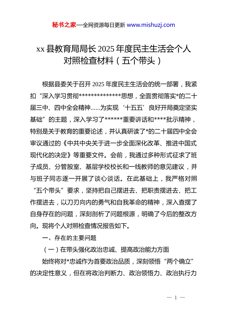秘书之家—全网资源每日更新 www.mishuzj.comxx 县教育局局长 2025 年度民主生活会个人对照检查材料(五个带头)根据县委关于召开 2025 年度民主生活会的统一部署,我紧扣“深入学习贯彻**************思想,全面贯彻落实*的二十届三中、四中全会精神……为实现‘十五五’良好开局奠定坚实基础”的主题,深入学习了******重要讲话和****批示精神,特别是关于教育的重要论述,并认真研读了*的二十届四中全会审议通过的《中共中央关于进一步全面深化改革、推进中国式现代化的决定》等重要文件。会前,我通过多种形式征求了班子成员、分管股室、基层学校校长和一线教师的意见建议,并与班子同志逐一开展了谈心谈话。在此基础上,我严格对照“五个带头”要求,坚持把自己摆进去、把职责摆进去、把工作摆进去,以刀刃向内的勇气和自我革命的精神,深入查摆了自身存在的问题,深刻剖析了问题根源,明确了今后的整改方向。现将个人对照检查情况报告如下。一、存在的主要问题(一)在带头强化政治忠诚、提高政治能力方面始终将对*忠诚作为首要政治品质,深刻领悟“两个确立”的决定性意义,但在将政治判断力、政治领悟力、政治执行力— 1 —秘书之家—全网资源每日更新 www.mishuzj.com落实到推动 xx 县教育高质量发展的具体实践中,仍存在差距。一是领悟上级决策的政治穿透力不深。对*中央的重大决策部署,特别是*的二十届四中全会关于“深化教育综合改革”的系统部署,在学习领悟上存在“温差”。有时满足于通读文件、传达会议精神,但在如何将其蕴含的改革逻辑与我县教育发展的阶段性特征精准结合上,思考不深、谋划不细。比如,在贯彻“健全与人口变化相适应的教育资源配置机制”这一重大要求时,尽管认识到我县城镇化加速、农村学龄人口减少的趋势,但在 2025 年春季学期启动的 xx 新城区第二实验小学建设项目论证中,我更多地是依据现有城区人口密度和就近入学需求进行测算,对于未来五年人口流入的动态变量和农村学校布局优化撤并后可能产生的学位“潮汐效应”预判不足,导致初步方案在远期规划上弹性不够,这反映出我对大政方针的前瞻性、战略性领悟尚未完全转化为具体工作的精准指导。二是执行上级部署的政治敏锐性不强。在推动重大教育政策落地时,存在路径依赖和惯性思维,对政策执行中可能出现的新情况、新问题预见性不强。2025 年,省教育厅下发了关于深化人工智能与教育教学融合应用的指导意见,要求各县区先行先试。我虽然组织了传达学习,但在实际推动中,仍习惯于将重点放在硬件采购上,批准了为全县 15 所中小学更新智慧黑— 2 —秘书之家—全网资源每日更新 www.mishuzj.com板的预算约 800 万元,而用于教师 ai 素养培训和校本课程开发的配套经费仅占总投入的不足 12%。这种重“物”轻“人”、重“建”轻“用”的思路,实质上是对上级“融合应用”核心要求理解不透、执行跑偏的表现,未能从政治上看清技术变革对重塑教育生态的深远影响。三是应对风险挑战的政治定力不稳。面对教育改革深水区的复杂矛盾,有时会产生畏难情绪和求稳心态。去年我县推进义务教育阶段教师“县管校聘”改革,在涉及跨学区调动、骨干教师均衡配置等关键环节时,部分教师因家庭等原因提出异议,甚至有个别教师通过网络平台表达不满情绪。面对阻力,我一度产生了“放缓节奏、减少名额”的想法,担心力度过大会影响教师队伍稳定,没有始终保持攻坚克难的战略定力。虽然最终在县委的坚强领导下稳步推进了改革,但前期的犹豫和摇摆,反映出我在维护改革大局、敢于斗争方面的政治担当仍有欠缺。(二)在带头固本培元、增强*性方面坚持用**************思想凝心铸魂,注重加强*性锻炼,但在理论学习与思想改造的深度融合、知行合一上做得不彻底。一是理论学习的“内化”功夫不扎实。存在“学用脱节”现象,对*的创新理论学习有时停留在“读过了”“学过了”的— 3 —秘书之家—全网资源每日更新 www.mishuzj.com层面,未能完全转化为改造主观世界和指导客观实践的强大思想武器。比如,在 2025 年第四季度的*组理论学习中心组学习中,我们专题学习了******关于作风建设...
