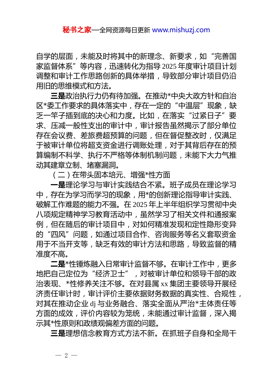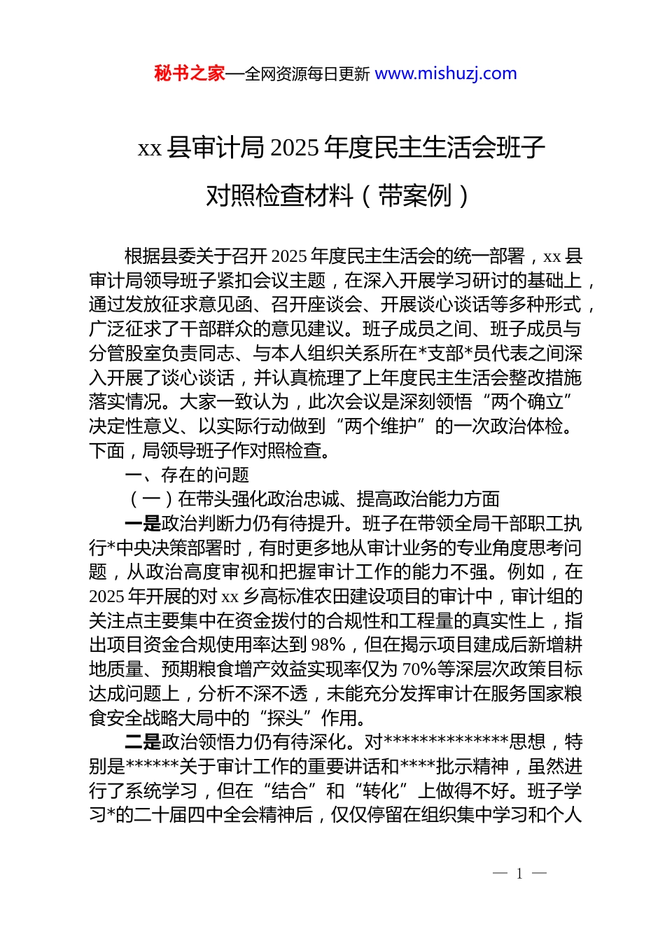 秘书之家—全网资源每日更新 www.mishuzj.comxx 县审计局 2025 年度民主生活会班子对照检查材料(带案例)根据县委关于召开 2025 年度民主生活会的统一部署,xx 县审计局领导班子紧扣会议主题,在深入开展学习研讨的基础上,通过发放征求意见函、召开座谈会、开展谈心谈话等多种形式,广泛征求了干部群众的意见建议。班子成员之间、班子成员与分管股室负责同志、与本人组织关系所在*支部*员代表之间深入开展了谈心谈话,并认真梳理了上年度民主生活会整改措施落实情况。大家一致认为,此次会议是深刻领悟“两个确立”决定性意义、以实际行动做到“两个维护”的一次政治体检。下面,局领导班子作对照检查。一、存在的问题(一)在带头强化政治忠诚、提高政治能力方面一是政治判断力仍有待提升。班子在带领全局干部职工执行*中央决策部署时,有时更多地从审计业务的专业角度思考问题,从政治高度审视和把握审计工作的能力不强。例如,在2025 年开展的对 xx 乡高标准农田建设项目的审计中,审计组的关注点主要集中在资金拨付的合规性和工程量的真实性上,指出项目资金合规使用率达到 98%,但在揭示项目建成后新增耕地质量、预期粮食增产效益实现率仅为 70%等深层次政策目标达成问题上,分析不深不透,未能充分发挥审计在服务国家粮食安全战略大局中的“探头”作用。二是政治领悟力仍有待深化。对**************思想,特别是******关于审计工作的重要讲话和****批示精神,虽然进行了系统学习,但在“结合”和“转化”上做得不好。班子学习*的二十届四中全会精神后,仅仅停留在组织集中学习和个人— 1 —秘书之家—全网资源每日更新 www.mishuzj.com自学的层面,未能及时将其中的新理念、新要求,如“完善国家监督体系”等内容,迅速转化为指导 2025 年度审计项目计划调整和审计工作思路创新的具体举措,导致部分审计项目仍沿用旧的思维模式和方法。三是政治执行力仍有待加强。在推动*中央大政方针和自治区*委工作要求的具体落实中,存在一定的“中温层”现象,缺乏一竿子插到底的决心和力度。比如,在落实“过紧日子”要求、压减一般性支出的审计中,审计报告虽然揭示了部分单位存在会议费、差旅费超预算的问题,但在督促整改时,仅满足于被审计单位将超支资金进行调账处理,对于其背后存在的预算编制不科学、执行不严格等体制机制问题,未能下大力气推动其建章立制、堵塞漏洞。(二)在带头固本培元、增强*性方面一是理论学习与审计实践结合不紧。班子成员在理论学习中,存在为学习而学习的现象,用*的创新理论指导审计实践、破解工作难题的能力不强。在 2025 年上半年组织学习贯彻中央八项规定精神学习教育活动中,虽然学习了相关文件和通报案例,但在随后的审计项目中,对如何精准发现和定性隐形变异的“四风”问题,如通过项目合作、咨询服务等名义套取资金用于不当开支等,缺乏有效的审计方法和思路,导致监督的精准度不高。二是*性锤炼融入日常审计监督不够。在审计工作中,更多地把自己定位为“经济卫士”,对被审计单位和领导干部的政治表现、*性修养关注不够。在对县属 xx 集团主要领导开展经济责任审计时,审计评价主要依据财务数据的真实性、合规性,对其在推动企业 dj 与业务融合、落实全面从严治*主体责任等方面的成效,评价内容较为笼统,未能通过审计监督,深入揭示其*性原则和政绩观偏差方面的问题。三是理想信念教育方式方法不新。在抓班子自身和全局干— 2 —秘书之家—全网资源每日更新 www.mishuzj.com部的思想政治建设时,主要依赖于“三会一课”、主题*日等传统模式,方式较为单一,吸引力和感染力不强。例如,对年轻审计干部的思想动态掌握不及时,未能结合审计人员长期出差在外、工作压力大的特点,创新开展有针对性的思想政治工作,导致少数年轻干部存在职业倦怠情绪,攻坚克难的精气神有所减弱。(三)在带头敬畏人民、敬畏组织、敬畏法纪方面一是服务群众的宗旨意识树得不牢。在审计工作中,未能始终将维护人民群众的根本利益作为出发点和落脚点。在 2025年实施的保障性安居工程专项资金审计中,审计工作虽然核查了数亿元资金的...