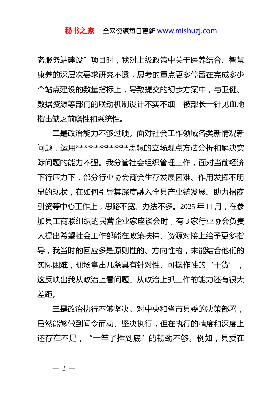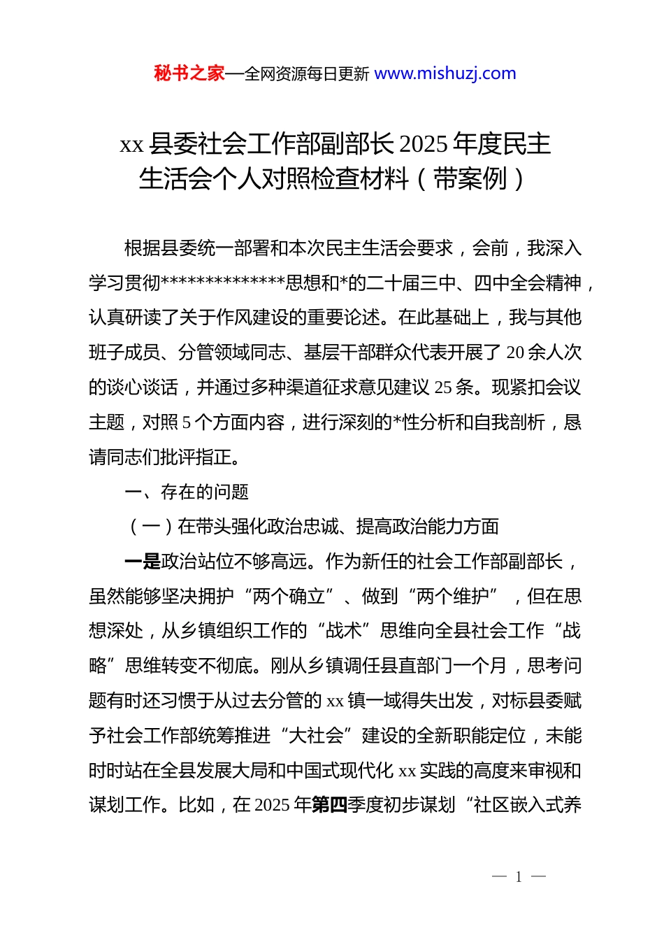 秘书之家—全网资源每日更新 www.mishuzj.comxx 县委社会工作部副部长 2025 年度民主生活会个人对照检查材料(带案例)根据县委统一部署和本次民主生活会要求,会前,我深入学习贯彻**************思想和*的二十届三中、四中全会精神,认真研读了关于作风建设的重要论述。在此基础上,我与其他班子成员、分管领域同志、基层干部群众代表开展了 20 余人次的谈心谈话,并通过多种渠道征求意见建议 25 条。现紧扣会议主题,对照 5 个方面内容,进行深刻的*性分析和自我剖析,恳请同志们批评指正。一、存在的问题(一)在带头强化政治忠诚、提高政治能力方面一是政治站位不够高远。作为新任的社会工作部副部长,虽然能够坚决拥护“两个确立”、做到“两个维护”,但在思想深处,从乡镇组织工作的“战术”思维向全县社会工作“战略”思维转变不彻底。刚从乡镇调任县直部门一个月,思考问题有时还习惯于从过去分管的 xx 镇一域得失出发,对标县委赋予社会工作部统筹推进“大社会”建设的全新职能定位,未能时时站在全县发展大局和中国式现代化 xx 实践的高度来审视和谋划工作。比如,在 2025 年第四季度初步谋划“社区嵌入式养— 1 —秘书之家—全网资源每日更新 www.mishuzj.com老服务站建设”项目时,我对上级政策中关于医养结合、智慧康养的深层次要求研究不透,思考的重点更多停留在完成多少个站点建设的数量指标上,导致提交的初步方案中,与卫健、数据资源等部门的联动机制设计不实不细,被部长一针见血地指出缺乏前瞻性和系统性。二是政治能力不够过硬。面对社会工作领域各类新情况新问题,运用**************思想的立场观点方法分析和解决实际问题的能力不强。我分管社会组织管理工作,面对当前经济下行压力下,部分行业协会商会生存发展困难、作用发挥不明显的现状,在如何引导其深度融入全县产业链发展、助力招商引资等中心工作上,思路不宽、办法不多。2025 年 11 月,在参加县工商联组织的民营企业家座谈会时,有 3 家行业协会负责人提出希望社会工作部能在政策扶持、资源对接上给予更多指导,我当时的回应多是原则性的、方向性的,未能结合他们的实际困难,现场拿出几条具有针对性、可操作性的“干货”,这反映出我从政治上看问题、从政治上抓工作的能力还有很大差距。三是政治执行不够坚决。对中央和省市县委的决策部署,虽然能够做到闻令而动、坚决执行,但在执行的精度和深度上还存在不足,“一竿子插到底”的韧劲不够。例如,县委在— 2 —秘书之家—全网资源每日更新 www.mishuzj.com2025 年下半年明确要求,要推动社会组织 dj 与“产业链 dj”深度融合,我虽然组织召开了推进会,也下发了指导文件,但在后续的跟踪问效上投入精力不足。截至 2025 年底,全县 12 个重点产业链中,仅有 4 个产业链上的社会组织建立了功能型*支部,进度明显滞后于县委要求。究其原因,是我在推进过程中,对部分行业主管部门存在的“业务归业务、dj 归 dj”的模糊认识,没有及时进行有力的政治引导和督促纠偏,存在“上热中温下冷”的现象。(二)在带头固本培元、增强*性方面一是理论武装缺乏穿透力。对**************思想的学习,系统性和深刻性不足,存在“知其然、不知其所以然”的情况。特别是对*的二十届四中全会提出的关于完善社会治理体系、健全基层*组织领导的基层群众自治机制等一系列新思想新论断,满足于通读会议公报和新闻报道,未能沉下心来系统研读辅导材料和权威解读文章,导致在实际工作中理解不深、把握不准。2025 年 12 月,在指导 xx 街道探索“dj 引领、五社联动”社区治理新模式时,我对“社会力量”在其中的功能定位和边界把握不清晰,提出的初步构想依然是“社区主导、社工执行”的传统路径,未能真正体现“多元共治”的精髓。二是*性锤炼缺乏淬炼度。在严肃的*内政治生活中锤炼*性— 3 —秘书之家—全网资源每日更新 www.mishuzj.com的自觉性不强,有时满足于“按部就班”完成规定动作,自我革命的锐气有所消减。回想在乡镇任组织委员时,处理 xx 村发展*员争议问题,虽然最终严格按照程序,对不符合条件的预...
