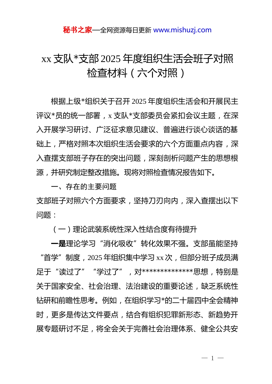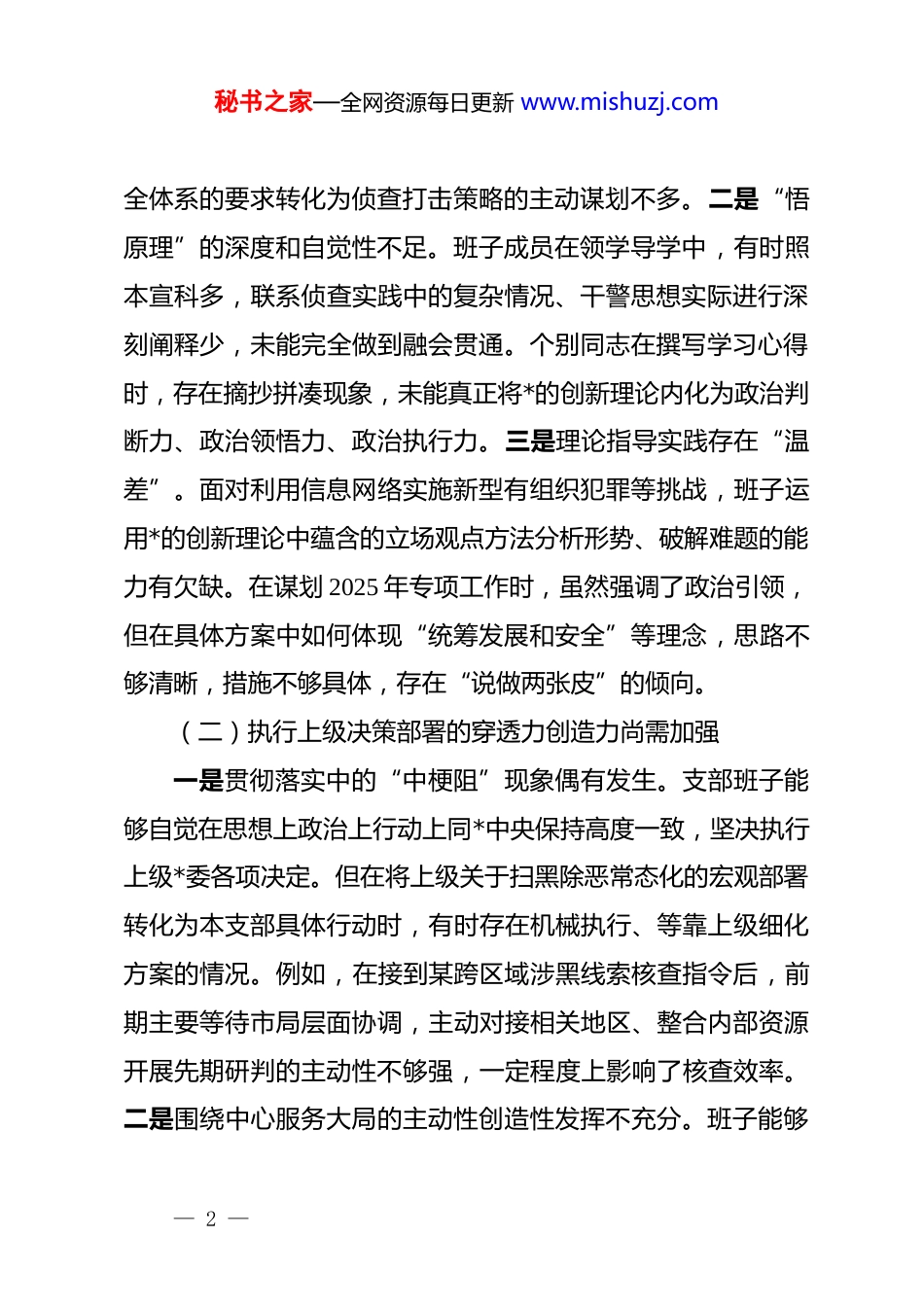 秘书之家—全网资源每日更新 www.mishuzj.comxx 支队*支部 2025 年度组织生活会班子对照检查材料(六个对照)根据上级*组织关于召开 2025 年度组织生活会和开展民主评议*员的统一部署,x 支队*支部委员会紧扣会议主题,在深入开展学习研讨、广泛征求意见建议、普遍进行谈心谈话的基础上,严格对照本次组织生活会要求的六个方面重点内容,深入查摆支部班子存在的突出问题,深刻剖析问题产生的思想根源,并研究制定整改措施。现将对照检查情况报告如下。一、存在的主要问题支部班子对照六个方面要求,坚持刀刃向内,深入查摆出以下问题:(一)理论武装系统性深入性结合度有待提升一是理论学习“消化吸收”转化效果不强。支部虽能坚持“首学”制度,2025 年组织集中学习 xx 次,但部分班子成员满足于“读过了”“学过了”,对**************思想,特别是关于国家安全、社会治理、法治建设的重要论述,缺乏系统性钻研和前瞻性思考。例如,在组织学习*的二十届四中全会精神时,更多是传达文件要点,结合有组织犯罪新形态、新趋势开展专题研讨不足,将全会关于完善社会治理体系、健全公共安— 1 —秘书之家—全网资源每日更新 www.mishuzj.com全体系的要求转化为侦查打击策略的主动谋划不多。二是“悟原理”的深度和自觉性不足。班子成员在领学导学中,有时照本宣科多,联系侦查实践中的复杂情况、干警思想实际进行深刻阐释少,未能完全做到融会贯通。个别同志在撰写学习心得时,存在摘抄拼凑现象,未能真正将*的创新理论内化为政治判断力、政治领悟力、政治执行力。三是理论指导实践存在“温差”。面对利用信息网络实施新型有组织犯罪等挑战,班子运用*的创新理论中蕴含的立场观点方法分析形势、破解难题的能力有欠缺。在谋划 2025 年专项工作时,虽然强调了政治引领,但在具体方案中如何体现“统筹发展和安全”等理念,思路不够清晰,措施不够具体,存在“说做两张皮”的倾向。(二)执行上级决策部署的穿透力创造力尚需加强一是贯彻落实中的“中梗阻”现象偶有发生。支部班子能够自觉在思想上政治上行动上同*中央保持高度一致,坚决执行上级*委各项决定。但在将上级关于扫黑除恶常态化的宏观部署转化为本支部具体行动时,有时存在机械执行、等靠上级细化方案的情况。例如,在接到某跨区域涉黑线索核查指令后,前期主要等待市局层面协调,主动对接相关地区、整合内部资源开展先期研判的主动性不够强,一定程度上影响了核查效率。二是围绕中心服务大局的主动性创造性发挥不充分。班子能够— 2 —秘书之家—全网资源每日更新 www.mishuzj.com认识到有组织犯罪侦查工作服务全市安全稳定大局的重要性,但在如何“更好发挥 xx‘三大功能’‘四大作用’”方面,结合支部实际思考不深、落地不实。例如,在推动扫黑除恶与行业领域整治深度融合上,满足于完成移送“三书一函”的数量指标,对后续整改效果的跟踪问效、推动建立长效机制方面,支部层面的协调推动力度不足,*员的积极性创造性未得到充分调动。三是重大事项请示报告规范性有瑕疵。班子成员能够做到对*忠诚老实,但在执行请示报告制度上,有时存在“怕麻烦”心理或认为“业务工作为主”。去年第三季度,支部一名委员因紧急跨省办案,行程变更未能第一时间按程序向支部和上级口头报备,仅事后补了手续,反映出制度执行不够严格规范。(三)组织生活的政治性时代性战斗性锤炼不足一是“三会一课”内容形式创新不够吸引力下降。2025 年支部按规定召开*员大会 x 次、支委会 xx 次、*小组会 xx 次,讲授*课 x 次,但部分活动存在“程式化”问题。主题*日有时与业务工作简单捆绑,去 xx 社区开展普法宣传后,未能及时组织*员结合群众反映的涉黑涉恶苗头性问题进行深入讨论,活动“*味”不浓,教育功能弱化。二是批评与自我批评“辣味”不足。在支部组织生活会上,班子查摆问题有时避重就轻,用工作问题代替思想问题。相互批评多以“希望”“建议”开头,— 3 —秘书之家—全网资源每日更新 www.mishuzj.com诸如“在督办某涉恶团伙案时,存在求稳怕错思想,导致侦查节奏偏慢”等直指要害的批评较少,“红...