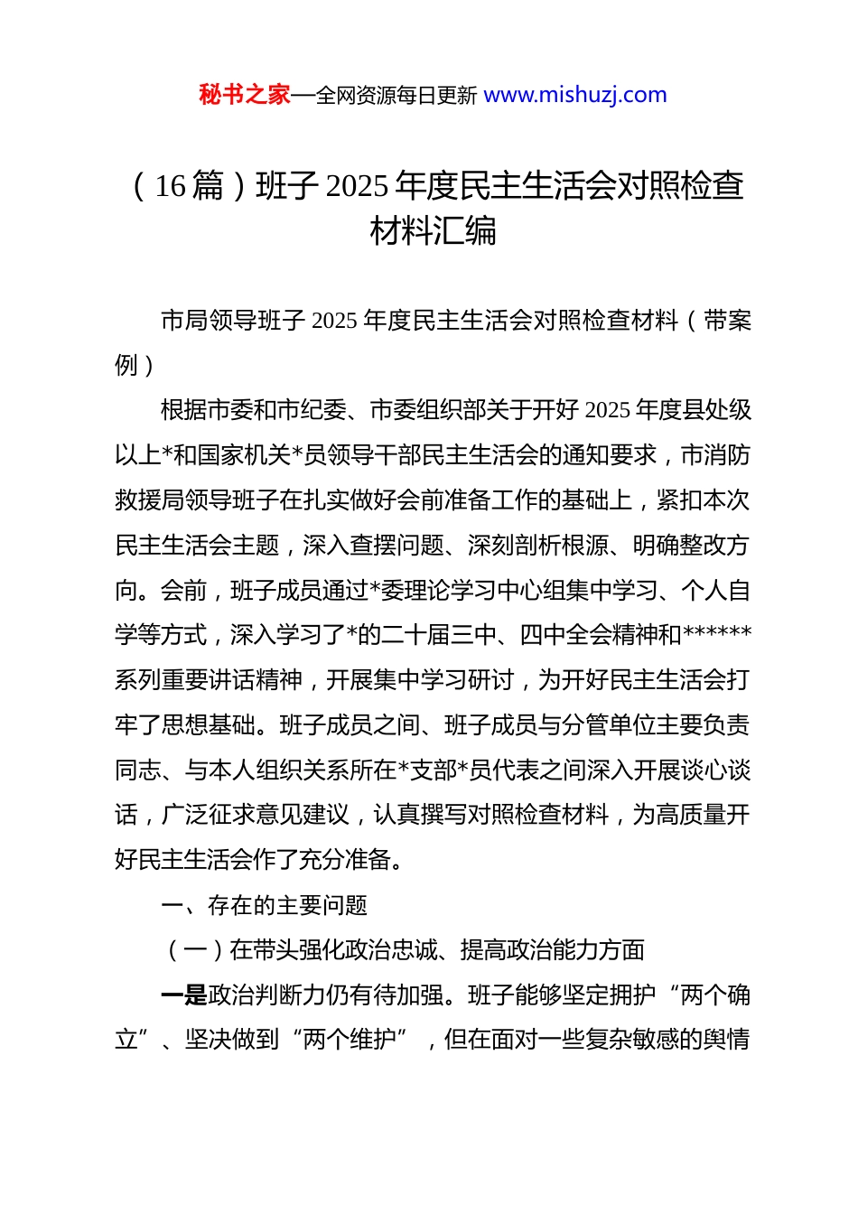 秘书之家—全网资源每日更新 www.mishuzj.com(16 篇)班子 2025 年度民主生活会对照检查材料汇编市局领导班子 2025 年度民主生活会对照检查材料(带案例)根据市委和市纪委、市委组织部关于开好 2025 年度县处级以上*和国家机关*员领导干部民主生活会的通知要求,市消防救援局领导班子在扎实做好会前准备工作的基础上,紧扣本次民主生活会主题,深入查摆问题、深刻剖析根源、明确整改方向。会前,班子成员通过*委理论学习中心组集中学习、个人自学等方式,深入学习了*的二十届三中、四中全会精神和******系列重要讲话精神,开展集中学习研讨,为开好民主生活会打牢了思想基础。班子成员之间、班子成员与分管单位主要负责同志、与本人组织关系所在*支部*员代表之间深入开展谈心谈话,广泛征求意见建议,认真撰写对照检查材料,为高质量开好民主生活会作了充分准备。一、存在的主要问题(一)在带头强化政治忠诚、提高政治能力方面一是政治判断力仍有待加强。班子能够坚定拥护“两个确立”、坚决做到“两个维护”,但在面对一些复杂敏感的舆情秘书之家—全网资源每日更新 www.mishuzj.com事件时,政治判断力不够敏锐。例如,在 2025 年第三季度发生的一起因老旧小区电动自行车充电引发的火灾事故中,初期通过官方新媒体发布灾情通报时,对事故背后涉及的城市治理难题和社会群众的焦虑情绪预判不足,导致后续舆论应对一度陷入被动,反映出班子在从政治高度观察、分析和处理问题上还存在差距。二是政治领悟力不够深入。对******关于应急管理和消防救援工作重要论述的学习,有时停留在领会原文、掌握要义层面,但在如何将其系统性地、创造性地转化为推动市消防事业高质量发展的具体思路和战略举措上,思考和谋划的深度不够。班子在制定“十五五”消防救援事业发展规划时,虽然总体框架符合上级要求,但在如何结合市产业结构调整和城市空间布局优化,前瞻性地布局消防站点和力量体系方面,创新性、突破性的思考不多,领悟上级战略意图并与地方实际紧密结合的能力不强。三是政治执行力存在温差。对中央和自治区*委的决策部署,班子始终不折不扣执行,但在推动政策要求直达基层、末端见效的过程中,存在力度层层递减的现象。例如,在推行数字化预警平台建设工作中,局*委层面多次会议强调其重要性,但由于对基层单位在技术应用、人员培训和设备兼容性等方面的实秘书之家—全网资源每日更新 www.mishuzj.com际困难调研不深,导致部分基层大队在实际执行中进度滞后,反映出抓落实的穿透力不强,政治执行的全过程闭环管理不彻底。(二)在带头固本培元、增强*性方面一是理论武装的转化效果不好。班子成员能够坚持读原著、学原文、悟原理,但将学习成果内化为坚定理想信念、外化为指导实践行动的转化链条不顺畅。在 2025 年组织的 12 次*委理论学习中心组学习中,有几次的研讨交流环节变成了简单的工作汇报,未能真正围绕理论学习进行思想碰撞和*性淬炼。这说明在运用*的创新理论改造主观世界、解决“总开关”问题上,下的功夫还不够扎实。二是*性修养的日常锤炼不严。在严肃的*内政治生活中能够严格要求自己,但在日常工作和生活中,对*性修养的自我要求有所放松。个别班子成员习惯于在办公室听取汇报、电话遥控指挥,而不是第一时间深入火场、深入基层一线与指战员共同战斗。这种工作习惯的背后,反映出对“我是谁、为了谁、依靠谁”的根本性问题思考不深,共产*人艰苦奋斗的精神底色有所褪化。三是红色基因的传承弘扬不力。对消防救援队伍红色基因和优良传统的挖掘、宣传和弘扬力度不够。虽然也组织参观红秘书之家—全网资源每日更新 www.mishuzj.com色教育基地、学习英模事迹,但形式较为单一,未能将其与新时代消防救援队伍的职责使命进行深度融合。例如,在队伍内部开展的“队史荣誉”教育活动中,满足于讲述历史、展示荣誉,但在如何激励年轻指战员在新征程上续写辉煌、再创佳绩方面,缺乏触及灵魂的引导和感召,导致部分年轻干部精神状态出现钝化迹象。(三)在带头敬畏人民、敬畏组织、敬畏法纪方面一是服务群众的宗旨意识不牢。践行新时代*的群众路线,落实“四下...