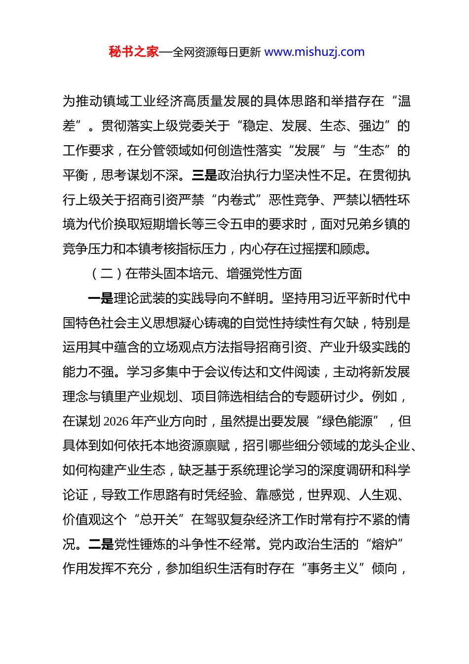 秘书之家—全网资源每日更新 www.mishuzj.com副镇长 2025 年度民主生活会个人对照检查材料 根据本次民主生活会主题要求,会前,本人深入学习了习近平新时代中国特色社会主义思想、党的二十届三中、四中全会精神以及习近平总书记关于作风建设的重要论述,认真研读了党章党规党纪和中央八项规定及其实施细则精神。在此基础上,紧密结合分管招商引资、工业经济的工作实际,与班子成员、分管部门负责同志、基层企业代表开展了谈心谈话,广泛征求意见建议。严格对照“五个带头”要求,把自己摆进去、把职责摆进去、把工作摆进去,进行了深刻的自我剖析和反思。现将个人对照检查情况报告如下。一、对照“五个带头”查摆存在的突出问题(一)在带头强化政治忠诚、提高政治能力方面一是政治判断力穿透性不强。对复杂经济形势的政治本质洞察不够敏锐,有时就经济谈经济、就项目谈项目,未能时时处处从维护国家产业安全、经济安全的政治高度审视招商引资和工业布局。二是政治领悟力转化度不高。对党的二十届四中全会关于“构建高水平社会主义市场经济体制”、“推进新型工业化”等战略部署的学习领会,有时停留在概念层面,转化秘书之家—全网资源每日更新 www.mishuzj.com为推动镇域工业经济高质量发展的具体思路和举措存在“温差”。贯彻落实上级党委关于“稳定、发展、生态、强边”的工作要求,在分管领域如何创造性落实“发展”与“生态”的平衡,思考谋划不深。三是政治执行力坚决性不足。在贯彻执行上级关于招商引资严禁“内卷式”恶性竞争、严禁以牺牲环境为代价换取短期增长等三令五申的要求时,面对兄弟乡镇的竞争压力和本镇考核指标压力,内心存在过摇摆和顾虑。(二)在带头固本培元、增强党性方面一是理论武装的实践导向不鲜明。坚持用习近平新时代中国特色社会主义思想凝心铸魂的自觉性持续性有欠缺,特别是运用其中蕴含的立场观点方法指导招商引资、产业升级实践的能力不强。学习多集中于会议传达和文件阅读,主动将新发展理念与镇里产业规划、项目筛选相结合的专题研讨少。例如,在谋划 2026 年产业方向时,虽然提出要发展“绿色能源”,但具体到如何依托本地资源禀赋,招引哪些细分领域的龙头企业、如何构建产业生态,缺乏基于系统理论学习的深度调研和科学论证,导致工作思路有时凭经验、靠感觉,世界观、人生观、价值观这个“总开关”在驾驭复杂经济工作时常有拧不紧的情况。二是党性锤炼的斗争性不经常。党内政治生活的“熔炉”作用发挥不充分,参加组织生活有时存在“事务主义”倾向,秘书之家—全网资源每日更新 www.mishuzj.com将工作汇报等同于思想汇报。在批评与自我批评中,对分管领域招商引资数据可能存在的“水分”、项目落地中的形式主义苗头等问题,自我揭短亮丑的勇气不足,对同志间存在的类似倾向,也多以提醒代替批评,怕影响团结、怕挫伤积极性,“修身律己”的标准在人情世故面前有所软化。三是理想信念的实践检验不扎实。对“铸牢对党忠诚”的理解,有时简单化为完成上级交办的任务,未能完全体现在为镇域经济长远发展计、为人民群众根本利益谋的每一件具体工作中。面对招商工作中接触的企业家群体,有时欣赏其市场开拓能力,但在自觉抵制其可能带来的拜金主义、功利主义思想侵蚀方面,警惕性不高,艰苦奋斗、清正廉洁的精神追求在潜移默化中受到挑战。(三)在带头敬畏人民、敬畏组织、敬畏法纪方面一是践行群众路线存在“机关化”倾向。虽然经常下企业调研,但“走马观花”式调研多,“解剖麻雀”式调研少2025 年走访规上企业**家次,但大多是与企业管理层座谈,深入车间一线与工人交流、听取他们对安全生产、技能培训的真实需求不足。在解决企业反映的“用工难”问题上,主要依赖组织几场招聘会,对如何系统性构建技能人才培育和引进长效机制,缺乏来自基层的、扎实的调研支撑,导致措施针对性不强,服务效能与企业的期盼有差距。二是执行民主集中制存在秘书之家—全网资源每日更新 www.mishuzj.com“惯性思维”。在政府班子会议研究重大招商政策、工业项目安排时,对自己分管领域的工作,有时会不自觉地先入为主,认为情况熟、专业强,在讨...