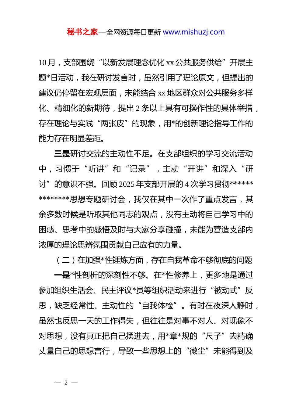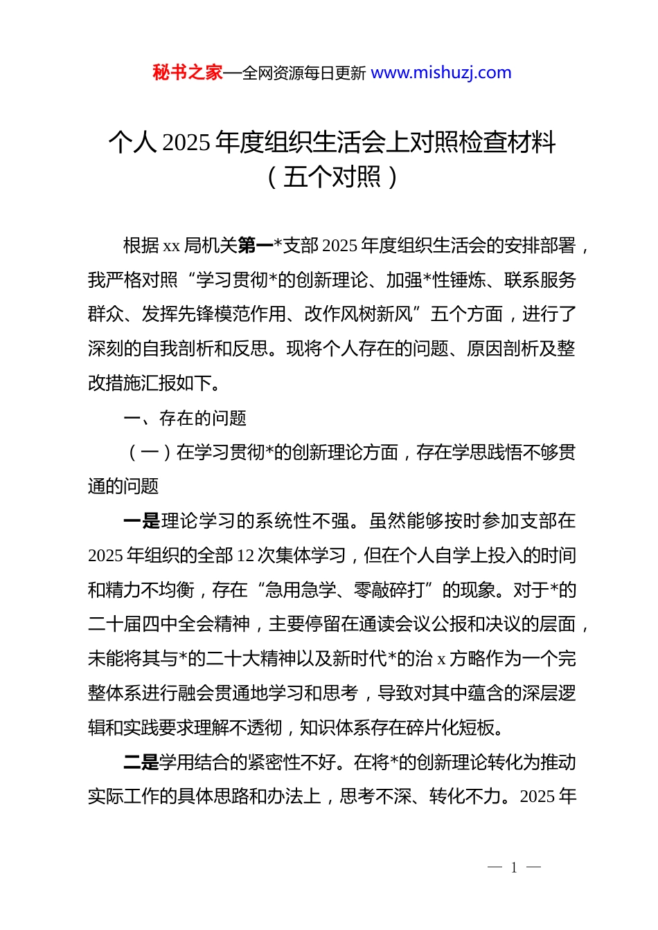 秘书之家—全网资源每日更新 www.mishuzj.com个人 2025 年度组织生活会上对照检查材料(五个对照)根据 xx 局机关第一*支部 2025 年度组织生活会的安排部署,我严格对照“学习贯彻*的创新理论、加强*性锤炼、联系服务群众、发挥先锋模范作用、改作风树新风”五个方面,进行了深刻的自我剖析和反思。现将个人存在的问题、原因剖析及整改措施汇报如下。一、存在的问题(一)在学习贯彻*的创新理论方面,存在学思践悟不够贯通的问题一是理论学习的系统性不强。虽然能够按时参加支部在2025 年组织的全部 12 次集体学习,但在个人自学上投入的时间和精力不均衡,存在“急用急学、零敲碎打”的现象。对于*的二十届四中全会精神,主要停留在通读会议公报和决议的层面,未能将其与*的二十大精神以及新时代*的治 x 方略作为一个完整体系进行融会贯通地学习和思考,导致对其中蕴含的深层逻辑和实践要求理解不透彻,知识体系存在碎片化短板。二是学用结合的紧密性不好。在将*的创新理论转化为推动实际工作的具体思路和办法上,思考不深、转化不力。2025 年— 1 —秘书之家—全网资源每日更新 www.mishuzj.com10 月,支部围绕“以新发展理念优化 xx 公共服务供给”开展主题*日活动,我在研讨发言时,虽然引用了理论原文,但提出的建议仍停留在宏观层面,未能结合 xx 地区群众对公共服务多样化、精细化的新期待,提出 2 条以上具有可操作性的具体举措,存在理论与实践“两张皮”的现象,用*的创新理论指导工作的能力存在明显差距。三是研讨交流的主动性不足。在支部组织的学习交流活动中,习惯于“听讲”和“记录”,主动“开讲”和深入“研讨”的意识不强。回顾 2025 年支部开展的 4 次学习贯彻**************思想专题研讨会,我仅在其中一次作了重点发言,其余多数时候是听取其他同志的观点,没有主动将自己学习中的困惑、思考中的感悟及时与大家分享碰撞,未能为营造支部内浓厚的理论思辨氛围贡献自己应有的力量。(二)在加强*性锤炼方面,存在自我革命不够彻底的问题一是*性剖析的深刻性不够。在*性修养上,更多地是通过参加组织生活会、民主评议*员等组织活动来进行“被动式”反思,缺乏经常性、主动性的“自我体检”。有时在夜深人静时,虽然也反思一天的工作得失,但往往是对事不对人、对现象不对思想,没有真正把自己摆进去,用*章*规的“尺子”去精确丈量自己的思想言行,导致一些思想上的“微尘”未能得到及— 2 —秘书之家—全网资源每日更新 www.mishuzj.com时清扫,自我净化、自我完善的能力锤炼不扎实。二是政治警觉的敏锐性不高。在大是大非问题上虽然能够做到旗帜鲜明、立场坚定,但在日常工作生活中,对一些错误的思想苗头和模糊认识,缺乏足够的政治敏锐性和斗争精神。例如,在一次与同事的非正式交流中,有同志对维护民族团结的某些具体政策表述不准确,我当时虽然感觉不妥,但考虑到并非正式场合,便没有当即予以纠正和引导,而是选择了沉默,这实质上是在大是大非问题上的一种“失声”,反映出自己坚决反对分裂、维护团结的政治警觉性还没有内化为行动自觉。三是纪律约束的严格性不足。能够严格遵守*的政治纪律和政治规矩,但在一些工作纪律和生活细节上,对自己的要求有所放松。2025 年 7 月,支部组织赴 xx 社区开展周末志愿服务活动,我因处理个人事务,迟到了近 10 分钟。虽然事后向组织委员作了解释,但这件事情反映出我内心深处“守时守纪”的弦绷得不紧,没有将遵守*组织的一切安排视作铁的纪律,未能时时刻刻以最高标准要求自己,在纪律面前存在“小事无妨”的错误认识。(三)在联系服务群众方面,存在为民情怀不够深厚的问题一是深入基层的扎实性不够。作为支部“*员联系户”制度— 3 —秘书之家—全网资源每日更新 www.mishuzj.com的一员,虽然在 2025 年完成了对所联系的 xx 社区 3 户家庭的 4次走访任务,但服务群众的作风不扎实。多数时候是“带着任务去、完成任务回”,询问生活情况多,倾听思想困惑少;记录表面问题多,深挖根源症结少。例如,联系户张大爷反映小区健身器材老化问题,我只是简单地将问题...