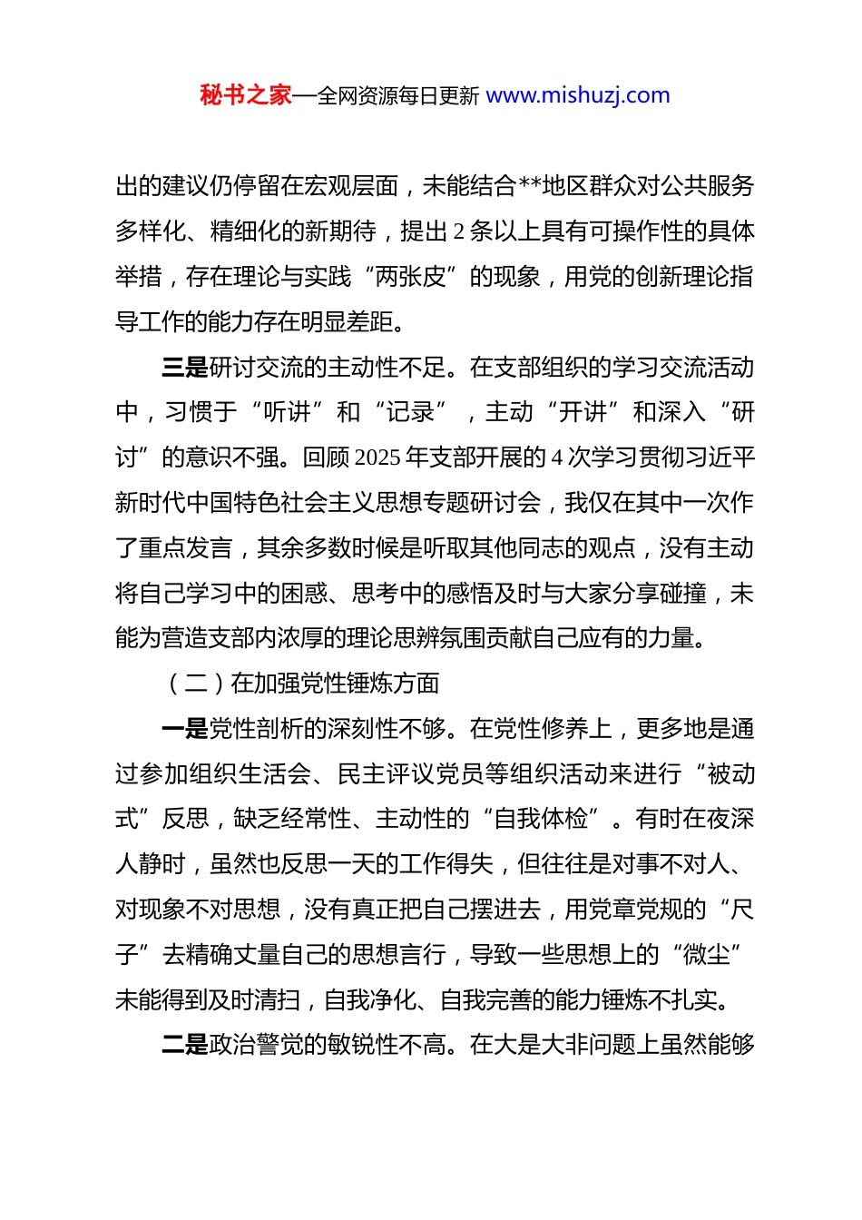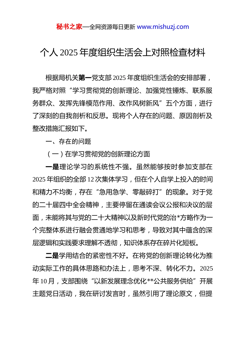 秘书之家—全网资源每日更新 www.mishuzj.com个人 2025 年度组织生活会上对照检查材料 根据局机关第一党支部 2025 年度组织生活会的安排部署,我严格对照“学习贯彻党的创新理论、加强党性锤炼、联系服务群众、发挥先锋模范作用、改作风树新风”五个方面,进行了深刻的自我剖析和反思。现将个人存在的问题、原因剖析及整改措施汇报如下。一、存在的问题(一)在学习贯彻党的创新理论方面一是理论学习的系统性不强。虽然能够按时参加支部在2025 年组织的全部 12 次集体学习,但在个人自学上投入的时间和精力不均衡,存在“急用急学、零敲碎打”的现象。对于党的二十届四中全会精神,主要停留在通读会议公报和决议的层面,未能将其与党的二十大精神以及新时代党的治*方略作为一个完整体系进行融会贯通地学习和思考,导致对其中蕴含的深层逻辑和实践要求理解不透彻,知识体系存在碎片化短板。二是学用结合的紧密性不好。在将党的创新理论转化为推动实际工作的具体思路和办法上,思考不深、转化不力。2025年 10 月,支部围绕“以新发展理念优化**公共服务供给”开展主题党日活动,我在研讨发言时,虽然引用了理论原文,但提秘书之家—全网资源每日更新 www.mishuzj.com出的建议仍停留在宏观层面,未能结合**地区群众对公共服务多样化、精细化的新期待,提出 2 条以上具有可操作性的具体举措,存在理论与实践“两张皮”的现象,用党的创新理论指导工作的能力存在明显差距。三是研讨交流的主动性不足。在支部组织的学习交流活动中,习惯于“听讲”和“记录”,主动“开讲”和深入“研讨”的意识不强。回顾 2025 年支部开展的 4 次学习贯彻习近平新时代中国特色社会主义思想专题研讨会,我仅在其中一次作了重点发言,其余多数时候是听取其他同志的观点,没有主动将自己学习中的困惑、思考中的感悟及时与大家分享碰撞,未能为营造支部内浓厚的理论思辨氛围贡献自己应有的力量。(二)在加强党性锤炼方面一是党性剖析的深刻性不够。在党性修养上,更多地是通过参加组织生活会、民主评议党员等组织活动来进行“被动式”反思,缺乏经常性、主动性的“自我体检”。有时在夜深人静时,虽然也反思一天的工作得失,但往往是对事不对人、对现象不对思想,没有真正把自己摆进去,用党章党规的“尺子”去精确丈量自己的思想言行,导致一些思想上的“微尘”未能得到及时清扫,自我净化、自我完善的能力锤炼不扎实。二是政治警觉的敏锐性不高。在大是大非问题上虽然能够秘书之家—全网资源每日更新 www.mishuzj.com做到旗帜鲜明、立场坚定,但在日常工作生活中,对一些错误的思想苗头和模糊认识,缺乏足够的政治敏锐性和斗争精神。例如,在一次与同事的非正式交流中,有同志对维护民族团结的某些具体政策表述不准确,我当时虽然感觉不妥,但考虑到并非正式场合,便没有当即予以纠正和引导,而是选择了沉默,这实质上是在大是大非问题上的一种“失声”,反映出自己坚决反对分裂、维护团结的政治警觉性还没有内化为行动自觉。三是纪律约束的严格性不足。能够严格遵守党的政治纪律和政治规矩,但在一些工作纪律和生活细节上,对自己的要求有所放松。2025 年 7 月,支部组织赴**社区开展周末志愿服务活动,我因处理个人事务,迟到了近 10 分钟。虽然事后向组织委员作了解释,但这件事情反映出我内心深处“守时守纪”的弦绷得不紧,没有将遵守党组织的一切安排视作铁的纪律,未能时时刻刻以最高标准要求自己,在纪律面前存在“小事无妨”的错误认识。(三)在联系服务群众方面一是深入基层的扎实性不够。作为支部“党员联系户”制度的一员,虽然在 2025 年完成了对所联系的**社区 3 户家庭的4 次走访任务,但服务群众的作风不扎实。多数时候是“带着任务去、完成任务回”,询问生活情况多,倾听思想困惑少;秘书之家—全网资源每日更新 www.mishuzj.com记录表面问题多,深挖根源症结少。例如,联系户张大爷反映小区健身器材老化问题,我只是简单地将问题转交给了相关部门,在后续的半个月内没有主动跟进协调,导致问题解决效率不高,践行“民有所乎、我有所应”的承诺打了折扣...