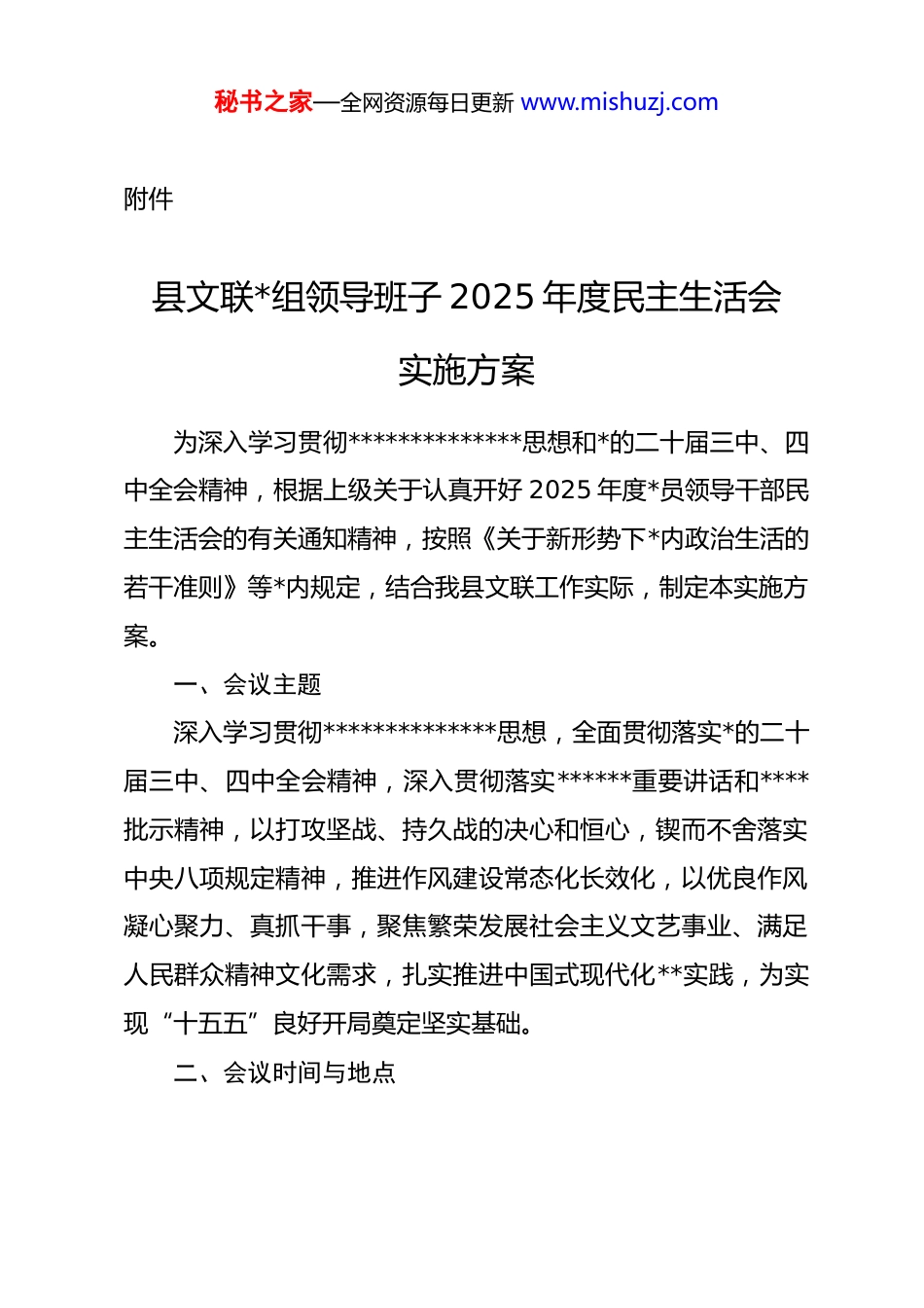 秘书之家—全网资源每日更新 www.mishuzj.com关于召开 2025 年度民主生活会的请示县委宣传部:根据中共中央纪委机关、中共中央组织部《关于开好2025 年度县以上*和国家机关*员领导干部民主生活会的通知》精神,以及省委、市委和县委的有关工作部署,为深入学习贯彻**************思想,全面贯彻落实*的二十届三中、四中全会精神,巩固拓展作风建设成果,县文学艺术界联合会*组拟召开 2025 年度民主生活会。为此,我们研究制定了《县文联*组领导班子 2025 年度民主生活会实施方案》(详见附件)。妥否,请批示。附件:县文联*组领导班子 2025 年度民主生活会实施方案县文学艺术界联合会*组(章)2026 年 1 月 21 日秘书之家—全网资源每日更新 www.mishuzj.com附件县文联*组领导班子 2025 年度民主生活会实施方案为深入学习贯彻**************思想和*的二十届三中、四中全会精神,根据上级关于认真开好 2025 年度*员领导干部民主生活会的有关通知精神,按照《关于新形势下*内政治生活的若干准则》等*内规定,结合我县文联工作实际,制定本实施方案。一、会议主题深入学习贯彻**************思想,全面贯彻落实*的二十届三中、四中全会精神,深入贯彻落实******重要讲话和****批示精神,以打攻坚战、持久战的决心和恒心,锲而不舍落实中央八项规定精神,推进作风建设常态化长效化,以优良作风凝心聚力、真抓干事,聚焦繁荣发展社会主义文艺事业、满足人民群众精神文化需求,扎实推进中国式现代化**实践,为实现“十五五”良好开局奠定坚实基础。二、会议时间与地点秘书之家—全网资源每日更新 www.mishuzj.com会议时间:拟定于 2026 年 2 月*日(星期*)上午 9:00,会期半天。会议地点:县文联会议室。三、参会人员参会人员:县文联*组书记、副主席(主持工作),县文联*组成员、副主席,县文联*组成员。列席人员:县文联办公室负责人,县作家协会、美术家协会、书法家协会、摄影家协会等主要协会负责人代表各 1 名,新文艺群体代表 1 名。上级指导:县委宣传部指导组同志、县纪委监委派驻纪检监察组负责同志。四、会议议程会议由县文联*组书记、副主席(主持工作)主持。第一项议程,主持人宣布会议开始。介绍与会人员,明确会议主题、议程和要求。第二项议程,通报会前准备情况。由**同志代表*组通报本次民主生活会会前学习研讨、征求意见、谈心谈话等准备工作情况,并通报上一年度民主生活会及有关专题民主生活会整改措施落实情况。第三项议程,*组书记代表班子作对照检查。由**同志代表秘书之家—全网资源每日更新 www.mishuzj.com县文联*组领导班子作对照检查发言,聚焦会议主题,围绕五个方面深入查摆问题、剖析原因,并提出具体整改措施。第四项议程,班子成员开展批评与自我批评。1.*组书记、副主席(主持工作)同志作个人对照检查发言,其他班子成员对其提出批评意见,**同志作表态发言。2.*组成员、副主席同志作个人对照检查发言,其他班子成员对其提出批评意见,**同志作表态发言。3.*组成员**同志作个人对照检查发言,其他班子成员对其提出批评意见,**同志作表态发言。第五项议程,上级领导点评指导。请县委宣传部指导组领导对民主生活会进行点评,指出问题、提出要求。第六项议程,主持人作总结表态。由**同志代表文联*组领导班子作表态发言,就落实指导组要求、抓好问题整改作出承诺,并对下一步工作提出明确要求。第七项议程,主持人宣布会议结束。五、会前准备工作(一)扎实理论学习筑牢思想根基县文联*组和*员领导干部必须把深化理论武装作为开好民主生活会的首要前提。会前安排不少于 2 天的集中学习和个人自学,*组理论学习中心组至少开展 1 次专题学习研讨。学习内秘书之家—全网资源每日更新 www.mishuzj.com容包括但不限于:**************思想,*的二十届三中、四中全会精神,******关于*的建设的重要思想,关于严肃*内政治生活、加强作风建设的重要论述,特别是******在中国文联十一大、中国作协十大开幕式上的重要讲话精神和关于文艺工作的系列****批示。同时,深入学习*章、《关于新形势下*内政治生活的若干准则》...