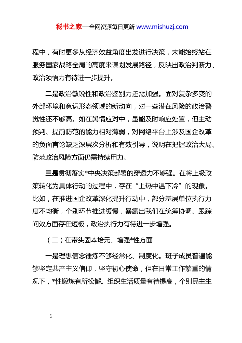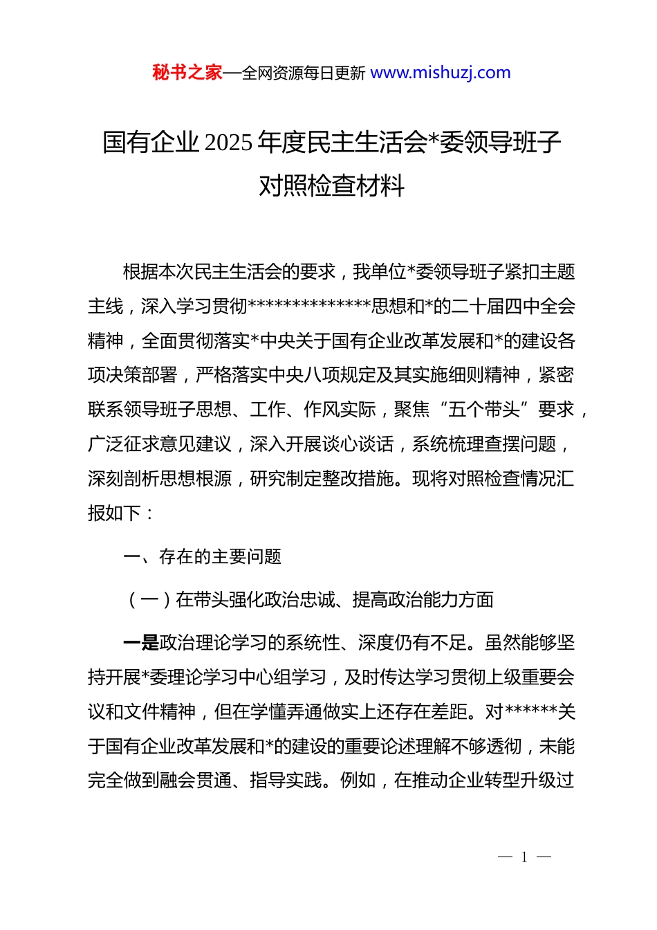 秘书之家—全网资源每日更新 www.mishuzj.com国有企业 2025 年度民主生活会*委领导班子对照检查材料根据本次民主生活会的要求,我单位*委领导班子紧扣主题主线,深入学习贯彻**************思想和*的二十届四中全会精神,全面贯彻落实*中央关于国有企业改革发展和*的建设各项决策部署,严格落实中央八项规定及其实施细则精神,紧密联系领导班子思想、工作、作风实际,聚焦“五个带头”要求,广泛征求意见建议,深入开展谈心谈话,系统梳理查摆问题,深刻剖析思想根源,研究制定整改措施。现将对照检查情况汇报如下:一、存在的主要问题(一)在带头强化政治忠诚、提高政治能力方面一是政治理论学习的系统性、深度仍有不足。虽然能够坚持开展*委理论学习中心组学习,及时传达学习贯彻上级重要会议和文件精神,但在学懂弄通做实上还存在差距。对******关于国有企业改革发展和*的建设的重要论述理解不够透彻,未能完全做到融会贯通、指导实践。例如,在推动企业转型升级过— 1 —秘书之家—全网资源每日更新 www.mishuzj.com程中,有时更多从经济效益角度出发进行决策,未能始终站在服务国家战略全局的高度来谋划发展路径,反映出政治判断力、政治领悟力有待进一步提升。二是政治敏锐性和政治鉴别力还需加强。面对复杂多变的外部环境和意识形态领域的新动向,对一些潜在风险的政治警觉性还不够高。如在舆情应对中,虽能及时响应处置,但主动预判、提前防范的能力相对薄弱,对网络平台上涉及国企改革的负面言论缺乏深层次分析和有效引导,说明在把握政治大局、防范政治风险方面仍需持续用力。三是贯彻落实*中央决策部署的穿透力不够强。在将上级政策转化为具体行动的过程中,存在“上热中温下冷”的现象。比如,在推进国企改革深化提升行动中,部分基层单位执行力度不均衡,个别环节推进缓慢,暴露出我们在统筹协调、跟踪问效方面存在短板,政治执行力有待进一步增强。(二)在带头固本培元、增强*性方面一是理想信念锤炼不够经常化、制度化。班子成员普遍能够坚定共产主义信仰,坚守初心使命,但在日常工作繁重的情况下,*性锻炼有所松懈。组织生活质量有待提高,个别民主生— 2 —秘书之家—全网资源每日更新 www.mishuzj.com活会、组织生活会批评和自我批评“辣味”不足,存在“怕伤和气”“点到为止”的倾向,红脸出汗的效果未充分显现。有的同志在作对照检查时,谈工作多、谈思想少,触及灵魂深处的反思不多。二是在弘扬优良传统方面示范引领作用发挥不够。面对新时代新任务,艰苦奋斗、勤俭办企的精神在一些工作中有所弱化。例如,在项目建设中,对成本控制的精细化管理抓得不紧,存在一定的铺张浪费倾向;在办公资源配置上,未能始终坚持集约高效原则,反映出宗旨意识和节俭意识有待强化。三是*员身份认同感和组织归属感需进一步增强。个别班子成员在以普通*员身份参加支部活动时,主动性不强,参与度不高,存在“重领导身份、轻*员身份”的倾向。在日常言行中,未能时时处处以高标准严格要求自己,先锋模范作用体现不够充分,影响了班子整体形象和凝聚力。(三)在带头敬畏人民、敬畏组织、敬畏法纪方面一是服务职工群众的主动性、精准性有待提升。尽管建立了职工诉求反馈机制,定期开展走访调研,但在解决一线员工急难愁盼问题上仍显滞后。例如,针对部分基层岗位劳动强度— 3 —秘书之家—全网资源每日更新 www.mishuzj.com大、轮休安排不合理的问题,整改推进缓慢;对青年职工职业发展通道狭窄的关注不够,人才培养体系尚未健全,导致人才流失风险上升,反映出以人民为中心的发展思想树得不够牢固。二是执行组织纪律的严肃性还需强化。在干部选拔任用、重大事项报告等方面基本能够依规办事,但个别程序执行不够严谨。如在某次中层干部调整中,事前征求班子成员意见不够充分,存在“会上临时动议”现象,影响了决策科学性和民主性。此外,个别成员外出报备不及时、请示报告制度落实不到位等问题偶有发生,暴露出组织观念仍有待加强。三是纪律规矩意识需常抓不懈。虽然持续开展*风廉政教育,组织观看警示教育片、通报典型案例,但个别*员干部对纪律红线的认识仍停...
