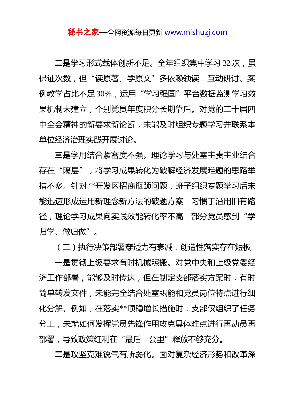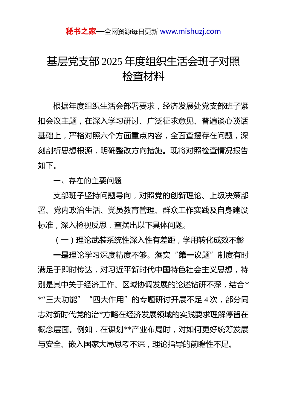 秘书之家—全网资源每日更新 www.mishuzj.com基层党支部 2025 年度组织生活会班子对照检查材料 根据年度组织生活会部署要求,经济发展处党支部班子紧扣会议主题,在深入学习研讨、广泛征求意见、普遍谈心谈话基础上,严格对照六个方面重点内容,全面查摆存在问题,深刻剖析思想根源,明确整改方向措施。现将对照检查情况报告如下。一、存在的主要问题支部班子坚持问题导向,对照党的创新理论、上级决策部署、党内政治生活、党员教育管理、群众工作实践及自身建设标准,深入检视反思,查摆出以下具体问题。(一)理论武装系统性深入性有差距,学用转化成效不彰一是理论学习深度精度不够。落实“第一议题”制度有时满足于即时传达,对习近平新时代中国特色社会主义思想,特别是其中关于经济工作、区域协调发展的论述钻研不深,结合**“三大功能”“四大作用”的专题研讨开展不足 4 次,部分同志对新时代党的治*方略在经济发展领域的实践要求理解停留在概念层面。例如,在谋划**产业布局时,对如何更好统筹发展与安全、嵌入国家大局思考不深,理论指导的前瞻性不足。秘书之家—全网资源每日更新 www.mishuzj.com二是学习形式载体创新不足。全年组织集中学习 32 次,虽保证次数,但“读原著、学原文”多依赖领读,互动研讨、案例教学占比不足 30%,运用“学习强国”平台数据监测学习效果机制未建立,个别党员年度积分长期靠后。对党的二十届四中全会精神的新要求新论断,未能及时组织专题学习并联系本单位经济治理实践开展讨论。三是学用结合紧密度不强。理论学习与处室主责主业结合存在“隔层”,将学习成果转化为破解经济发展难题的思路举措不多。针对**开发区招商瓶颈问题,班子组织专题学习后未能迅速形成运用新理念新方法的破题方案,习惯于沿用旧有路径,理论学习成果向实践效能转化率不高,部分党员感到“学归学、做归做”。(二)执行决策部署穿透力有衰减,创造性落实存在短板一是贯彻上级要求有时机械照搬。对党中央和上级党委经济工作部署,能够及时传达,但在制定支部落实方案时,有时简单转发文件,未能完全结合处室职能和党员岗位特点进行细化分解。例如,在落实**项稳增长措施时,支部仅组织了任务分工,未就如何发挥党员先锋作用攻克具体难点进行再动员再部署,导致政策红利在“最后一公里”释放不够充分。二是攻坚克难锐气有所弱化。面对复杂经济形势和改革深秘书之家—全网资源每日更新 www.mishuzj.com水区任务,支部班子带头“啃硬骨头”的劲头不足。在推动**重点改革试点工作中,遇到部门协调阻力时,主动向上级请示报告、争取支持的及时性不够,更多依赖常规渠道沟通,致使项目进度一度滞后于预期时间节点约两个月,影响了整体工作布局。三是重大事项报告规范性待加强。支部班子能够自觉报告个人有关事项,但在涉及处室业务领域的重要工作动态、潜在风险研判等方面,向机关党委的主动请示报告制度执行不够严格。如**企业纾困过程中出现的苗头性风险,支部虽内部研判,但未第一时间形成书面报告向上级组织专题反映,存在一定的信息迟报风险。(三)组织生活制度执行刚性不足,政治性时代性感召力需提升一是“三会一课”质量参差不齐。全年召开支委会 14 次、党员大会 6 次、党课 4 次,形式上符合要求,但部分会议议题设置与中心工作结合不够紧密,存在“为开会而开会”现象。第四季度一次支委会,议题过于分散,讨论经济指标多,分析党员思想动态少,组织生活的政治滋养功能发挥不充分。记录显示,有 3 名党员因出差、培训全年累计缺席集中学习超过 5次,补学机制落实不严。秘书之家—全网资源每日更新 www.mishuzj.com二是批评与自我批评辣味不足。组织生活会上,班子对照检查有时谈工作业务多、谈思想灵魂少,相互批评多以“希望”“建议”开头,缺乏真刀真枪、点人点事的交锋。有党员反映,在讨论**项目决策失误时,班子内部批评多集中于客观条件,对主观决策因素、工作作风问题触及不深,未能达到“红脸出汗”的预期效果。三是主题党日活动吸引力不强。全年开展主题党日 12 次,但 6 次与业务工作会议合并进行,活动主题不鲜明,仪...