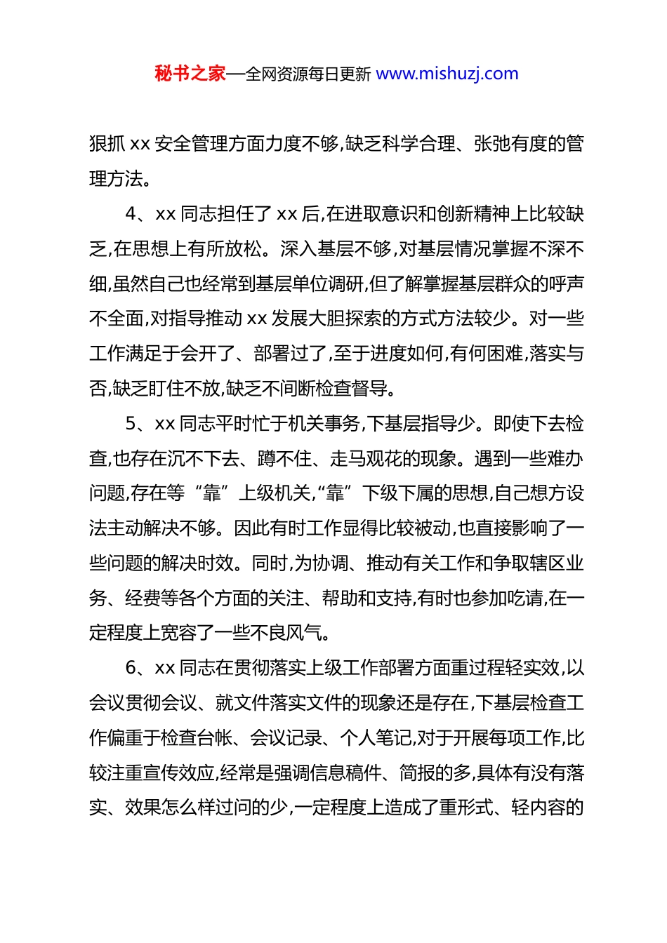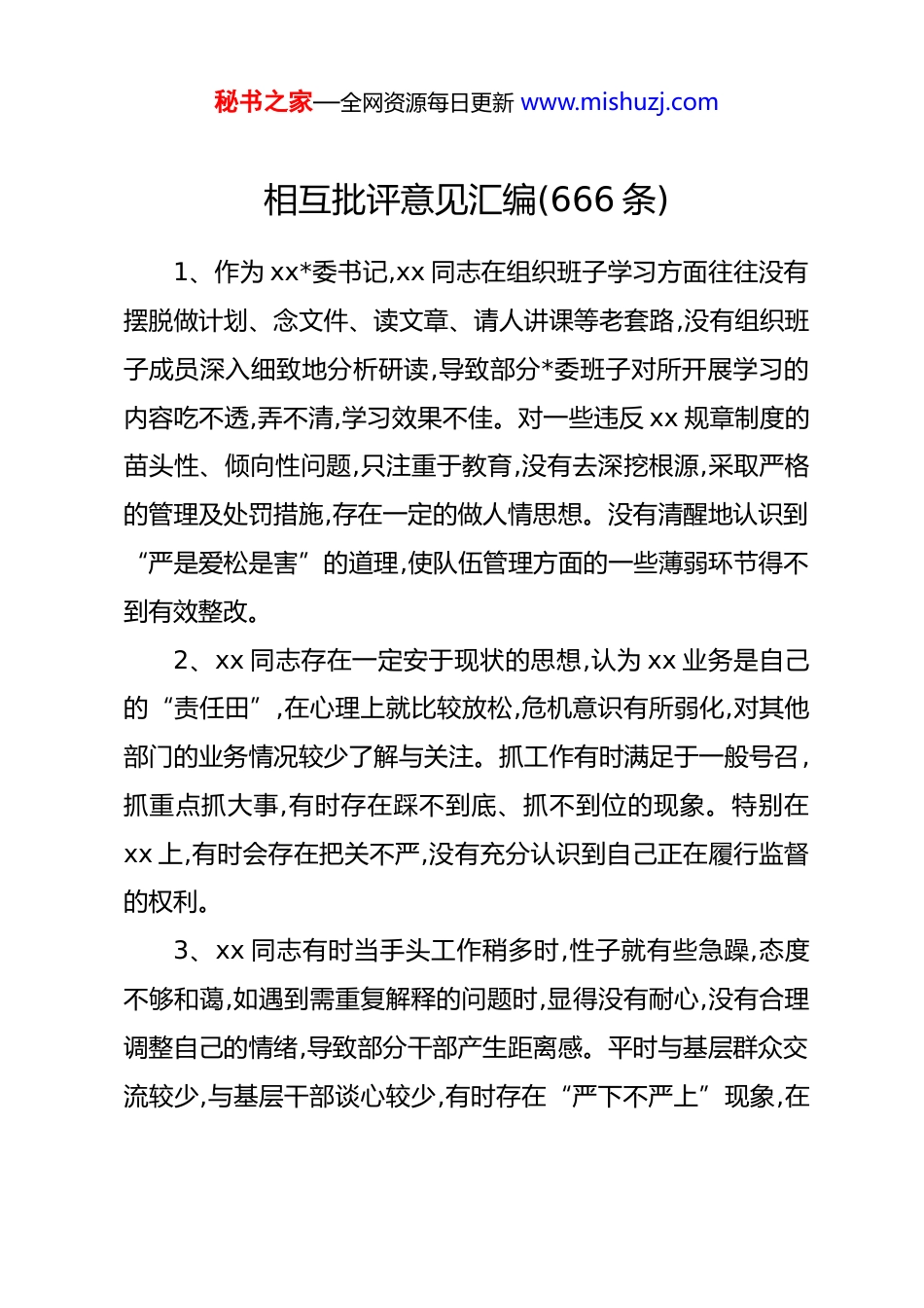 秘书之家—全网资源每日更新 www.mishuzj.com相互批评意见汇编(666 条)1、作为 xx*委书记,xx 同志在组织班子学习方面往往没有摆脱做计划、念文件、读文章、请人讲课等老套路,没有组织班子成员深入细致地分析研读,导致部分*委班子对所开展学习的内容吃不透,弄不清,学习效果不佳。对一些违反 xx 规章制度的苗头性、倾向性问题,只注重于教育,没有去深挖根源,采取严格的管理及处罚措施,存在一定的做人情思想。没有清醒地认识到“严是爱松是害”的道理,使队伍管理方面的一些薄弱环节得不到有效整改。2、xx 同志存在一定安于现状的思想,认为 xx 业务是自己的“责任田”,在心理上就比较放松,危机意识有所弱化,对其他部门的业务情况较少了解与关注。抓工作有时满足于一般号召,抓重点抓大事,有时存在踩不到底、抓不到位的现象。特别在xx 上,有时会存在把关不严,没有充分认识到自己正在履行监督的权利。3、xx 同志有时当手头工作稍多时,性子就有些急躁,态度不够和蔼,如遇到需重复解释的问题时,显得没有耐心,没有合理调整自己的情绪,导致部分干部产生距离感。平时与基层群众交流较少,与基层干部谈心较少,有时存在“严下不严上”现象,在秘书之家—全网资源每日更新 www.mishuzj.com狠抓 xx 安全管理方面力度不够,缺乏科学合理、张弛有度的管理方法。4、xx 同志担任了 xx 后,在进取意识和创新精神上比较缺乏,在思想上有所放松。深入基层不够,对基层情况掌握不深不细,虽然自己也经常到基层单位调研,但了解掌握基层群众的呼声不全面,对指导推动 xx 发展大胆探索的方式方法较少。对一些工作满足于会开了、部署过了,至于进度如何,有何困难,落实与否,缺乏盯住不放,缺乏不间断检查督导。5、xx 同志平时忙于机关事务,下基层指导少。即使下去检查,也存在沉不下去、蹲不住、走马观花的现象。遇到一些难办问题,存在等“靠”上级机关,“靠”下级下属的思想,自己想方设法主动解决不够。因此有时工作显得比较被动,也直接影响了一些问题的解决时效。同时,为协调、推动有关工作和争取辖区业务、经费等各个方面的关注、帮助和支持,有时也参加吃请,在一定程度上宽容了一些不良风气。6、xx 同志在贯彻落实上级工作部署方面重过程轻实效,以会议贯彻会议、就文件落实文件的现象还是存在,下基层检查工作偏重于检查台帐、会议记录、个人笔记,对于开展每项工作,比较注重宣传效应,经常是强调信息稿件、简报的多,具体有没有落实、效果怎么样过问的少,一定程度上造成了重形式、轻内容的秘书之家—全网资源每日更新 www.mishuzj.com导向,增加了基层的负担,影响了工作实效。7、xx 同志下基层调研时存在“走马观花、蜻蜓点水”的现象,对群众的所需所求不能全面掌握,对他们反映的问题有时解决得不够周全及时。同时,个人学习方面存在应付现象,系统学习理论不多,学习上级文件讲话精神有时理解不透彻,满足“会上讲”、“稿上念”。潜心思考,理论联系实际、指导实践,创新落实不多。8、xx 同志分管 xx 业务,有时为业务需要,处理好与各*政机关的关系,在接待方面为了表诚意、显面子、不“失礼”,存在一定的超标准安排。日常工作中,与基层领导接触的多,与群众谈心的少,直接听取群众意见不及时不全面,帮助群众解决实际困难不多,对群众不同的生活情况了解的还不够细致,没有真正和群众打成一片。9、xx 同志在抓具体工作中,对下级、对下属提工作要求多、直接跟踪指导少,有时满足于会开了、文件发了,而没有一抓到底,缺乏踏石留印、抓铁有痕的作风,导致下面执行*委的意图和部署不到位、不准确,终端效果偏向走样,致使一些常见性问题屡查屡有、屡纠屡犯。在执勤过程中表率作用还是不明显,执法执勤时,大部分充当的是监督指导的角色,自身参与、冲锋陷阵少。秘书之家—全网资源每日更新 www.mishuzj.com10、xx 同志作为*委书记,在带领*委一班人攻坚克难、突破制约 xx 建设发展瓶颈问题方面的举措还不够有力,作为“一班之长”,坐办公室听汇报多,深入基层单位调研思考少。有急功近利的思想,对一些工作总想尽快出亮点、出经验,尽管有的工作谋划不周密,落实不到位,只做了一部分,却纵容下属总结经验、提炼亮点,有纸上谈...
