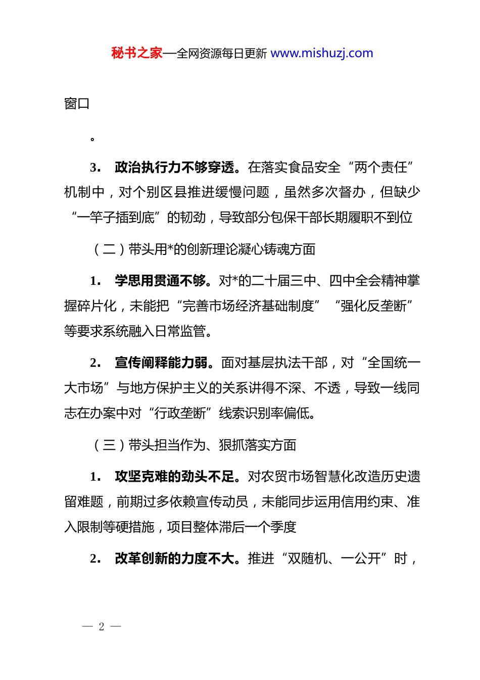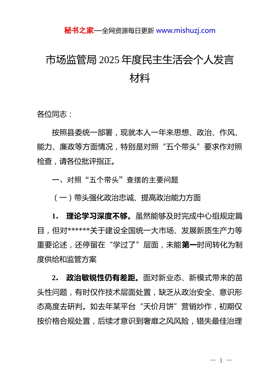 秘书之家—全网资源每日更新 www.mishuzj.com市场监管局 2025 年度民主生活会个人发言材料各位同志:按照县委统一部署,现就本人一年来思想、政治、作风、能力、廉政等方面情况,特别是对照“五个带头”要求作对照检查,请各位批评指正。一、对照“五个带头”查摆的主要问题(一)带头强化政治忠诚、提高政治能力方面1.理论学习深度不够。虽然能够及时完成中心组规定篇目,但对******关于建设全国统一大市场、发展新质生产力等重要论述,还停留在“学过了”层面,未能第一时间转化为制度供给和监管方案2.政治敏锐性仍有差距。面对新业态、新模式带来的苗头性问题,有时仅作技术层面处置,缺乏从政治安全、意识形态高度去研判。如去年某平台“天价月饼”营销炒作,初期仅按价格合规处置,后续才意识到奢靡之风风险,错失最佳治理— 1 —秘书之家—全网资源每日更新 www.mishuzj.com窗口。3.政治执行力不够穿透。在落实食品安全“两个责任”机制中,对个别区县推进缓慢问题,虽然多次督办,但缺少“一竿子插到底”的韧劲,导致部分包保干部长期履职不到位(二)带头用*的创新理论凝心铸魂方面1.学思用贯通不够。对*的二十届三中、四中全会精神掌握碎片化,未能把“完善市场经济基础制度”“强化反垄断”等要求系统融入日常监管。2.宣传阐释能力弱。面对基层执法干部,对“全国统一大市场”与地方保护主义的关系讲得不深、不透,导致一线同志在办案中对“行政垄断”线索识别率偏低。(三)带头担当作为、狠抓落实方面1.攻坚克难的劲头不足。对农贸市场智慧化改造历史遗留难题,前期过多依赖宣传动员,未能同步运用信用约束、准入限制等硬措施,项目整体滞后一个季度2.改革创新的力度不大。推进“双随机、一公开”时,— 2 —秘书之家—全网资源每日更新 www.mishuzj.com满足于完成省定抽查比例,缺少结合县域产业特点主动下调低风险企业抽查频次、提高高风险企业频次的自选动作。3.风险底线思维不足。对“僵尸企业”“失联企业”后续监管,重准入轻监管,导致 2025 年初出现 3 起“空壳公司”虚开增值税发票案件,造成不良社会影响(四)带头践行宗旨、联系群众方面1.调研深度不够。2025 年开展的“生鲜灯”专项整治,前期调研仅停留在城区 3 家大型超市,未深入城乡接合部农贸市场,导致执法依据解释出现偏差,商户抵触情绪大2.服务企业“最后一公里”仍有堵点。省市下放技改审批权限后,我局虽然制定了实施细则,但跟踪问效不到位,部分企业反映备案环节仍需多头跑路,说明督查深度不够(五)带头落实全面从严治*政治责任方面1.对“小微权力”监督失之于宽。对个别干部在公务接待中超标准、接受企业土特产等“小节”问题,认为“人情往来”而未能及时咬耳扯袖,客观上助长了不良风气— 3 —秘书之家—全网资源每日更新 www.mishuzj.com2.形式主义纠治不够彻底。审核分管股室材料时,发现照搬照抄网络范文痕迹明显,但考虑到“干部辛苦”,仅作一般性修改,未严肃批评,导致不良文风反复出3.法治培训抓得不紧。2025 年“生鲜灯”执法初期,部分执法人员对《农产品质量安全法》《电子商务法》条款理解不一,作为分管领导,未及时组织统一培训,暴露出法治思维推广力度不足二、问题产生的原因分析1.理论武装不够系统。对**************思想的世界观、方法论领悟不深,导致用*的创新理论破解监管难题的自觉性不强。2.*性锻炼不够经常。自我要求有时满足于“不出事”,对照*章*规“扫描”自身的频次降低,缺乏“时时放心不下”的责任感。3.宗旨意识有所弱化。对“监管为民”理念理解还停留在口号层面,调研深度、服务温度与群众期盼仍有差距。4.纪律敬畏有所松懈。认为自己多年在执法一线,对纪律规矩“耳熟能详”,导致对“微腐败”“软腐败”警惕性下— 4 —秘书之家—全网资源每日更新 www.mishuzj.com降。三、下一步整改方向和措施1.在铸牢政治忠诚上作表率建立“第一议题”领学述学评学制度,每季度撰写 1 篇学习成果转化报告;对*中央关于统一大市场、反垄断、反不正当竞争等重大决策,实行“任务清单+台账管理”,确保 15 日内拿出本地落实方案。2.在...