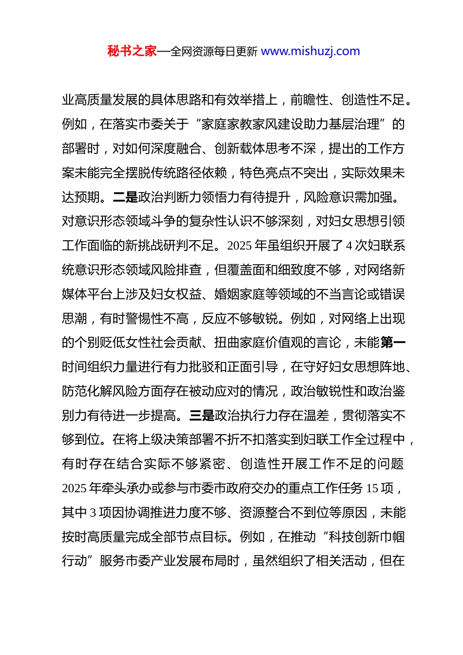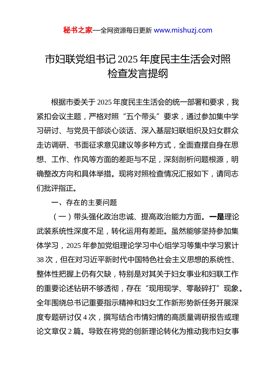 秘书之家—全网资源每日更新 www.mishuzj.com市妇联党组书记 2025 年度民主生活会对照检查发言提纲 根据市委关于 2025 年度民主生活会的统一部署和要求,我紧扣会议主题,严格对照“五个带头”要求,通过参加集中学习研讨、与党员干部谈心谈话、深入基层妇联组织及妇女群众走访调研、书面征求意见建议等多种方式,全面查摆自身在思想、工作、作风等方面的差距与不足,深刻剖析问题根源,明确整改方向和具体举措。现将对照检查情况汇报如下,请同志们批评指正。一、存在的主要问题(一)带头强化政治忠诚、提高政治能力方面。一是理论武装系统性深度不足,转化运用有差距。虽然能够坚持参加集体学习,2025 年参加党组理论学习中心组学习等集中学习累计38 次,但在对习近平新时代中国特色社会主义思想的系统性、整体性把握上仍有欠缺,特别是对其关于妇女事业和妇联工作的重要论述钻研不够透彻,存在“现用现学、零敲碎打”现象。全年围绕总书记重要指示精神和妇女工作新形势新任务开展深度专题研讨仅 4 次,撰写结合市情妇情的高质量调研报告或理论文章仅 2 篇。导致在将党的创新理论转化为推动我市妇女事秘书之家—全网资源每日更新 www.mishuzj.com业高质量发展的具体思路和有效举措上,前瞻性、创造性不足。例如,在落实市委关于“家庭家教家风建设助力基层治理”的部署时,对如何深度融合、创新载体思考不深,提出的工作方案未能完全摆脱传统路径依赖,特色亮点不突出,实际效果未达预期。二是政治判断力领悟力有待提升,风险意识需加强。对意识形态领域斗争的复杂性认识不够深刻,对妇女思想引领工作面临的新挑战研判不足。2025 年虽组织开展了 4 次妇联系统意识形态领域风险排查,但覆盖面和细致度不够,对网络新媒体平台上涉及妇女权益、婚姻家庭等领域的不当言论或错误思潮,有时警惕性不高,反应不够敏锐。例如,对网络上出现的个别贬低女性社会贡献、扭曲家庭价值观的言论,未能第一时间组织力量进行有力批驳和正面引导,在守好妇女思想阵地、防范化解风险方面存在被动应对的情况,政治敏锐性和政治鉴别力有待进一步提高。三是政治执行力存在温差,贯彻落实不够到位。在将上级决策部署不折不扣落实到妇联工作全过程中,有时存在结合实际不够紧密、创造性开展工作不足的问题2025 年牵头承办或参与市委市政府交办的重点工作任务 15 项,其中 3 项因协调推进力度不够、资源整合不到位等原因,未能按时高质量完成全部节点目标。例如,在推动“科技创新巾帼行动”服务市委产业发展布局时,虽然组织了相关活动,但在秘书之家—全网资源每日更新 www.mishuzj.com精准对接女科技工作者需求、搭建常态化长效化服务平台方面措施不够实,未能完全打通政策落地的“最后一公里”,服务市委中心工作的贡献度有待提升。(二)带头固本培元、增强党性方面。一是党性锤炼的自觉性主动性不强。有时将参加组织生活等同于完成“规定动作”,未能真正将其视为锤炼党性、净化思想的重要途径2025 年按要求参加了中心组学习、支部主题党日等活动 16 次,但主动对照党章党规、对照先进典型、对照妇女群众期盼进行深刻自我剖析仅 1 次。在组织生活会上,开展批评与自我批评有时“辣味”不足,怕伤和气、怕影响团结,对同志的缺点点到为止,对自己存在的问题遮遮掩掩,未能达到“红脸出汗、排毒治病”的效果,党性修养的“熔炉”作用未能充分发挥。二是理想信念的内化践行不够扎实。面对新形势下妇联工作的新挑战、妇女群众的新期盼,有时会产生畏难情绪和本领恐慌,从坚定理想信念中汲取攻坚克难力量不够。在日常工作中,更多关注活动开展了多少、覆盖面有多广,对于工作的政治效果、社会效果是否真正达到预期深思不足。例如,在推进“巾帼建功”系列活动中,有时过于注重典型选树的程序和数量,对先进典型精神内涵的深度挖掘和广泛传播不够,未能有效激发广大妇女见贤思齐、奋斗奉献的内生动力,理想信念的感召力、秘书之家—全网资源每日更新 www.mishuzj.com凝聚力有待加强。三是宗旨意识树得不够牢固。深入基层、深入妇女群众不够经常和深入,存在一定的“机关化”...