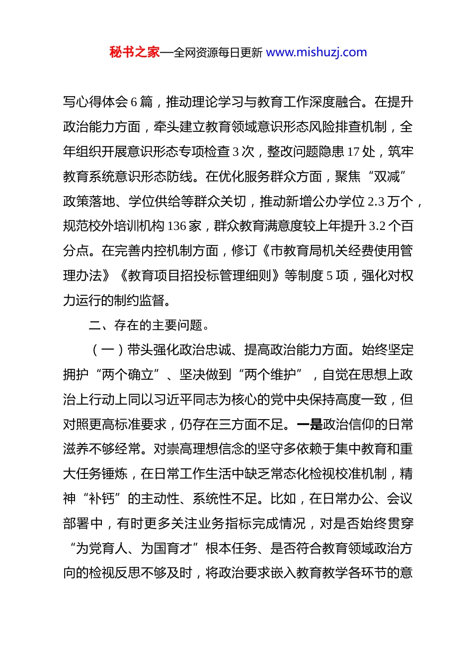 秘书之家—全网资源每日更新 www.mishuzj.com市教育局副局长 2025 年度专题民主生活会对照检查材料 根据市委和市教育局党组关于开好 2025 年度党员领导干部民主生活会的部署要求,本人紧扣“深入学习贯彻习近平新时代中国特色社会主义思想,全面贯彻落实党的二十届三中、四中全会精神”这一主题,聚焦“五个带头”重点内容,结合我市教育事业高质量发展实际,通过参加局党委集中学习、与分管科室及县区教育局负责人谈心谈话、书面征求学校师生及家长代表意见建议 8 类 42 条,深入查摆自身在思想、政治、作风、能力、廉洁等方面存在的突出问题,深刻剖析问题根源,明确整改方向和具体措施。现将对照检查情况报告如下。一、2024 年度专题民主生活会查摆问题整改落实情况2024 年度民主生活会上,本人围绕理论武装、政治忠诚、担当作为、服务群众、作风建设、廉洁自律等 6 个方面,共查摆出 11 项具体问题,逐一制定了整改措施、明确了整改时限和责任分工。一年来,坚持立行立改与长效治理相结合,实行“挂图作战、销号管理”,11 项问题均已全部整改到位并持续深化提升。在强化理论武装方面,建立个人常态化学习机制,全年参加局党委理论学习中心组学习 12 次、专题研讨 4 次,撰秘书之家—全网资源每日更新 www.mishuzj.com写心得体会 6 篇,推动理论学习与教育工作深度融合。在提升政治能力方面,牵头建立教育领域意识形态风险排查机制,全年组织开展意识形态专项检查 3 次,整改问题隐患 17 处,筑牢教育系统意识形态防线。在优化服务群众方面,聚焦“双减”政策落地、学位供给等群众关切,推动新增公办学位 2.3 万个,规范校外培训机构 136 家,群众教育满意度较上年提升 3.2 个百分点。在完善内控机制方面,修订《市教育局机关经费使用管理办法》《教育项目招投标管理细则》等制度 5 项,强化对权力运行的制约监督。二、存在的主要问题。(一)带头强化政治忠诚、提高政治能力方面。始终坚定拥护“两个确立”、坚决做到“两个维护”,自觉在思想上政治上行动上同以习近平同志为核心的党中央保持高度一致,但对照更高标准要求,仍存在三方面不足。一是政治信仰的日常滋养不够经常。对崇高理想信念的坚守多依赖于集中教育和重大任务锤炼,在日常工作生活中缺乏常态化检视校准机制,精神“补钙”的主动性、系统性不足。比如,在日常办公、会议部署中,有时更多关注业务指标完成情况,对是否始终贯穿“为党育人、为国育才”根本任务、是否符合教育领域政治方向的检视反思不够及时,将政治要求嵌入教育教学各环节的意秘书之家—全网资源每日更新 www.mishuzj.com识不够强烈。二是理论武装存在“浅表化”“碎片化”倾向。对党的创新理论特别是习近平总书记关于教育、科技、人才的重要论述,以及发展新质生产力、推进教育数字化转型等最新部署,满足于参加集体学习、完成规定篇目,静下心来读原著、学原文、悟原理的深度不够,对核心要义、精神实质、实践要求的融会贯通不足。全年个人自主研读党的创新理论著作仅 3部,对“教育强国建设与国家中心城市发展相契合”的战略思考不深,未能有效将理论学习成果转化为谋划我市教育发展的战略思维、破解难题的实践路径。三是政治站位和政治判断力有待提升。面对教育领域复杂形势和重大改革任务,有时陷入事务主义,从政治高度审视、分析和推进工作的敏锐性不足。例如,在推进《市中小学专项规划(2025—2035 年)》编制过程中,初期更多关注学校数量、学位供给等量化指标,对规划是否契合国家教育强国战略、是否服务我市国家中心城市建设大局、是否能够防范教育资源配置失衡引发的社会风险等政治维度考量不够充分,后经市委督查提醒才补充完善相关内容,反映出政治站位不够高、全局观念不够强。(二)带头固本培元、增强党性方面。始终坚持党性原则,严格参加党内政治生活,但在党性修养的常态化、制度化锤炼上仍有差距,主要体现在三方面。一是党性锤炼与岗位实践结秘书之家—全网资源每日更新 www.mishuzj.com合不够紧密。能够严格落实双重组织生活制度,全年参加所在党支部“三会一课”、主题党日...