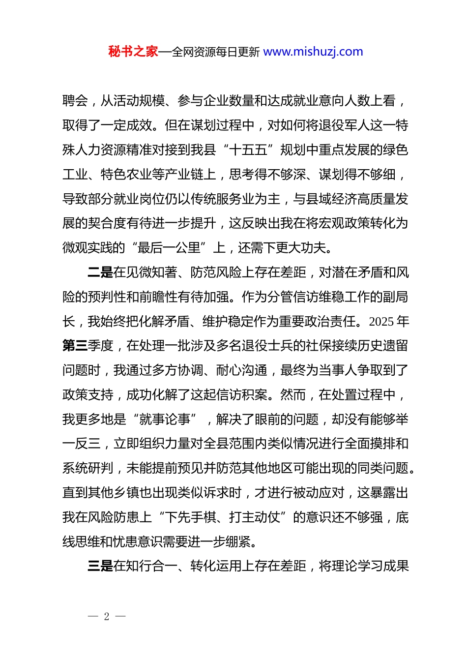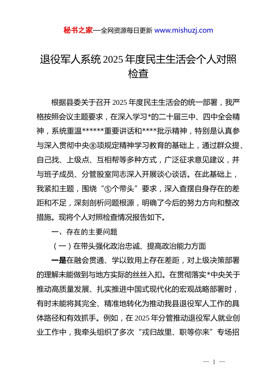 秘书之家—全网资源每日更新 www.mishuzj.com退役军人系统 2025 年度民主生活会个人对照检查根据县委关于召开 2025 年度民主生活会的统一部署,我严格按照会议主题要求,在深入学习*的二十届三中、四中全会精神,系统重温******重要讲话和****批示精神,特别是认真参与深入贯彻中央⑧项规定精神学习教育的基础上,通过群众提、自己找、上级点、互相帮等多种方式,广泛征求意见建议,并与班子成员、分管股室同志深入开展谈心谈话。在此基础上,我紧扣主题,围绕“⑤个带头”要求,深入查摆自身存在的差距和不足,深刻剖析问题根源,明确了今后的努力方向和整改措施。现将个人对照检查情况报告如下。一、存在的主要问题(一)在带头强化政治忠诚、提高政治能力方面一是在融会贯通、学以致用上存在差距,对上级决策部署的理解未能做到与地方实际的丝丝入扣。在贯彻落实*中央关于推动高质量发展、扎实推进中国式现代化的宏观战略部署时,有时未能将其完全、精准地转化为推动我县退役军人工作的具体路径和有效抓手。例如,在 2025 年分管推动退役军人就业创业工作中,我牵头组织了多次“戎归故里、职等你来”专场招— 1 —秘书之家—全网资源每日更新 www.mishuzj.com聘会,从活动规模、参与企业数量和达成就业意向人数上看,取得了一定成效。但在谋划过程中,对如何将退役军人这一特殊人力资源精准对接到我县“十五五”规划中重点发展的绿色工业、特色农业等产业链上,思考得不够深、谋划得不够细,导致部分就业岗位仍以传统服务业为主,与县域经济高质量发展的契合度有待进一步提升,这反映出我在将宏观政策转化为微观实践的“最后一公里”上,还需下更大功夫。二是在见微知著、防范风险上存在差距,对潜在矛盾和风险的预判性和前瞻性有待加强。作为分管信访维稳工作的副局长,我始终把化解矛盾、维护稳定作为重要政治责任。2025 年第三季度,在处理一批涉及多名退役士兵的社保接续历史遗留问题时,我通过多方协调、耐心沟通,最终为当事人争取到了政策支持,成功化解了这起信访积案。然而,在处置过程中,我更多地是“就事论事”,解决了眼前的问题,却没有能够举一反三,立即组织力量对全县范围内类似情况进行全面摸排和系统研判,未能提前预见并防范其他地区可能出现的同类问题。直到其他乡镇也出现类似诉求时,才进行被动应对,这暴露出我在风险防患上“下先手棋、打主动仗”的意识还不够强,底线思维和忧患意识需要进一步绷紧。三是在知行合一、转化运用上存在差距,将理论学习成果— 2 —秘书之家—全网资源每日更新 www.mishuzj.com有效转化为推动工作的创新思路不够。我积极参加局*组理论学习中心组的每一次集体学习,认真研读了*的二十届四中全会关于推进国家治理体系和治理能力现代化的重要论述。但在实际工作中,运用新思想新理论破解难题的自觉性、主动性不足。例如,在学习了关于提升基层治理效能的相关论述后,我虽然认识到提升退役军人服务站效能的重要性,但在指导基层服务站建设时,提出的思路和方法还是偏于传统,多是强调完善硬件设施、规范台账资料等“常规动作”,对于如何运用数字化、智能化手段创新服务模式,如何整合社会力量构建“共建共治共享”的服务体系等,缺乏深入研究和大胆尝试,导致理论学习与实际工作存在一定的“两张皮”现象。(二)在带头固本培元、增强*性方面一是在理论武装的深度挖掘上尚有欠缺,对思想“总开关”的拧紧抓常力度有待增强。能够坚持参加单位组织的各类政治理论学习,但有时满足于“学过了”“记下了”,在深钻细研、内化于心上做得不够。在学习**************思想的某些专题时,系统性、连贯性不足,比如在学习“新发展理念”时,对其内在的逻辑关联和实践要求的理解,还停留在概念层面,缺乏更为深刻的体悟。有时因为日常事务性工作繁忙,个人自学存在“挤牙膏”现象,学习的计划性和系统性不强,导— 3 —秘书之家—全网资源每日更新 www.mishuzj.com致在面对一些复杂问题时,理论功底不够扎实,运用马克思主义立场观点方法分析和解决问题的能力还有待提高。二是在*性修养的自觉锤炼上尚有欠缺,在日常工...