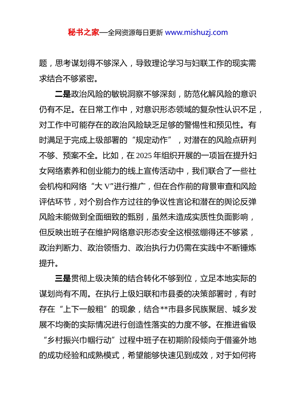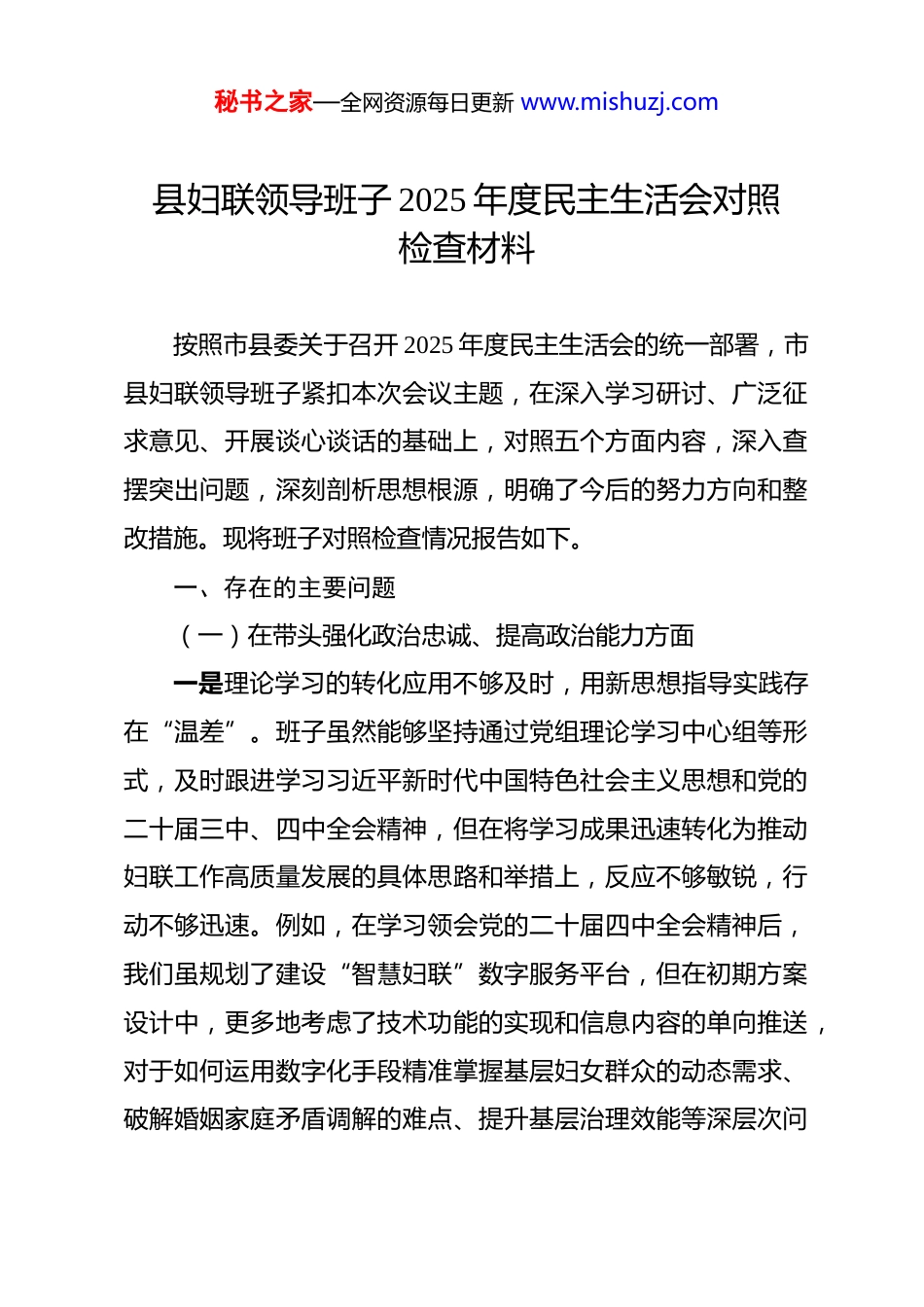 秘书之家—全网资源每日更新 www.mishuzj.com县妇联领导班子 2025 年度民主生活会对照检查材料 按照市县委关于召开 2025 年度民主生活会的统一部署,市县妇联领导班子紧扣本次会议主题,在深入学习研讨、广泛征求意见、开展谈心谈话的基础上,对照五个方面内容,深入查摆突出问题,深刻剖析思想根源,明确了今后的努力方向和整改措施。现将班子对照检查情况报告如下。一、存在的主要问题(一)在带头强化政治忠诚、提高政治能力方面一是理论学习的转化应用不够及时,用新思想指导实践存在“温差”。班子虽然能够坚持通过党组理论学习中心组等形式,及时跟进学习习近平新时代中国特色社会主义思想和党的二十届三中、四中全会精神,但在将学习成果迅速转化为推动妇联工作高质量发展的具体思路和举措上,反应不够敏锐,行动不够迅速。例如,在学习领会党的二十届四中全会精神后,我们虽规划了建设“智慧妇联”数字服务平台,但在初期方案设计中,更多地考虑了技术功能的实现和信息内容的单向推送,对于如何运用数字化手段精准掌握基层妇女群众的动态需求、破解婚姻家庭矛盾调解的难点、提升基层治理效能等深层次问秘书之家—全网资源每日更新 www.mishuzj.com题,思考谋划得不够深入,导致理论学习与妇联工作的现实需求结合不够紧密。二是政治风险的敏锐洞察不够深刻,防范化解风险的意识仍有不足。在日常工作中,对意识形态领域的复杂性认识不足,对工作中可能存在的政治风险缺乏足够的警惕性和预见性。有时满足于完成上级部署的“规定动作”,对潜在的风险点研判不够、预案不全。比如,在 2025 年组织开展的一项旨在提升妇女网络素养和创业能力的线上宣传活动中,我们联合了一些社会机构和网络“大 V”进行推广,但在合作前的背景审查和风险评估环节,对个别合作方过往的争议性言论和潜在的舆论反弹风险未能做到全面细致的甄别,虽然未造成实质性负面影响,但反映出班子在维护网络意识形态安全这根弦绷得还不够紧,政治判断力、政治领悟力、政治执行力仍需在实践中不断锤炼提升。三是贯彻上级决策的结合转化不够到位,立足本地实际的谋划尚有不周。在执行上级妇联和市县委的决策部署时,有时存在“上下一般粗”的现象,结合**市县多民族聚居、城乡发展不均衡的实际情况进行创造性落实的力度不够。在推进省级“乡村振兴巾帼行动”过程中班子在初期阶段倾向于借鉴外地的成功经验和成熟模式,希望能够快速见到成效,对于如何将秘书之家—全网资源每日更新 www.mishuzj.com这些模式与本地独特的白族扎染、刺绣等非遗文化深度融合,如何针对不同乡镇的产业基础和妇女群众的技能特点进行差异化设计,研究得不够透彻,导致部分项目在落地初期吸引力不强,群众参与度未达到预期,未能完全实现政策效能的最大化。(二)在带头固本培元、增强党性方面一是理想信念的教育形式较为单一,触及思想灵魂的效果尚有差距。班子在加强党性修养方面,高度重视理想信念教育,但有时教育方式方法创新不足,习惯于通过会议传达、文件学习、观看教育片等传统模式进行。这些方式虽然必要,但互动性、体验性不强,特别是对于年轻党员干部来说,难以产生深刻的情感共鸣和思想触动。例如,在开展的党史学习教育中,多以集中学习和理论宣讲为主,较少组织党员干部走进红色教育基地进行现场教学,或通过情景再现、故事分享会等形式,让理想信念教育更加鲜活生动、入脑入心,导致党性教育的实际效果打了折扣。二是党性锤炼的衡量标准不够严格,自我革命的斗争精神有所弱化。在党内政治生活中,有时存在“老好人”思想,批评和自我批评的“辣味”不足,尤其是在班子内部的相互批评中,多以提希望、提建议代替点问题,怕伤和气、怕影响团结。在工作的总结复盘中,习惯于讲成绩多、摆问题少,讲客观原秘书之家—全网资源每日更新 www.mishuzj.com因多、剖析主观因素少。比如,在对年度“农村妇女‘两癌’免费检查”项目进行总结评估时,班子成员更多地肯定了检查覆盖率高、组织有序等成绩,但对于部分偏远山区妇女因交通不便、思想保守等原因未能及时参加检查或后续跟踪治疗的深层次问题,没有进行足够深...