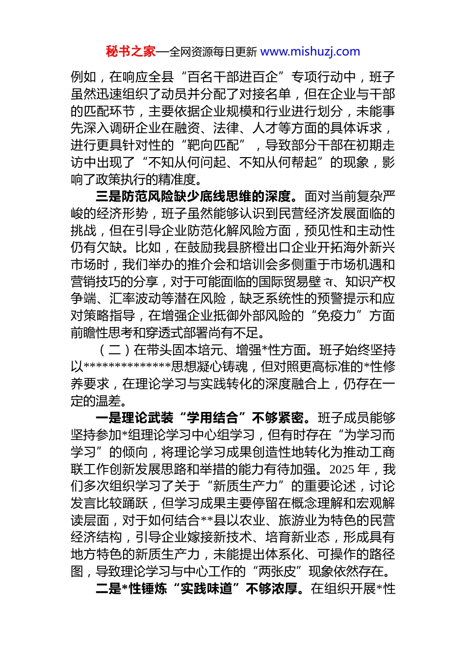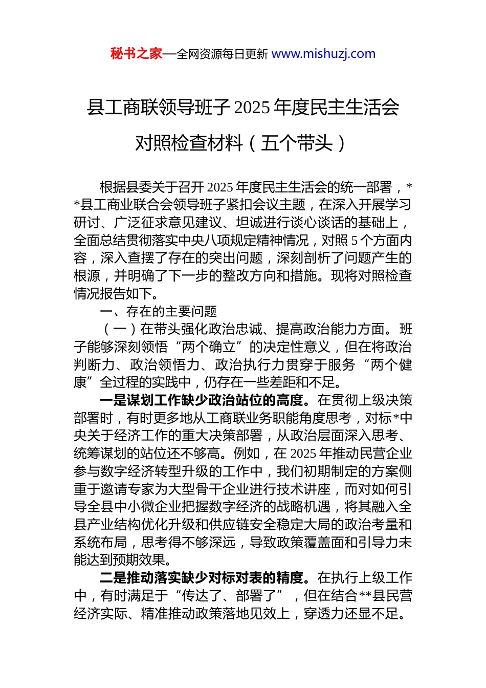 秘书之家—全网资源每日更新 www.mishuzj.com县工商联领导班子 2025 年度民主生活会对照检查材料(五个带头)根据县委关于召开 2025 年度民主生活会的统一部署,**县工商业联合会领导班子紧扣会议主题,在深入开展学习研讨、广泛征求意见建议、坦诚进行谈心谈话的基础上,全面总结贯彻落实中央八项规定精神情况,对照 5 个方面内容,深入查摆了存在的突出问题,深刻剖析了问题产生的根源,并明确了下一步的整改方向和措施。现将对照检查情况报告如下。一、存在的主要问题(一)在带头强化政治忠诚、提高政治能力方面。班子能够深刻领悟“两个确立”的决定性意义,但在将政治判断力、政治领悟力、政治执行力贯穿于服务“两个健康”全过程的实践中,仍存在一些差距和不足。一是谋划工作缺少政治站位的高度。在贯彻上级决策部署时,有时更多地从工商联业务职能角度思考,对标*中央关于经济工作的重大决策部署,从政治层面深入思考、统筹谋划的站位还不够高。例如,在 2025 年推动民营企业参与数字经济转型升级的工作中,我们初期制定的方案侧重于邀请专家为大型骨干企业进行技术讲座,而对如何引导全县中小微企业把握数字经济的战略机遇,将其融入全县产业结构优化升级和供应链安全稳定大局的政治考量和系统布局,思考得不够深远,导致政策覆盖面和引导力未能达到预期效果。二是推动落实缺少对标对表的精度。在执行上级工作中,有时满足于“传达了、部署了”,但在结合**县民营经济实际、精准推动政策落地见效上,穿透力还显不足。秘书之家—全网资源每日更新 www.mishuzj.com例如,在响应全县“百名干部进百企”专项行动中,班子虽然迅速组织了动员并分配了对接名单,但在企业与干部的匹配环节,主要依据企业规模和行业进行划分,未能事先深入调研企业在融资、法律、人才等方面的具体诉求,进行更具针对性的“靶向匹配”,导致部分干部在初期走访中出现了“不知从何问起、不知从何帮起”的现象,影响了政策执行的精准度。三是防范风险缺少底线思维的深度。面对当前复杂严峻的经济形势,班子虽然能够认识到民营经济发展面临的挑战,但在引导企业防范化解风险方面,预见性和主动性仍有欠缺。比如,在鼓励我县脐橙出口企业开拓海外新兴市场时,我们举办的推介会和培训会多侧重于市场机遇和营销技巧的分享,对于可能面临的国际贸易壁 तें�、知识产权争端、汇率波动等潜在风险,缺乏系统性的预警提示和应对策略指导,在增强企业抵御外部风险的“免疫力”方面前瞻性思考和穿透式部署尚有不足。(二)在带头固本培元、增强*性方面。班子始终坚持以**************思想凝心铸魂,但对照更高标准的*性修养要求,在理论学习与实践转化的深度融合上,仍存在一定的温差。一是理论武装“学用结合”不够紧密。班子成员能够坚持参加*组理论学习中心组学习,但有时存在“为学习而学习”的倾向,将理论学习成果创造性地转化为推动工商联工作创新发展思路和举措的能力有待加强。2025 年,我们多次组织学习了关于“新质生产力”的重要论述,讨论发言比较踊跃,但学习成果主要停留在概念理解和宏观解读层面,对于如何结合**县以农业、旅游业为特色的民营经济结构,引导企业嫁接新技术、培育新业态,形成具有地方特色的新质生产力,未能提出体系化、可操作的路径图,导致理论学习与中心工作的“两张皮”现象依然存在。二是*性锤炼“实践味道”不够浓厚。在组织开展*性秘书之家—全网资源每日更新 www.mishuzj.com教育活动时,形式和载体还不够丰富,与服务民营企业的中心工作结合不够紧密,未能充分彰显共产*人的精神追求和为民情怀。例如,在组织“七一”主题*日活动时,我们前往了革命旧址重温入*誓词,活动本身很有意义,但未能进一步延伸活动内涵,比如将会场搬到某个遇到发展瓶颈的民营企业,现场开展“dj 引领、助企纾困”的专题组织生活会,将革命先辈的奋斗精神直接转化为解决企业急难愁盼问题的实际行动,使得*性锤炼的实践指向性不够鲜明。三是思想改造“自我革命”不够持久。班子成员能够认真参加警示教育和专题民主生活会,进行批评与自我批评,但有时存在“闯关”思想,问题...