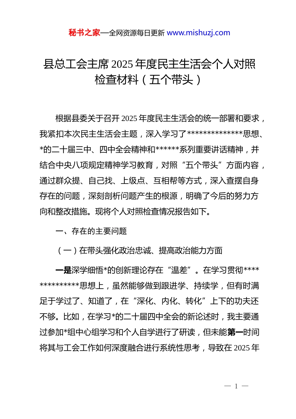 秘书之家—全网资源每日更新 www.mishuzj.com县总工会主席 2025 年度民主生活会个人对照检查材料(五个带头)根据县委关于召开 2025 年度民主生活会的统一部署和要求,我紧扣本次民主生活会主题,深入学习了**************思想、*的二十届三中、四中全会精神和******系列重要讲话精神,并结合中央八项规定精神学习教育,对照“五个带头”方面内容,通过群众提、自己找、上级点、互相帮等方式,深入查摆自身存在的问题,深刻剖析问题产生的根源,明确了今后的努力方向和整改措施。现将个人对照检查情况报告如下。一、存在的主要问题(一)在带头强化政治忠诚、提高政治能力方面一是深学细悟*的创新理论存在“温差”。在学习贯彻**************思想上,虽然能够做到跟进学、持续学,但有时满足于学过了、知道了,在“深化、内化、转化”上下的功夫还不够。比如,在学习*的二十届四中全会的新论述时,我主要通过参加*组中心组学习和个人自学进行了研读,但未能第一时间将其与工会工作如何深度融合进行系统性思考,导致在 2025 年— 1 —秘书之家—全网资源每日更新 www.mishuzj.com10 月研究部署全县工会系统数字化转型工作时,提出的初步方案更多是基于现有技术手段的改良,未能从推进基层治理能力现代化的高度,对构建“智慧工会”服务职工群众、参与社会治理的长远布局进行前瞻性规划,思想认识与中央的最新要求存在一定温差。二是贯彻落实上级决策部署存在“时差”。对中央和省市县委的决策部署,能够做到坚决拥护、立即行动,但在具体执行过程中,有时因考虑地方实际困难过多、研究准备时间过长,导致行动上稍显迟缓,未能完全实现同频共振。例如,2025 年上半年省总工会下发关于大力推进新就业形态劳动者建会入会和服务保障工作的指导意见后,我考虑到我县新就业形态劳动者底数不清、分布零散、组织难度大等现实问题,组织力量进行了为期两个多月的摸底调研,虽然掌握了第一手资料,但也错过了集中入会的最佳窗口期,导致我县相关工作在全市的排名一度滞后,与上级“快、准、实”的要求存在一定时差。三是防范化解劳动领域风险存在“偏差”。作为工会主席,对维护职工队伍和劳动关系领域稳定具有高度的政治敏感性,但有时对一些潜在的风险苗头分析研判不够深入,处置措施的前瞻性、针对性不强。2025 年 7 月,我县一家重点制造企业因— 2 —秘书之家—全网资源每日更新 www.mishuzj.com订单波动调整生产计划,引发了部分职工对工时和收入的担忧。在接到基层工会报告后,我第一时间介入指导,主要精力放在安抚职工情绪和督促企业兑现当前待遇上,矛盾得到了暂时平息。但事后反思,当时未能敏锐地预见到这可能是行业周期性调整的先兆,未能借此机会指导企业建立更具弹性的工时调整和薪酬协商机制,导致在第四季度企业再次面临类似情况时,又一次出现了劳动关系紧张的局面,说明在风险预判和根源治理上存在思维偏差。(二)在带头固本培元、增强*性方面一是理论学习存在“浅尝辄止”的倾向。在处理繁忙的日常事务与抓好个人理论学习的关系上,有时存在重工作实务、轻理论武装的倾向,导致学习缺乏“挤”和“钻”的精神。对*的创新理论,满足于了解基本观点和核心要义,但对其思想精髓和实践要求的钻研不够深透。比如,在组织学习中央八项规定及其实施细则精神的专题教育月活动中,我能够带头参加学习、撰写心得,但在实际工作中,对一些作风建设的新动向、新表现思考不深,未能将规定精神完全融入到对工会经费使用、公务活动安排等日常工作的监督管理细节中,导致理论学习与指导实践结合不够紧密。— 3 —秘书之家—全网资源每日更新 www.mishuzj.com二是*性锤炼存在“自我满足”的苗头。作为一名受*教育多年的干部,自认为理想信念是坚定的,*性修养是过硬的,因此在持续进行*性锻炼上有所松懈,艰苦奋斗、自我革命的精神有所减弱。有时习惯于用事务工作的成效来衡量*性强弱,而忽视了在日常言行、小事小节中对照*章*规进行自我剖析和“政治体检”。2025 年,县总工会各项工作取得了一定成绩,面对赞誉和肯定,内心有时会产生一丝自满情绪,认为自己付出了...