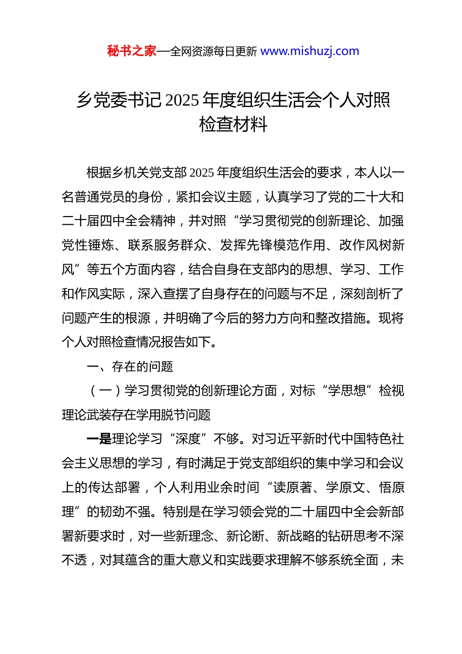 秘书之家—全网资源每日更新 www.mishuzj.com乡党委书记 2025 年度组织生活会个人对照检查材料 根据乡机关党支部 2025 年度组织生活会的要求,本人以一名普通党员的身份,紧扣会议主题,认真学习了党的二十大和二十届四中全会精神,并对照“学习贯彻党的创新理论、加强党性锤炼、联系服务群众、发挥先锋模范作用、改作风树新风”等五个方面内容,结合自身在支部内的思想、学习、工作和作风实际,深入查摆了自身存在的问题与不足,深刻剖析了问题产生的根源,并明确了今后的努力方向和整改措施。现将个人对照检查情况报告如下。一、存在的问题(一)学习贯彻党的创新理论方面,对标“学思想”检视理论武装存在学用脱节问题一是理论学习“深度”不够。对习近平新时代中国特色社会主义思想的学习,有时满足于党支部组织的集中学习和会议上的传达部署,个人利用业余时间“读原著、学原文、悟原理”的韧劲不强。特别是在学习领会党的二十届四中全会新部署新要求时,对一些新理念、新论断、新战略的钻研思考不深不透,对其蕴含的重大意义和实践要求理解不够系统全面,未秘书之家—全网资源每日更新 www.mishuzj.com能完全做到融会贯通。二是成果转化“效度”不高。将党的创新理论与个人思想和工作实际结合不紧密,运用理论指导实践、破解难题的能力存在短板。比如,在思考如何将党的二十届四中全会精神贯彻到我乡乡村振兴的具体实践中时,习惯于从宏观层面思考全乡的产业布局和项目规划,却很少以普通党员的视角,思考如何在支部“党员责任区”内,将“千万工程”经验具体化、本土化,导致理论学习与实际应用之间存在“最后一公里”的隔阂。三是参与研讨“热度”不强。作为一名党员干部,在参加支部“三会一课”和主题党日活动时,有时会不自觉地带着行政领导的思维定式,听得多、讲得少,启发引导多、互动交流少。2025 年支部共组织了 4 次关于党的二十届四中全会精神的专题学习研讨,我在其中两次的发言中,谈宏观形势和全乡工作要求的内容占了绝大部分篇幅,而结合党员身份谈个人学习体会、思想感悟的部分不深不透,未能很好地起到一名普通党员带头交流、抛砖引玉的作用。(二)加强党性锤炼方面,对标“强党性”检视政治忠诚存在淬炼不够问题一是政治淬炼欠缺“硬度”。在复杂严峻的意识形态斗争面前,政治敏锐性和政治鉴别力仍需加强。虽然能做到在大是秘书之家—全网资源每日更新 www.mishuzj.com大非问题上旗帜鲜明、立场坚定,但在面对一些网络上、社会上流传的错误思潮和模糊论调时,有时止步于内心不认同、不传播,缺少挺身而出、坚决斗争的勇气和自觉。对一些“高级黑”“低级红”的言论,满足于“一删了之”“一划而过”,主动站出来批驳澄清、引导舆论的战斗精神不强。二是纪律敬畏未存“戒惧”。对党章党规党纪的学习不深入、不系统,满足于了解大概,对具体条款和要求掌握不精准,未能将其完全内化为行为准则。在日常工作中,能够严格遵守党的政治纪律和政治规矩,但在一些细微之处,自我要求有所放松。比如,在参加支部活动时,有时会因临时有其他公务而迟到或早退,2025 年支部开展的 12 次主题党日活动中,本人因故请假 2 次,虽然履行了报备手续,但这反映出对严格执行党的组织生活制度的敬畏之心不强。三是精神“补钙”尚有“差距”。对标革命先辈和先进典型,感到自身在精神追求和意志品质上还有不小差距。有时因日常行政事务繁忙,放松了对世界观、人生观、价值观这个“总开关”的持续改造,共产党人的精神家园筑得不牢。参加支部组织的红色教育活动,例如去年 7 月参观**革命烈士纪念馆,内心虽有触动,但触动过后深入思考、反躬自省做得不够,未能真正将先辈们的革命精神转化为砥砺党性、指导实践的持秘书之家—全网资源每日更新 www.mishuzj.com久动力。(三)联系服务群众方面,对标“重实践”检视服务群众存在宗旨树得不牢问题一是深入基层“脚印”不深。虽然工作在乡镇,但以普通党员身份主动深入田间地头、农家院落,与群众坐一条板凳、唠家常、听实话的次数不多。更多时候是带着工作任务、带着特定目的下去调研,真正沉下心来,以一名...