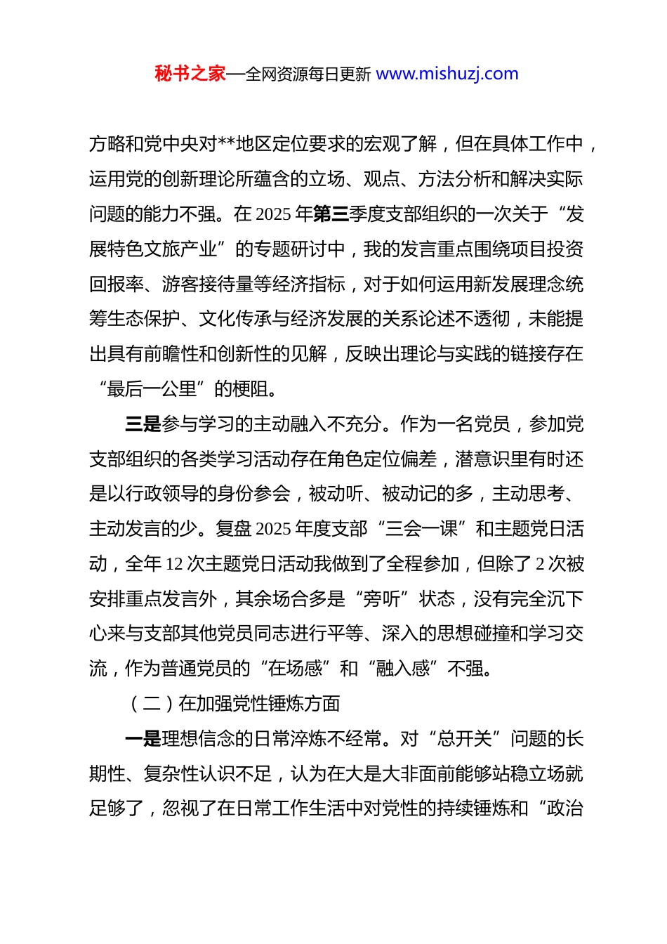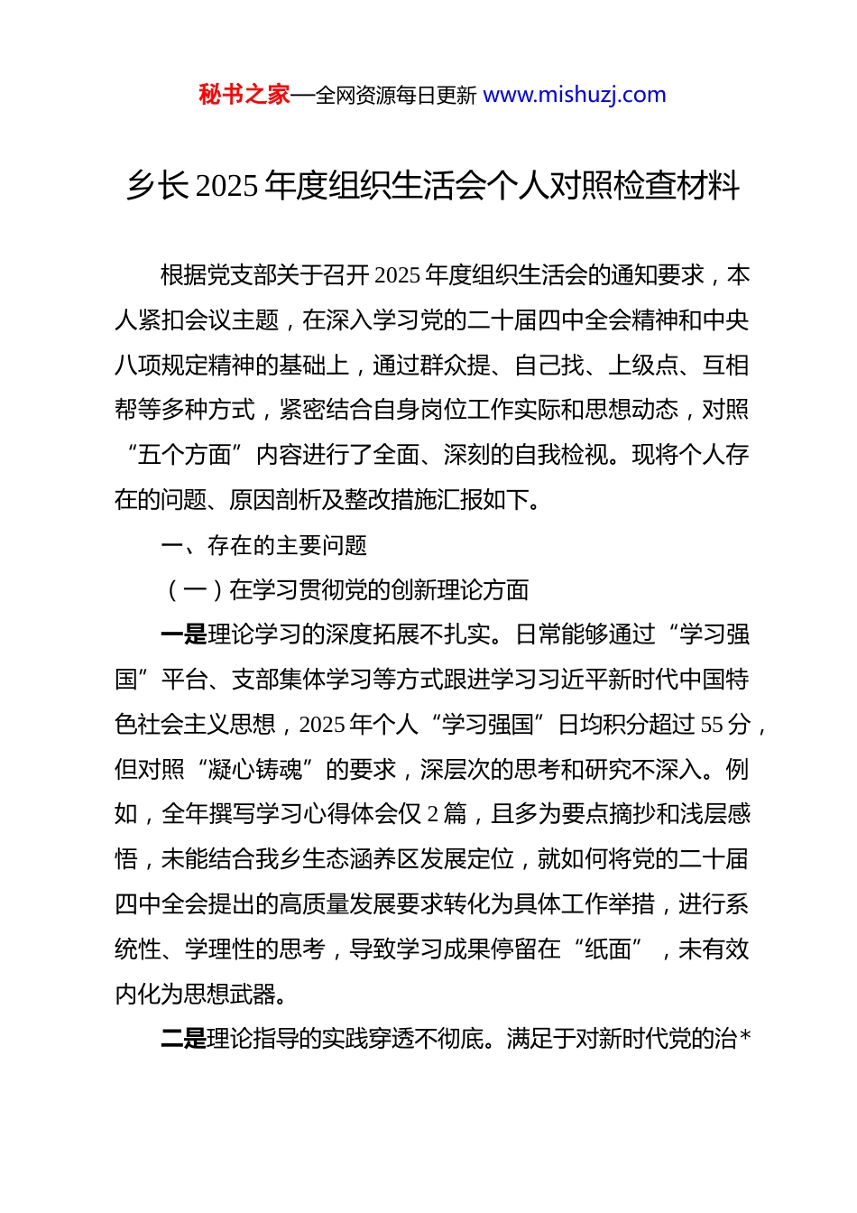 秘书之家—全网资源每日更新 www.mishuzj.com乡长 2025 年度组织生活会个人对照检查材料 根据党支部关于召开 2025 年度组织生活会的通知要求,本人紧扣会议主题,在深入学习党的二十届四中全会精神和中央八项规定精神的基础上,通过群众提、自己找、上级点、互相帮等多种方式,紧密结合自身岗位工作实际和思想动态,对照“五个方面”内容进行了全面、深刻的自我检视。现将个人存在的问题、原因剖析及整改措施汇报如下。一、存在的主要问题(一)在学习贯彻党的创新理论方面一是理论学习的深度拓展不扎实。日常能够通过“学习强国”平台、支部集体学习等方式跟进学习习近平新时代中国特色社会主义思想,2025 年个人“学习强国”日均积分超过 55 分,但对照“凝心铸魂”的要求,深层次的思考和研究不深入。例如,全年撰写学习心得体会仅 2 篇,且多为要点摘抄和浅层感悟,未能结合我乡生态涵养区发展定位,就如何将党的二十届四中全会提出的高质量发展要求转化为具体工作举措,进行系统性、学理性的思考,导致学习成果停留在“纸面”,未有效内化为思想武器。二是理论指导的实践穿透不彻底。满足于对新时代党的治*秘书之家—全网资源每日更新 www.mishuzj.com方略和党中央对**地区定位要求的宏观了解,但在具体工作中,运用党的创新理论所蕴含的立场、观点、方法分析和解决实际问题的能力不强。在 2025 年第三季度支部组织的一次关于“发展特色文旅产业”的专题研讨中,我的发言重点围绕项目投资回报率、游客接待量等经济指标,对于如何运用新发展理念统筹生态保护、文化传承与经济发展的关系论述不透彻,未能提出具有前瞻性和创新性的见解,反映出理论与实践的链接存在“最后一公里”的梗阻。三是参与学习的主动融入不充分。作为一名党员,参加党支部组织的各类学习活动存在角色定位偏差,潜意识里有时还是以行政领导的身份参会,被动听、被动记的多,主动思考、主动发言的少。复盘 2025 年度支部“三会一课”和主题党日活动,全年 12 次主题党日活动我做到了全程参加,但除了 2 次被安排重点发言外,其余场合多是“旁听”状态,没有完全沉下心来与支部其他党员同志进行平等、深入的思想碰撞和学习交流,作为普通党员的“在场感”和“融入感”不强。(二)在加强党性锤炼方面一是理想信念的日常淬炼不经常。对“总开关”问题的长期性、复杂性认识不足,认为在大是大非面前能够站稳立场就足够了,忽视了在日常工作生活中对党性的持续锤炼和“政治秘书之家—全网资源每日更新 www.mishuzj.com体检”。2025 年以来,除了在支部统一安排下重温入党誓词,很少主动、自觉地对照党章党规党纪这面镜子,深究自己的一言一行、一举一动是否完全符合党员标准。与支部其他党员同志开展的谈心谈话,全年仅 6 次,内容也多是交流工作,触及思想灵魂、帮助共同提高的“辣味”不浓。二是政治规矩的边界意识不清醒。虽然能严守不信教的底线,但在一些看似“微小”的事务上,对党的政治纪律和政治规矩的绝对性、严肃性认识不深刻。2025 年 11 月,一位远房亲戚为承揽乡里一项价值约 5 万元的小型绿化工程,专程来访并暗示希望得到关照。尽管我当场明确拒绝,但内心首先闪过的念头是如何委婉回绝而不伤情面,而不是第一时间从严守政治规矩、维护公平正义的高度予以断然拒绝和严肃批评。这种短暂的犹豫,暴露出我在人情与原则考验面前,党性原则的防线扎得不牢。三是斗争精神的实际行动不坚决。在维护民族团结、反对分裂等大是大非问题上,政治立场是坚定的,但在面对网络空间和社会生活中的一些错误思潮和模糊认识时,斗争的勇气和智慧不足。2025 年 8 月,在一个有数百名成员的同乡微信群中,有人散布歪曲我区民族政策的言论,我当时在线却选择了沉默,抱着“不惹事”“怕辩论不清反惹麻烦”的鸵鸟心态,既没有秘书之家—全网资源每日更新 www.mishuzj.com挺身而出予以批驳,也未及时向有关部门报告。这种明哲保身的想法,实质是斗争精神的缺位和党员责任的放弃。(三)在联系服务群众方面一是深入基层的脚步丈量不勤勉。习惯于通过听取汇报、查阅报表、召开会议等方...