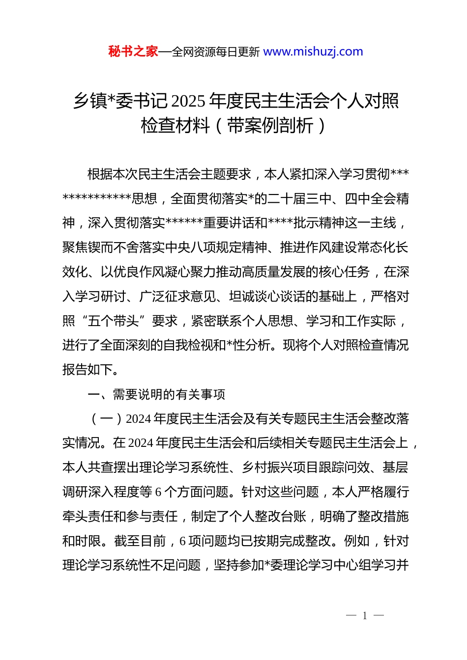 秘书之家—全网资源每日更新 www.mishuzj.com乡镇*委书记 2025 年度民主生活会个人对照检查材料(带案例剖析)根据本次民主生活会主题要求,本人紧扣深入学习贯彻**************思想,全面贯彻落实*的二十届三中、四中全会精神,深入贯彻落实******重要讲话和****批示精神这一主线,聚焦锲而不舍落实中央八项规定精神、推进作风建设常态化长效化、以优良作风凝心聚力推动高质量发展的核心任务,在深入学习研讨、广泛征求意见、坦诚谈心谈话的基础上,严格对照“五个带头”要求,紧密联系个人思想、学习和工作实际,进行了全面深刻的自我检视和*性分析。现将个人对照检查情况报告如下。一、需要说明的有关事项(一)2024 年度民主生活会及有关专题民主生活会整改落实情况。在 2024 年度民主生活会和后续相关专题民主生活会上,本人共查摆出理论学习系统性、乡村振兴项目跟踪问效、基层调研深入程度等 6 个方面问题。针对这些问题,本人严格履行牵头责任和参与责任,制定了个人整改台账,明确了整改措施和时限。截至目前,6 项问题均已按期完成整改。例如,针对理论学习系统性不足问题,坚持参加*委理论学习中心组学习并— 1 —秘书之家—全网资源每日更新 www.mishuzj.com完成个人自学计划,撰写学习心得 4 篇;针对乡村振兴项目跟踪问效问题,牵头建立了重点项目“周调度、月通报”机制,2024 年下半年推动 3 个滞后项目赶上进度。所有整改情况已按规定向县委报告并在一定范围内公开,接受监督。(二)群众反映、巡视巡察反馈、组织约谈函询等情况。2025 年以来,未收到涉及本人的专项巡视巡察反馈意见。在年度考核和日常工作中,收到干部群众通过正常渠道反映的关于优化镇区交通组织、提升便民服务中心效率等意见建议共 5 条,均已采纳并纳入相关工作改进。组织未就有关问题对本人进行约谈函询。(三)个人、家庭、亲属重大事项报告情况。本人严格按照领导干部报告个人有关事项规定,已于年初如实填报。现就相关情况说明如下:一是公务用车配备情况。本人公务用车由镇*政办公室统一调度管理,符合规定标准,无专职司机和秘书配备。二是配偶子女从业情况。配偶在 xx 市 xx 区 xx 中学工作,为在编教师;儿子在 xx 大学就读,尚未就业。本人、配偶、子女均持有中国国籍,无境外永久居留权。三是房产情况。家庭现有自购商品住房两套。第一套位于 xx 市 xx 区 xx 街道 xx 小区,建筑面积 125 平方米,购于 2012 年;第二套位于本县县城 xx小区,建筑面积 98 平方米,购于 2018 年。无福利房、经济适— 2 —秘书之家—全网资源每日更新 www.mishuzj.com用房、限价房、周转房等。四是投资情况。本人持有沪深股市股票,截至 2026 年 1 月 20 日,总市值约 xx 万元;持有公募基金,市值约 xx 万元。上述投资均为本人合法收入购买。本人郑重承诺,不存在利用职权或影响力为亲友牟利的情况。五是婚丧喜庆事宜。2025 年度,本人及直系亲属未操办婚丧喜庆事宜。(四)受到诫勉、dj 政务处分等情况。2025 年度以来,本人未受到任何诫勉、dj 政务处分。二、对照“五个带头”查摆存在的主要问题本人坚持刀刃向内,紧扣主题,围绕“五个带头”深入查摆,共梳理出 15 个具体问题。(一)在带头强化政治忠诚、提高政治能力方面。一是政治判断力不够敏锐,对标看齐存在温差。对*中央决策部署和省委、市委、县委工作要求,有时未能第一时间从政治高度深刻领会其战略意图和实践要求,存在“执行就是忠诚”的简单化认识。例如,在落实“稳定、发展、生态、强边”四件大事本地化部署时,对“稳定”的理解一度局限于社会治安,对意识形态、经济金融等领域的风险关联性、传导性研判不足,2025年第三季度处置某涉企劳资纠纷时,初期未能将其与潜在的群体性事件风险充分关联,政治洞察力有待加强。二是政治领悟力不够透彻,融会贯通存在落差。对*的创新理论,特别是其中— 3 —秘书之家—全网资源每日更新 www.mishuzj.com蕴含的领导方法、思想方法、工作方法,钻研不深、把握不准,未能完全转化为谋划工作的具体思路。学习*的二十届四中...