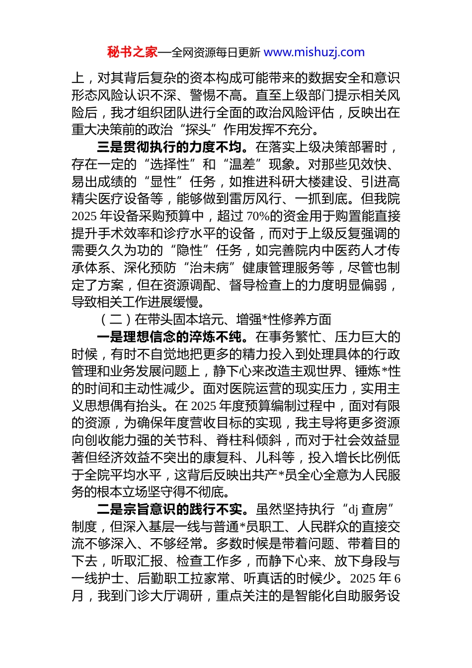 秘书之家—全网资源每日更新 www.mishuzj.com医院*委书记 2025 年度民主生活会个人对照检查材料(带案例)根据上级*委关于召开 2025 年度民主生活会的统一部署,我紧扣会议这一主题,在深入学习研讨和广泛征求意见的基础上,联系思想和工作实际,对照 5 个方面内容,深入查摆了自身存在的问题,深刻剖析了问题根源,明确了今后的努力方向和整改措施。现将个人对照检查情况报告如下。一、存在的问题(一)在带头强化政治忠诚、提高政治能力方面一是理论武装的深度不够。尽管能够坚持参加*委理论学习中心组的每一次集体学习,但对**************思想和*的二十届三中、四中全会精神的钻研缺乏“挤”和“钻”的韧劲。学习过程中,对与医院高质量发展、公立医院改革等直接相关的内容学得比较透彻,而对其中蕴含的宏大理论体系、严密逻辑框架的系统性把握不深。例如在 2025 年第三季度中心组学习会上,我围绕新发展理念如何指导医院打造“xx 区域中医骨伤诊疗中心”谈了具体举措,但对于如何将这一理念完整、准确、全面地贯穿到医院文化建设、人才培养、社会责任等所有领域,思考的广度和深度都显不足,未能做到融会贯通。二是政治判断的锐度不强。面对复杂多变的外部环境和新旧矛盾交织的改革难题,政治敏锐性和政治鉴别力没有达到应有的高度。对一些潜在的风险苗头,有时存在反应不够迅速、研判不够精准的问题。2025 年初,一家数据科技公司提出与我院共建骨科疾病大数据研究平台,我最初的关注点主要集中在其能为我院科研创新带来的技术优势和每年预计可提升科研项目申报成功率 10%的预期效益秘书之家—全网资源每日更新 www.mishuzj.com上,对其背后复杂的资本构成可能带来的数据安全和意识形态风险认识不深、警惕不高。直至上级部门提示相关风险后,我才组织团队进行全面的政治风险评估,反映出在重大决策前的政治“探头”作用发挥不充分。三是贯彻执行的力度不均。在落实上级决策部署时,存在一定的“选择性”和“温差”现象。对那些见效快、易出成绩的“显性”任务,如推进科研大楼建设、引进高精尖医疗设备等,能够做到雷厉风行、一抓到底。但我院2025 年设备采购预算中,超过 70%的资金用于购置能直接提升手术效率和诊疗水平的设备,而对于上级反复强调的需要久久为功的“隐性”任务,如完善院内中医药人才传承体系、深化预防“治未病”健康管理服务等,尽管也制定了方案,但在资源调配、督导检查上的力度明显偏弱,导致相关工作进展缓慢。(二)在带头固本培元、增强*性修养方面一是理想信念的淬炼不纯。在事务繁忙、压力巨大的时候,有时不自觉地把更多的精力投入到处理具体的行政管理和业务发展问题上,静下心来改造主观世界、锤炼*性的时间和主动性减少。面对医院运营的现实压力,实用主义思想偶有抬头。在 2025 年度预算编制过程中,面对有限的资源,为确保年度营收目标的实现,我主导将更多资源向创收能力强的关节科、脊柱科倾斜,而对于社会效益显著但经济效益不突出的康复科、儿科等,投入增长比例低于全院平均水平,这背后反映出共产*员全心全意为人民服务的根本立场坚守得不彻底。二是宗旨意识的践行不实。虽然坚持执行“dj 查房”制度,但深入基层一线与普通*员职工、人民群众的直接交流不够深入、不够经常。多数时候是带着问题、带着目的下去,听取汇报、检查工作多,而静下心来、放下身段与一线护士、后勤职工拉家常、听真话的时候少。2025 年 6月,我到门诊大厅调研,重点关注的是智能化自助服务设秘书之家—全网资源每日更新 www.mishuzj.com备的运行效率和患者排队时间等宏观数据,对于部分老年患者因操作不熟练而产生的焦虑情绪体察不深,未能及时推动优化针对特殊群体的服务流程,说明“以人民为中心”的理念还没有完全内化于心、外化于行。三是斗争精神的发扬不足。随着任职时间的增长,求稳怕乱的思想有所滋生,对于一些长期存在的“老大难”问题,缺乏敢于“亮剑”、一抓到底的锐气和决心。医院内部不同学科之间存在着一定程度的壁垒,协同攻关、交叉研究的氛围不浓,这一问题已持续数年。尽管在多次会议上强调要打破学科壁垒,推动...