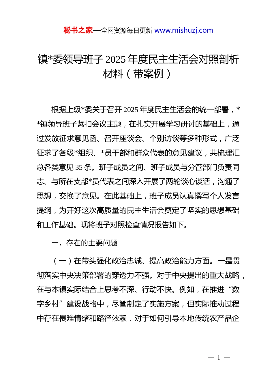 秘书之家—全网资源每日更新 www.mishuzj.com镇*委领导班子 2025 年度民主生活会对照剖析材料(带案例)根据上级*委关于召开 2025 年度民主生活会的统一部署,**镇领导班子紧扣会议主题,在扎实开展学习研讨的基础上,通过发放征求意见函、召开座谈会、个别访谈等多种形式,广泛征求了各级*组织、*员干部和群众代表的意见建议,共梳理汇总各类意见 35 条。班子成员之间、班子成员与分管部门负责同志、与所在支部*员代表之间深入开展了两轮谈心谈话,沟通了思想,交换了意见。在此基础上,班子成员认真撰写个人发言提纲,为开好这次高质量的民主生活会奠定了坚实的思想基础和工作基础。现将班子对照检查情况报告如下。一、存在的主要问题(一)在带头强化政治忠诚、提高政治能力方面。一是贯彻落实中央决策部署的穿透力不强。对于中央提出的重大战略,在与本镇实际结合上思考不深、行动不快。例如,在推进“数字乡村”建设战略中,尽管制定了实施方案,但实际推动过程中存在畏难情绪和路径依赖,对于如何引导本地传统农产品企— 1 —秘书之家—全网资源每日更新 www.mishuzj.com业利用电商平台拓展销路缺乏有效手段。二是驾驭复杂局面的政治判断力不准。面对意识形态领域的复杂斗争和网络舆情的新挑战,部分班子成员的敏锐性和鉴别力不足。在 2025 年第三季度,我镇推进一项工业园区土地用途调整工作时,未能充分预判其可能引发的社会稳定风险,对少数村民因补偿预期不符而产生的负面情绪疏于引导,导致相关不实信息在网络平台发酵,镇政府虽然最终平息了事态,但前期处置的被动局面暴露了班子在重大决策社会风险评估上的政治洞察力缺失,收到了3 起正式的村民投诉。三是应对风险挑战的政治领悟力不透。面对经济下行压力和日益激烈的区域竞争,班子在抢抓机遇、化危为机上的战略定力不足。2025 年上半年,在申报一项自治区级现代农业产业示范园项目时,面对申报材料要求高、竞争对手实力强的局面,一度产生了“争不上、不如不争”的消极思想,导致项目准备工作启动缓慢,险些错失申报窗口期。这反映出班子在领悟“国之大者”、胸怀“两个大局”上站位不高,缺乏“不进则退、慢进亦退”的忧患意识和必胜信心。(二)在带头固本培元、增强*性方面。一是理论学习的系统性和转化率不好。虽然能够严格执行*委理论学习中心组学习制度,但学习方式较为单一,多以“领学通读”为主,深入研— 2 —秘书之家—全网资源每日更新 www.mishuzj.com讨和思想碰撞不足。在 2025 年第四季度学习*的二十届四中全会精神专题研讨中,有 2 名班子成员的发言材料仅仅是原文摘抄和浅层理解,没有紧密联系分管工作和全镇发展实际,存在“学用脱节”现象,未能真正将*的创新理论转化为谋划工作的思路、促进发展的举措。二是理想信念的坚守和淬炼不实。在长期和平环境和相对复杂的社会思潮影响下,部分同志革命意志有所消退,艰苦奋斗的精神有所弱化。虽然口头上强调理想信念,但内心深处对实现共产主义远大理想的长期性、艰巨性认识不深,有时会私下里流露出“工作任务重、压力大、身心俱疲”的抱怨情绪,共产*人应有的那么一股子革命加拼命的强大精神支撑有所松动。三是道德品行的砥砺和约束不严。班子成员总体能够做到廉洁自律,但对照更高标准,仍存在律己不严、防微杜渐意识不强的问题。例如,个别领导干部在与企业家交往中,界限感把握不清晰,曾受邀参加某本地企业举办的“新产品发布品鉴会”,虽然名义上是公务活动,但活动规模和标准超出了正常范围,带有明显的宴请性质。这种行为虽然未构成严重违纪,但反映出在净化社交圈、生活圈上,抵制不良风气的思想防线构筑得不牢。(三)在带头敬畏人民、敬畏组织、敬畏法纪方面。一是— 3 —秘书之家—全网资源每日更新 www.mishuzj.com深入践行群众路线的自觉性不高。落实“四下基层”制度存在形式主义倾向,下基层的次数虽然达标,但质量不优。据统计,2025 年下半年班子成员人均下乡调研 15 次,但其中超过 10 次是陪同上级或沿固定线路“走马观花”,真正带着问题、沉到一线的“解剖麻雀”式调研不多。**村 120 户村民反...