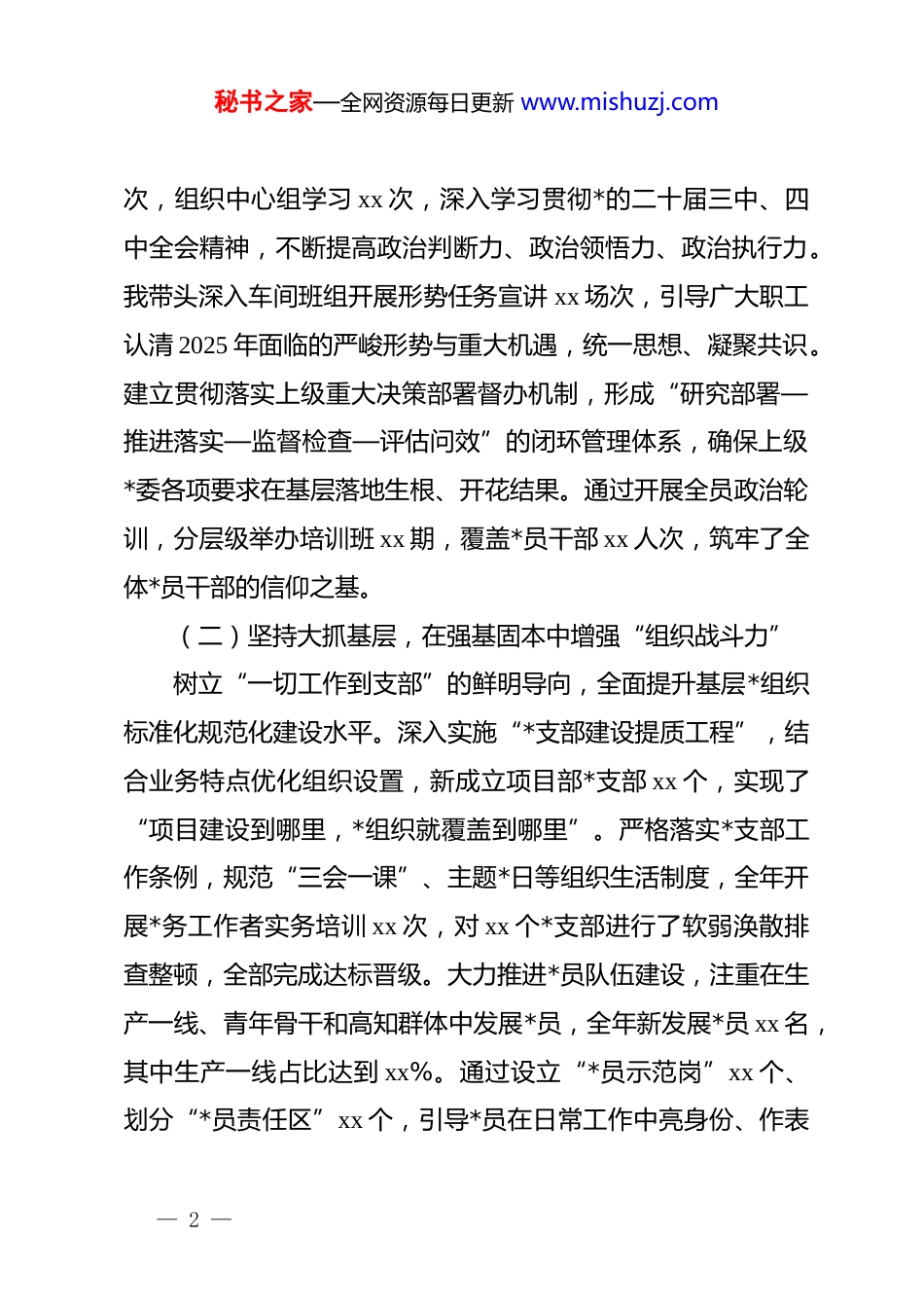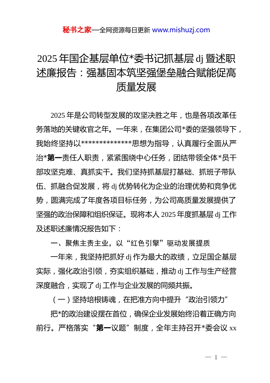 秘书之家—全网资源每日更新 www.mishuzj.com2025 年国企基层单位*委书记抓基层 dj 暨述职述廉报告:强基固本筑坚强堡垒融合赋能促高质量发展2025 年是公司转型发展的攻坚决胜之年,也是各项改革任务落地的关键收官之年。一年来,在集团公司*委的坚强领导下,我始终坚持以**************思想为指导,认真履行全面从严治*第一责任人职责,紧紧围绕中心任务,团结带领全体*员干部攻坚克难、真抓实干。我们坚持抓基层打基础、抓班子带队伍、抓融合促发展,将 dj 优势转化为企业的治理优势和竞争优势,圆满完成了年度各项目标任务,为公司高质量发展提供了坚强的政治保障和组织保证。现将本人 2025 年度抓基层 dj 工作及述职述廉情况报告如下:一、聚焦主责主业,以“红色引擎”驱动发展提质一年来,我坚持把抓好 dj 作为最大的政绩,立足国企基层实际,强化政治引领,夯实组织基础,推动 dj 工作与生产经营深度融合,实现了 dj 工作与企业发展的同频共振。(一)坚持培根铸魂,在把准方向中提升“政治引领力”把*的政治建设摆在首位,确保企业发展始终沿着正确方向前行。严格落实“第一议题”制度,全年主持召开*委会议 xx— 1 —秘书之家—全网资源每日更新 www.mishuzj.com次,组织中心组学习 xx 次,深入学习贯彻*的二十届三中、四中全会精神,不断提高政治判断力、政治领悟力、政治执行力。我带头深入车间班组开展形势任务宣讲 xx 场次,引导广大职工认清 2025 年面临的严峻形势与重大机遇,统一思想、凝聚共识。建立贯彻落实上级重大决策部署督办机制,形成“研究部署—推进落实—监督检查—评估问效”的闭环管理体系,确保上级*委各项要求在基层落地生根、开花结果。通过开展全员政治轮训,分层级举办培训班 xx 期,覆盖*员干部 xx 人次,筑牢了全体*员干部的信仰之基。(二)坚持大抓基层,在强基固本中增强“组织战斗力”树立“一切工作到支部”的鲜明导向,全面提升基层*组织标准化规范化建设水平。深入实施“*支部建设提质工程”,结合业务特点优化组织设置,新成立项目部*支部 xx 个,实现了“项目建设到哪里,*组织就覆盖到哪里”。严格落实*支部工作条例,规范“三会一课”、主题*日等组织生活制度,全年开展*务工作者实务培训 xx 次,对 xx 个*支部进行了软弱涣散排查整顿,全部完成达标晋级。大力推进*员队伍建设,注重在生产一线、青年骨干和高知群体中发展*员,全年新发展*员 xx 名,其中生产一线占比达到 xx%。通过设立“*员示范岗”xx 个、划分“*员责任区”xx 个,引导*员在日常工作中亮身份、作表— 2 —秘书之家—全网资源每日更新 www.mishuzj.com率,基层*组织的战斗堡垒作用显著增强。(三)坚持互融互促,在攻坚克难中激活“发展源动力”坚决破除“两张皮”现象,找准 dj 工作与生产经营的结合点和着力点。深入开展“dj+”工程,围绕年度重点难点任务,组建 xx 支“*员突击队”和 xx 个“*员攻关小组”,在技术革新、市场开拓、成本管控等主战场攻坚克难。例如,在 xx 重点项目中,*员突击队冲锋在前,克服恶劣环境影响,提前 xx 天完成交付任务,节约成本 xx 万元。深化“书记领题”项目,我亲自挂帅 xx 项重点课题,带动班子成员和支部书记认领攻坚项目 xx 个,解决了一批制约企业发展的瓶颈问题。积极开展劳动竞赛和技能比武,将 dj 考核结果与绩效薪酬刚性挂钩,dj 考核权重由原来的 xx%提升至 xx%,有效激发了全员干事创业的热情,全年实现营业收入 xx 亿元,同比增长 xx%。(四)坚持从严治*,在正风肃纪中强化“廉洁免疫力”认真履行*风廉政建设主体责任,持之以恒正风肃纪反腐。年初与各支部书记、部门负责人签订《*风廉政建设责任书》xx份,层层传导压力,压实“一岗双责”。常态化开展 dj 学习教育,组织参观警示教育基地、观看警示教育片,利用身边事教育身边人,全年开展廉洁谈话 xx 人次。紧盯关键少数和重点领域,加强对招投标、物资采购、选人用人等环节的监督检查,— 3 —秘书之家—全网资源每日更新 www.mishuzj.com开展专项巡察 xx 次,发现并整改问题...