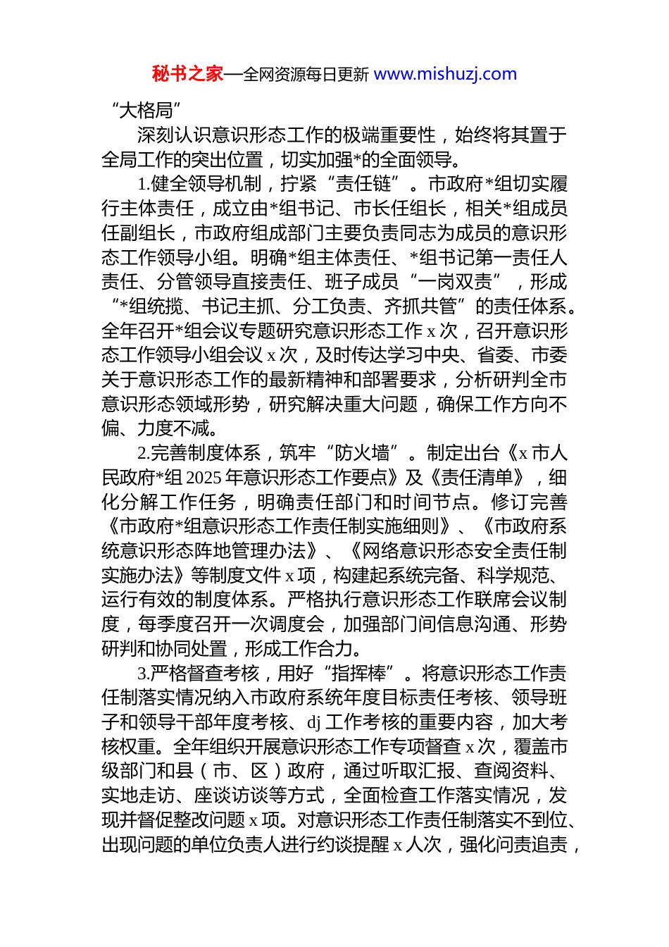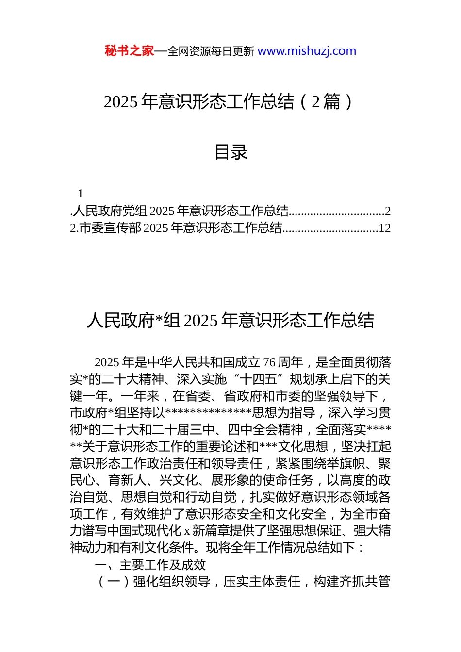 秘书之家—全网资源每日更新 www.mishuzj.com2025 年意识形态工作总结(2 篇)目录1.人民政府党组 2025 年意识形态工作总结...............................22.市委宣传部 2025 年意识形态工作总结...............................12人民政府*组 2025 年意识形态工作总结2025 年是中华人民共和国成立 76 周年,是全面贯彻落实*的二十大精神、深入实施“十四五”规划承上启下的关键一年。一年来,在省委、省政府和市委的坚强领导下,市政府*组坚持以**************思想为指导,深入学习贯彻*的二十大和二十届三中、四中全会精神,全面落实******关于意识形态工作的重要论述和***文化思想,坚决扛起意识形态工作政治责任和领导责任,紧紧围绕举旗帜、聚民心、育新人、兴文化、展形象的使命任务,以高度的政治自觉、思想自觉和行动自觉,扎实做好意识形态领域各项工作,有效维护了意识形态安全和文化安全,为全市奋力谱写中国式现代化 x 新篇章提供了坚强思想保证、强大精神动力和有利文化条件。现将全年工作情况总结如下:一、主要工作及成效(一)强化组织领导,压实主体责任,构建齐抓共管秘书之家—全网资源每日更新 www.mishuzj.com“大格局”深刻认识意识形态工作的极端重要性,始终将其置于全局工作的突出位置,切实加强*的全面领导。1.健全领导机制,拧紧“责任链”。市政府*组切实履行主体责任,成立由*组书记、市长任组长,相关*组成员任副组长,市政府组成部门主要负责同志为成员的意识形态工作领导小组。明确*组主体责任、*组书记第一责任人责任、分管领导直接责任、班子成员“一岗双责”,形成“*组统揽、书记主抓、分工负责、齐抓共管”的责任体系。全年召开*组会议专题研究意识形态工作 x 次,召开意识形态工作领导小组会议 x 次,及时传达学习中央、省委、市委关于意识形态工作的最新精神和部署要求,分析研判全市意识形态领域形势,研究解决重大问题,确保工作方向不偏、力度不减。2.完善制度体系,筑牢“防火墙”。制定出台《x 市人民政府*组 2025 年意识形态工作要点》及《责任清单》,细化分解工作任务,明确责任部门和时间节点。修订完善《市政府*组意识形态工作责任制实施细则》、《市政府系统意识形态阵地管理办法》、《网络意识形态安全责任制实施办法》等制度文件 x 项,构建起系统完备、科学规范、运行有效的制度体系。严格执行意识形态工作联席会议制度,每季度召开一次调度会,加强部门间信息沟通、形势研判和协同处置,形成工作合力。3.严格督查考核,用好“指挥棒”。将意识形态工作责任制落实情况纳入市政府系统年度目标责任考核、领导班子和领导干部年度考核、dj 工作考核的重要内容,加大考核权重。全年组织开展意识形态工作专项督查 x 次,覆盖市级部门和县(市、区)政府,通过听取汇报、查阅资料、实地走访、座谈访谈等方式,全面检查工作落实情况,发现并督促整改问题 x 项。对意识形态工作责任制落实不到位、出现问题的单位负责人进行约谈提醒 x 人次,强化问责追责,秘书之家—全网资源每日更新 www.mishuzj.com推动责任层层压实、压力级级传导。(二)深化理论武装,筑牢思想根基,凝聚团结奋斗“向心力”坚持把学习贯彻**************思想作为首要政治任务,持续在学懂弄通做实上下功夫,夯实全市上下团结奋斗的共同思想基础。1.发挥“头雁效应”,抓实中心组学习。严格落实“第一议题”制度,市政府*组理论学习中心组全年组织集体学习共 x 次,其中围绕意识形态、文化强国建设、网络强国建设等专题开展深入学习研讨 x 次。*组书记带头领学、带头研讨、带头撰写理论文章,班子成员结合分管领域深入交流。举办学习贯彻***文化思想专题读书班,组织专题辅导报告 x 场,推动*的创新理论入脑入心、见行见效。2.创新学习载体,推动全员覆盖。综合运用专题讲座、辅导报告、在线学习、现场教学等多种形式,丰富学习载体。邀请国内知名专家学者围绕意识形态安全、全媒体传播、文化自信等主题作辅导报告 x 场。组织市政府系统*员干部赴 x 革命纪念馆等开展沉浸式现场教学 x 批次。依托“学习强国”学习...
