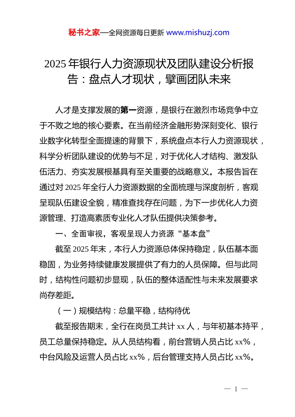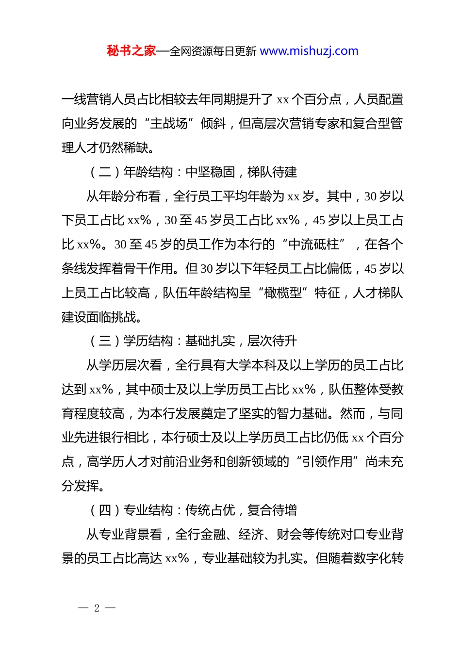秘书之家—全网资源每日更新 www.mishuzj.com2025 年银行人力资源现状及团队建设分析报告:盘点人才现状,擘画团队未来人才是支撑发展的第一资源,是银行在激烈市场竞争中立于不败之地的核心要素。在当前经济金融形势深刻变化、银行业数字化转型全面提速的背景下,系统盘点本行人力资源现状,科学分析团队建设的优势与不足,对于优化人才结构、激发队伍活力、夯实发展根基具有至关重要的战略意义。本报告旨在通过对 2025 年全行人力资源数据的全面梳理与深度剖析,客观呈现队伍建设全貌,精准查找存在问题,为下一步优化人力资源管理、打造高素质专业化人才队伍提供决策参考。一、全面审视,客观呈现人力资源“基本盘”截至 2025 年末,本行人力资源总体保持稳定,队伍基本面稳固,为业务持续健康发展提供了有力的人员保障。但与此同时,结构性问题初步显现,队伍的整体适配性与未来发展要求尚存差距。(一)规模结构:总量平稳,结构待优截至报告期末,全行在岗员工共计 xx 人,与年初基本持平,员工总量保持稳定。从人员结构看,前台营销人员占比 xx%,中台风险及运营人员占比 xx%,后台管理支持人员占比 xx%。— 1 —秘书之家—全网资源每日更新 www.mishuzj.com一线营销人员占比相较去年同期提升了 xx 个百分点,人员配置向业务发展的“主战场”倾斜,但高层次营销专家和复合型管理人才仍然稀缺。(二)年龄结构:中坚稳固,梯队待建从年龄分布看,全行员工平均年龄为 xx 岁。其中,30 岁以下员工占比 xx%,30 至 45 岁员工占比 xx%,45 岁以上员工占比 xx%。30 至 45 岁的员工作为本行的“中流砥柱”,在各个条线发挥着骨干作用。但 30 岁以下年轻员工占比偏低,45 岁以上员工占比较高,队伍年龄结构呈“橄榄型”特征,人才梯队建设面临挑战。(三)学历结构:基础扎实,层次待升从学历层次看,全行具有大学本科及以上学历的员工占比达到 xx%,其中硕士及以上学历员工占比 xx%,队伍整体受教育程度较高,为本行发展奠定了坚实的智力基础。然而,与同业先进银行相比,本行硕士及以上学历员工占比仍低 xx 个百分点,高学历人才对前沿业务和创新领域的“引领作用”尚未充分发挥。(四)专业结构:传统占优,复合待增从专业背景看,全行金融、经济、财会等传统对口专业背景的员工占比高达 xx%,专业基础较为扎实。但随着数字化转— 2 —秘书之家—全网资源每日更新 www.mishuzj.com型的深入,市场对既懂金融又懂科技、数据、法律的复合型人才需求日益迫切,本行科技类专业背景员工占比仅为 xx%,大数据分析、人工智能等新兴领域专业人才储备严重不足,难以满足“科技兴行”战略对人才的需求。二、深刻剖析,精准透视团队建设“梗阻点”对照高质量发展要求和市场竞争态势,本行在人才队伍建设方面仍存在若干亟待破解的瓶颈和难题,这些“梗阻点”在一定程度上制约了组织效能的进一步提升。(一)复合型人才供给存“短板”随着利率市场化改革的深化和金融科技的冲击,传统的业务模式和人才能力模型已难以适应新的竞争环境。本行目前最为突出的问题是,既精通传统银行业务,又熟悉数字化营销、大数据风控、场景化金融的“复合型人才”供给严重不足。这直接导致我行在产品创新、业务转型和精细化管理方面推进缓慢,难以快速响应市场变化。(二)市场化激励机制显“温吞”本行现行的薪酬激励体系仍带有较强的“大锅饭”色彩,绩效考核与薪酬分配的关联度不强,未能真正实现按贡献度精准分配。与互联网公司、金融科技公司提供的市场化、高弹性的薪酬包相比,本行对顶尖人才的吸引力明显不足。同时,对— 3 —秘书之家—全网资源每日更新 www.mishuzj.com于一线营销人员和核心骨干的激励力度不够,导致部分优秀人才流失,员工队伍的整体“狼性”不足。(三)专业化培训体系存“偏差”尽管本行每年投入大量资源用于员工培训,但培训内容与业务需求、岗位要求结合不够紧密,存在“供需错配”现象。培训多以传统的课堂讲授为主,针对数字化能力、复杂产品销售能力、资产配置能力等核心专业技能的实战化训练较少。培训效果的评估与转化机制不健...