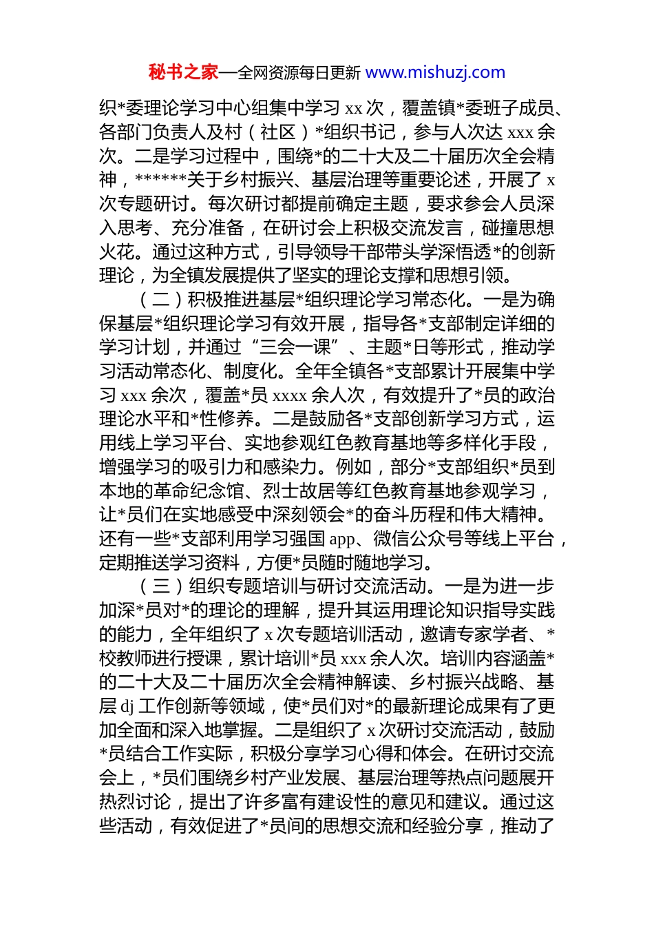 秘书之家—全网资源每日更新 www.mishuzj.comxx*政办主任、*工委书记 2025 年个人工作总结(2 篇)目录1.党政办主任 2025 年个人工作总结(镇乡)...........................22.党工委书记 2025 年个人工作总结(街道).......................12*政办主任 2025 年个人工作总结(镇乡)xxxx 年转瞬即逝,在镇*委的坚强领导下,我作为镇*办主任,始终怀着对*的无限忠诚和对工作的高度责任感,紧紧围绕镇*委中心工作,全力以赴推动*办各项任务的落实,为全镇高质量发展提供了坚实的 dj 支撑和高效的综合服务。现将一年来的工作情况汇报如下:一、强化理论武装,筑牢思想根基,提升干部政治素养(一)精心组织*委理论学习中心组学习。一是始终将学习贯彻**************思想作为首要政治任务,年初牵头制定了《xxxx 年镇*委理论学习中心组学习计划》,确保学习内容丰富多样、形式灵活多变、针对性强。全年共组秘书之家—全网资源每日更新 www.mishuzj.com织*委理论学习中心组集中学习 xx 次,覆盖镇*委班子成员、各部门负责人及村(社区)*组织书记,参与人次达 xxx 余次。二是学习过程中,围绕*的二十大及二十届历次全会精神,******关于乡村振兴、基层治理等重要论述,开展了 x次专题研讨。每次研讨都提前确定主题,要求参会人员深入思考、充分准备,在研讨会上积极交流发言,碰撞思想火花。通过这种方式,引导领导干部带头学深悟透*的创新理论,为全镇发展提供了坚实的理论支撑和思想引领。(二)积极推进基层*组织理论学习常态化。一是为确保基层*组织理论学习有效开展,指导各*支部制定详细的学习计划,并通过“三会一课”、主题*日等形式,推动学习活动常态化、制度化。全年全镇各*支部累计开展集中学习 xxx 余次,覆盖*员 xxxx 余人次,有效提升了*员的政治理论水平和*性修养。二是鼓励各*支部创新学习方式,运用线上学习平台、实地参观红色教育基地等多样化手段,增强学习的吸引力和感染力。例如,部分*支部组织*员到本地的革命纪念馆、烈士故居等红色教育基地参观学习,让*员们在实地感受中深刻领会*的奋斗历程和伟大精神。还有一些*支部利用学习强国 app、微信公众号等线上平台,定期推送学习资料,方便*员随时随地学习。(三)组织专题培训与研讨交流活动。一是为进一步加深*员对*的理论的理解,提升其运用理论知识指导实践的能力,全年组织了 x 次专题培训活动,邀请专家学者、*校教师进行授课,累计培训*员 xxx 余人次。培训内容涵盖*的二十大及二十届历次全会精神解读、乡村振兴战略、基层 dj 工作创新等领域,使*员们对*的最新理论成果有了更加全面和深入地掌握。二是组织了 x 次研讨交流活动,鼓励*员结合工作实际,积极分享学习心得和体会。在研讨交流会上,*员们围绕乡村产业发展、基层治理等热点问题展开热烈讨论,提出了许多富有建设性的意见和建议。通过这些活动,有效促进了*员间的思想交流和经验分享,推动了秘书之家—全网资源每日更新 www.mishuzj.com理论学习成果的转化和应用。二、深化 dj 引领,夯实基层基础,增强*组织战斗力(一)推进基层*组织标准化规范化建设。一是以提升组织力为核心,大力推进基层*组织标准化规范化建设。牵头开展了*支部星级评定工作,对照“班子建设、*员管理、组织生活、作用发挥”等 x 项核心指标,对全镇 xx 个村(社区)*支部进行了全面、细致的检查。二通过评定,共评选出“五星级*支部”x 个、“四星级*支部”x 个,为其他*支部树立了榜样。同时,针对评定过程中发现的薄弱环节,制定了详细的整改清单,共计 xx 条,明确了整改责任人和整改时限,持续跟踪整改情况。定期对整改情况进行检查评估,对整改不力的*支部进行督促指导,推动基层*组织全面进步、全面过硬,有效提升了基层*组织的凝聚力和战斗力。(二)严格执行*员教育管理监督制度。一是在*员教育管理监督方面,坚持严格遵循*员发展程序,全年成功发展新*员 xx 名,为*组织注入了新鲜血液。办理转正*员 xx名,进一步壮大了*员队伍。组织入*积极分子培训 x 期,培训人数达 xx 余人,帮助入*积极分子深入学习*...