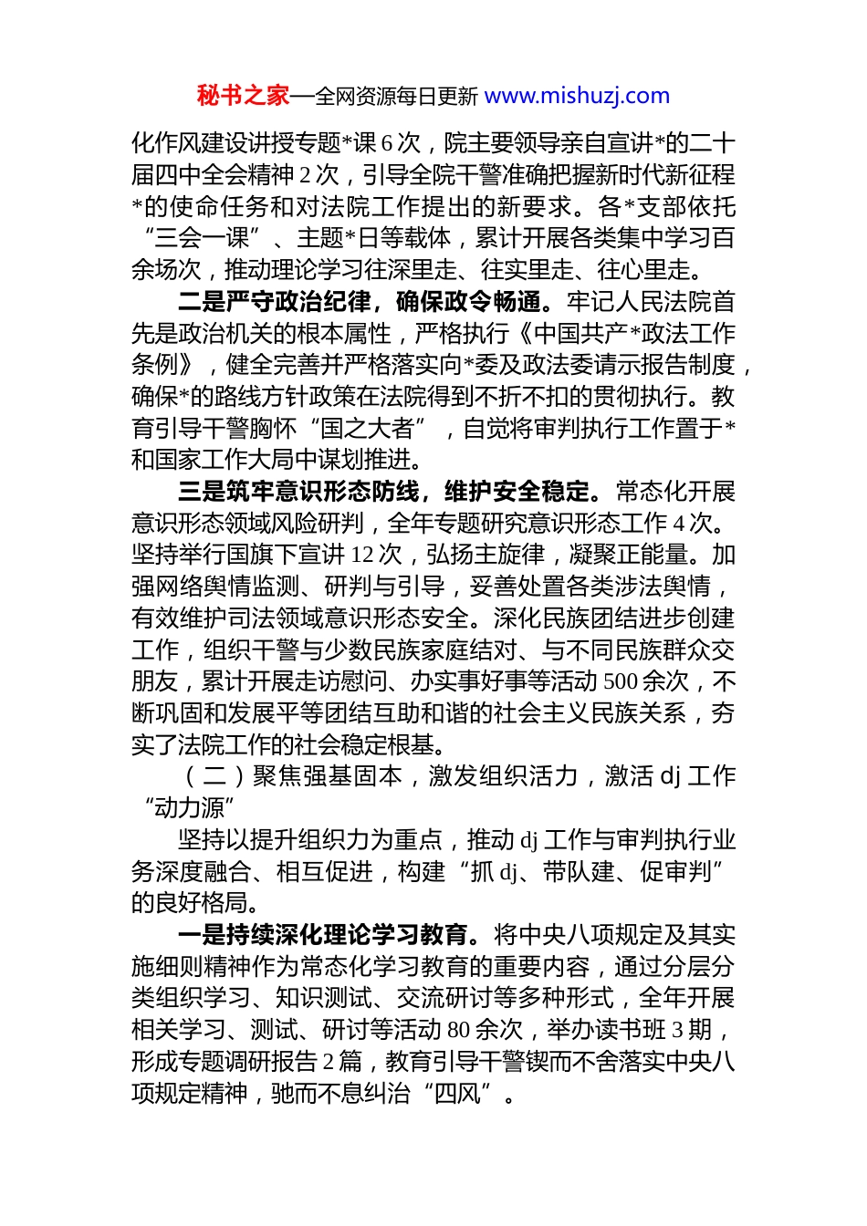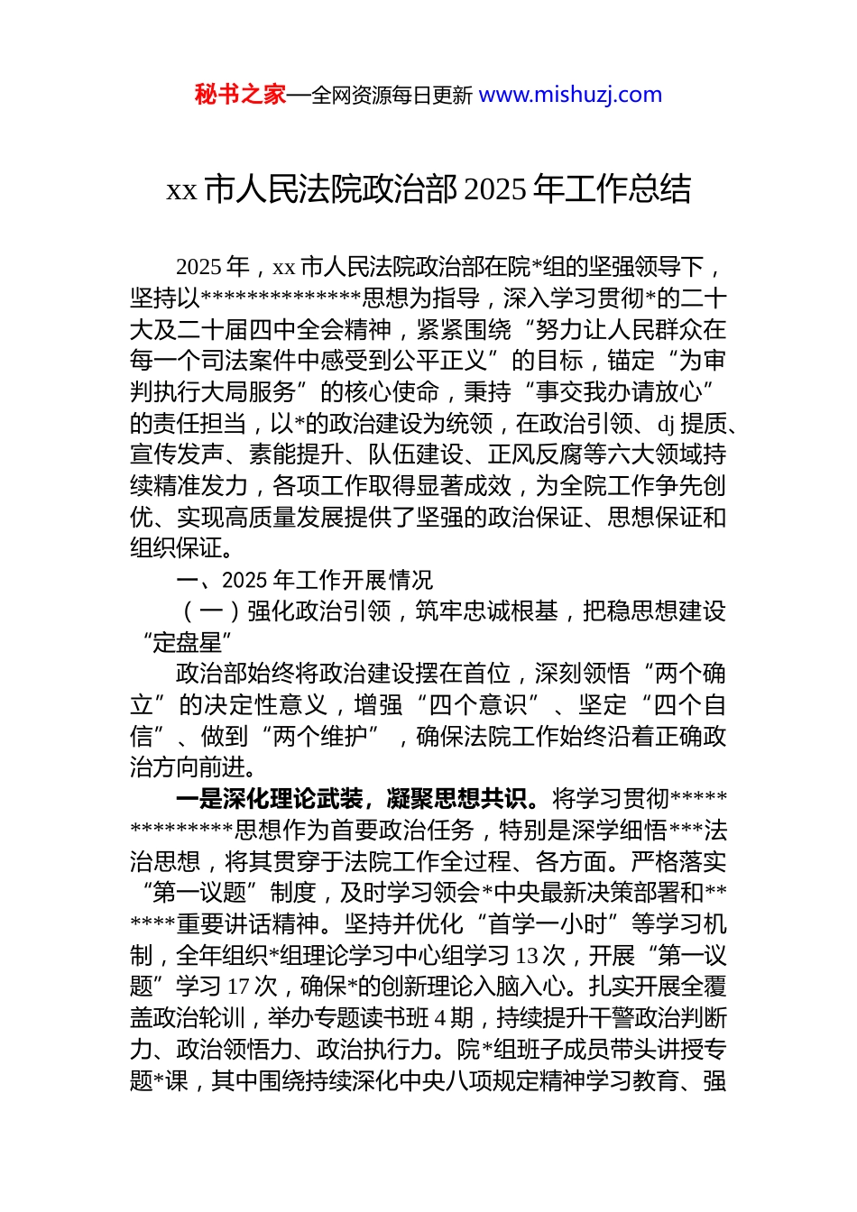 秘书之家—全网资源每日更新 www.mishuzj.comxx 市人民法院政治部 2025 年工作总结2025 年,xx 市人民法院政治部在院*组的坚强领导下,坚持以**************思想为指导,深入学习贯彻*的二十大及二十届四中全会精神,紧紧围绕“努力让人民群众在每一个司法案件中感受到公平正义”的目标,锚定“为审判执行大局服务”的核心使命,秉持“事交我办请放心”的责任担当,以*的政治建设为统领,在政治引领、dj 提质、宣传发声、素能提升、队伍建设、正风反腐等六大领域持续精准发力,各项工作取得显著成效,为全院工作争先创优、实现高质量发展提供了坚强的政治保证、思想保证和组织保证。一、2025 年工作开展情况(一)强化政治引领,筑牢忠诚根基,把稳思想建设“定盘星”政治部始终将政治建设摆在首位,深刻领悟“两个确立”的决定性意义,增强“四个意识”、坚定“四个自信”、做到“两个维护”,确保法院工作始终沿着正确政治方向前进。一是深化理论武装,凝聚思想共识。将学习贯彻**************思想作为首要政治任务,特别是深学细悟***法治思想,将其贯穿于法院工作全过程、各方面。严格落实“第一议题”制度,及时学习领会*中央最新决策部署和******重要讲话精神。坚持并优化“首学一小时”等学习机制,全年组织*组理论学习中心组学习 13 次,开展“第一议题”学习 17 次,确保*的创新理论入脑入心。扎实开展全覆盖政治轮训,举办专题读书班 4 期,持续提升干警政治判断力、政治领悟力、政治执行力。院*组班子成员带头讲授专题*课,其中围绕持续深化中央八项规定精神学习教育、强秘书之家—全网资源每日更新 www.mishuzj.com化作风建设讲授专题*课 6 次,院主要领导亲自宣讲*的二十届四中全会精神 2 次,引导全院干警准确把握新时代新征程*的使命任务和对法院工作提出的新要求。各*支部依托“三会一课”、主题*日等载体,累计开展各类集中学习百余场次,推动理论学习往深里走、往实里走、往心里走。二是严守政治纪律,确保政令畅通。牢记人民法院首先是政治机关的根本属性,严格执行《中国共产*政法工作条例》,健全完善并严格落实向*委及政法委请示报告制度,确保*的路线方针政策在法院得到不折不扣的贯彻执行。教育引导干警胸怀“国之大者”,自觉将审判执行工作置于*和国家工作大局中谋划推进。三是筑牢意识形态防线,维护安全稳定。常态化开展意识形态领域风险研判,全年专题研究意识形态工作 4 次。坚持举行国旗下宣讲 12 次,弘扬主旋律,凝聚正能量。加强网络舆情监测、研判与引导,妥善处置各类涉法舆情,有效维护司法领域意识形态安全。深化民族团结进步创建工作,组织干警与少数民族家庭结对、与不同民族群众交朋友,累计开展走访慰问、办实事好事等活动 500 余次,不断巩固和发展平等团结互助和谐的社会主义民族关系,夯实了法院工作的社会稳定根基。(二)聚焦强基固本,激发组织活力,激活 dj 工作“动力源”坚持以提升组织力为重点,推动 dj 工作与审判执行业务深度融合、相互促进,构建“抓 dj、带队建、促审判”的良好格局。一是持续深化理论学习教育。将中央八项规定及其实施细则精神作为常态化学习教育的重要内容,通过分层分类组织学习、知识测试、交流研讨等多种形式,全年开展相关学习、测试、研讨等活动 80 余次,举办读书班 3 期,形成专题调研报告 2 篇,教育引导干警锲而不舍落实中央八项规定精神,驰而不息纠治“四风”。秘书之家—全网资源每日更新 www.mishuzj.com二是夯实基层组织基础。优化*支部设置,完成支委补选工作,配齐配强*务干部力量。规范组织生活,严格落实“三会一课”、组织生活会、民主评议*员等制度,全年召开支委会议、*员大会 90 余次,不断提升*支部标准化规范化建设水平。以创建“五个好”标准化规范化*支部为契机,下发 dj 任务清单 9 次,开展 dj 业务培训 2 次,该院第二*支部成功获评市级“五个好”标准化规范化*支部,发挥了示范引领作用。三是打造特色 dj 品牌。深化“支部建在庭上”实践,着力培育“一支部一特色”dj 品牌,积极推荐优秀*支部参加市级 dj 品牌展...