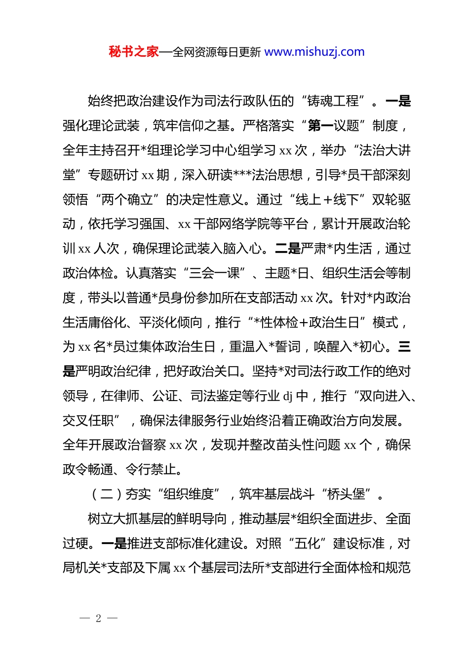 秘书之家—全网资源每日更新 www.mishuzj.comxx 县司法局*组书记、局长 2025 年度抓基层 dj工作述职报告:筑牢法治堡垒锻造司法铁军各位领导、同志们:2025 年是全面深化改革、推进中国式现代化建设的关键之年,也是我县司法行政工作攻坚克难、提质增效的决胜之年。一年来,按照县委 dj 工作总体部署,我认真履行抓基层 dj“第一责任人”职责,坚持以**************思想为指导,深入贯彻***法治思想,紧扣“围绕中心抓 dj,抓好 dj 促法治”的工作思路,团结带领全局*员干部,将*旗插在法律服务一线,将堡垒筑在司法行政前沿,以高质量 dj 引领全县司法行政事业高质量发展。现将本人 2025 年度履行基层 dj 工作责任情况述职如下。一、聚焦“三个维度”,答好“初心答卷”,推动 dj 引领提质增效一年来,我坚持把政治建设摆在首位,以提升组织力为重点,注重 dj 与业务深度融合,不仅在“面”上抓覆盖,更在“质”上求突破,推动基层 dj 工作由“虚”变“实”、由“有”变“优”。(一)紧扣“政治维度”,把稳思想领航“方向盘”。— 1 —秘书之家—全网资源每日更新 www.mishuzj.com始终把政治建设作为司法行政队伍的“铸魂工程”。一是强化理论武装,筑牢信仰之基。严格落实“第一议题”制度,全年主持召开*组理论学习中心组学习 xx 次,举办“法治大讲堂”专题研讨 xx 期,深入研读***法治思想,引导*员干部深刻领悟“两个确立”的决定性意义。通过“线上+线下”双轮驱动,依托学习强国、xx 干部网络学院等平台,累计开展政治轮训 xx 人次,确保理论武装入脑入心。二是严肃*内生活,通过政治体检。认真落实“三会一课”、主题*日、组织生活会等制度,带头以普通*员身份参加所在支部活动 xx 次。针对*内政治生活庸俗化、平淡化倾向,推行“*性体检+政治生日”模式,为 xx 名*员过集体政治生日,重温入*誓词,唤醒入*初心。三是严明政治纪律,把好政治关口。坚持*对司法行政工作的绝对领导,在律师、公证、司法鉴定等行业 dj 中,推行“双向进入、交叉任职”,确保法律服务行业始终沿着正确政治方向发展。全年开展政治督察 xx 次,发现并整改苗头性问题 xx 个,确保政令畅通、令行禁止。(二)夯实“组织维度”,筑牢基层战斗“桥头堡”。树立大抓基层的鲜明导向,推动基层*组织全面进步、全面过硬。一是推进支部标准化建设。对照“五化”建设标准,对局机关*支部及下属 xx 个基层司法所*支部进行全面体检和规范— 2 —秘书之家—全网资源每日更新 www.mishuzj.com提升。投入资金 xx 万元,对 xx 个基层 dj 阵地进行升级改造,打造了集*员活动、法治宣传、法律服务于一体的“红色法治微家”。二是深化 dj 品牌创建。深入开展“一支部一品牌”创建活动,指导法律援助中心*支部打造“法援惠民·*员先行”品牌,公证处*支部创建“公证为民·红心向*”品牌。其中,法律援助中心的 dj 案例被市司法局评为“全市司法行政系统优秀 dj 案例”。三是织密行业 dj 网络。加大“两新”组织 dj 工作力度,成立律师事务所联合*支部 xx 个,选派 xx 名优秀*员干部担任dj 指导员,实现了律师、基层法律服务工作者*的工作全覆盖,有效解决了行业 dj“真空”问题。(三)拓展“服务维度”,激活法治惠民“动力源”。坚持“dj+业务”双轮驱动,将 dj 优势转化为治理效能。一是 dj 引领矛盾化解。创新“dj+调解”模式,设立“*员调解工作室”xx 个,充分发挥*员在化解矛盾纠纷中的先锋模范作用。2025 年,全局*员干部带头深入田间地头、社区楼栋,成功化解各类矛盾纠纷 xx 件,调解成功率达 xx%,切实筑牢了维护社会稳定的“第一道防线”。二是 dj 赋能法律服务。组建“红盾法治服务团”,组织 xx 名*员律师、公证员、基层法律服务工作者,开展“送法进企业”“送法进乡村”活动 xx 场次,为 xx 家中小微企业进行免费“法治体检”,审查合同 xx 份,— 3 —秘书之家—全网资源每日更新 www.mishuzj.com避免经济损失 xx 万元,真正做到“企业发展到哪里,法律服务就跟进到哪里”。三是 dj 助力乡村...