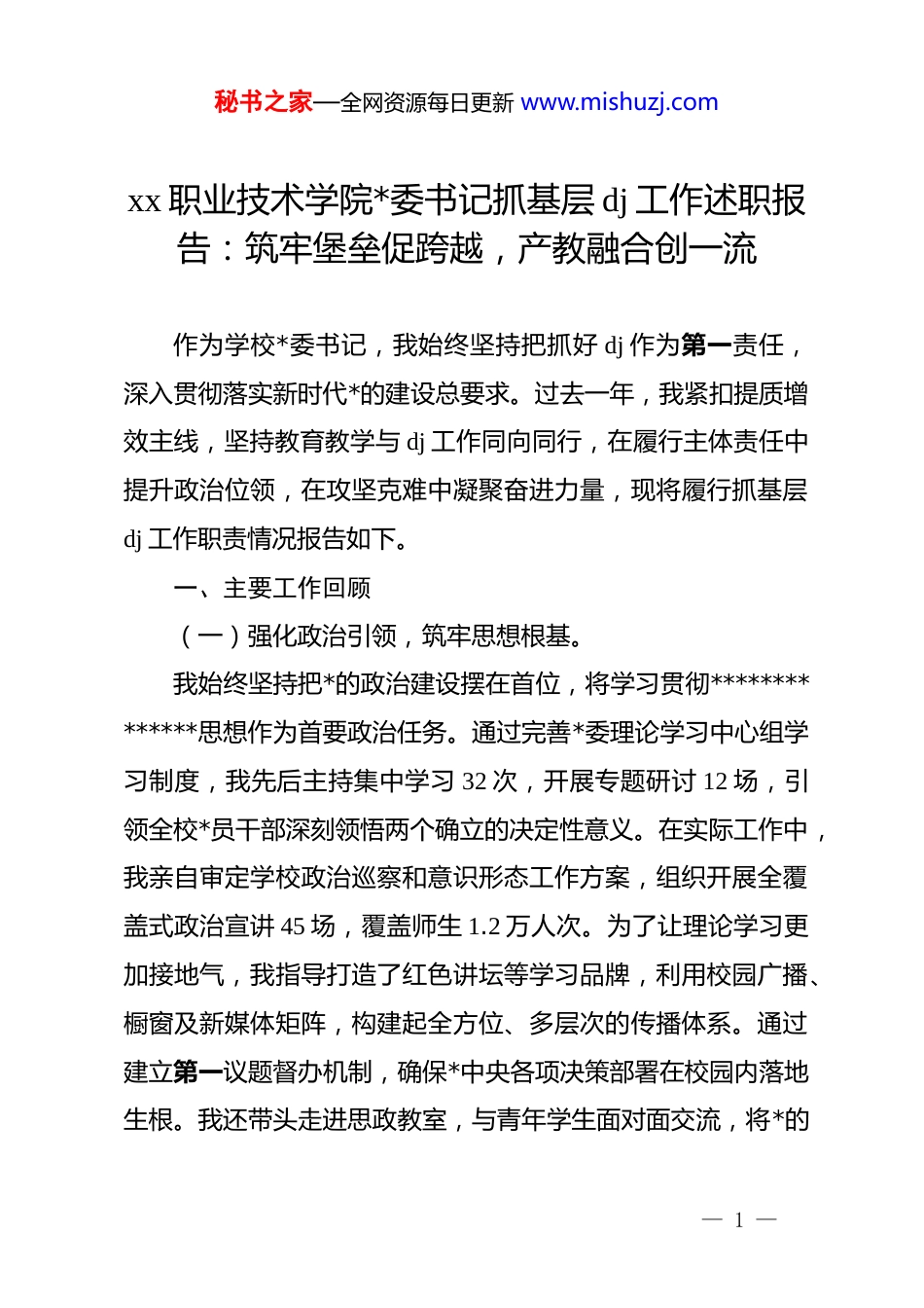 秘书之家—全网资源每日更新 www.mishuzj.comxx 职业技术学院*委书记抓基层 dj 工作述职报告:筑牢堡垒促跨越,产教融合创一流作为学校*委书记,我始终坚持把抓好 dj 作为第一责任,深入贯彻落实新时代*的建设总要求。过去一年,我紧扣提质增效主线,坚持教育教学与 dj 工作同向同行,在履行主体责任中提升政治位领,在攻坚克难中凝聚奋进力量,现将履行抓基层dj 工作职责情况报告如下。一、主要工作回顾(一)强化政治引领,筑牢思想根基。我始终坚持把*的政治建设摆在首位,将学习贯彻**************思想作为首要政治任务。通过完善*委理论学习中心组学习制度,我先后主持集中学习 32 次,开展专题研讨 12 场,引领全校*员干部深刻领悟两个确立的决定性意义。在实际工作中,我亲自审定学校政治巡察和意识形态工作方案,组织开展全覆盖式政治宣讲 45 场,覆盖师生 1.2 万人次。为了让理论学习更加接地气,我指导打造了红色讲坛等学习品牌,利用校园广播、橱窗及新媒体矩阵,构建起全方位、多层次的传播体系。通过建立第一议题督办机制,确保*中央各项决策部署在校园内落地生根。我还带头走进思政教室,与青年学生面对面交流,将*的— 1 —秘书之家—全网资源每日更新 www.mishuzj.com创新理论转化为鲜活的教学语言。在我的推动下,学校建立了15 个*员先锋示范岗,号召广大教师在教学科研中亮身份、作表率,使政治引领成为推动学校发展的硬核力量。(二)夯实组织基础,提升治理效能。我坚持大抓基层的鲜明导向,全面实施基层*组织标准化、规范化建设工程。一年来,我深入二级学院开展专题调研 20 余次,现场解决基层 dj 难题 18 个,落实专项 dj 经费 240 万元。我主持制定了*支部建设质量提升三年行动计划,推动支部建在专业上、建在课题组里。目前,全校已成功创建 3 个省级样板支部,2 个*支部入选全国 dj 工作标杆。针对*务干部业务能力不强的问题,我组织开展了领头雁素质提升培训班,累计培训350 人次,有效提升了基层*组织的战斗堡垒作用。我高度重视在高层次人才和优秀青年教师中发展*员,去年新发展教师*员26 名,其中具有博士学位或高级职称的占 40%以上。同时,我进一步完善了*委会和校长办公会议事规则,强化了*组织对办学方向、人才培养、重大事项的决策把关,形成了*委领导、校长负责、教授治学、民主管理的良好治理格局,使组织优势转化为治理效能。(三)深化融合发展,服务职教大局。我积极探索 dj 引领产教融合的新路径,坚持围绕中心抓— 2 —秘书之家—全网资源每日更新 www.mishuzj.comdj、抓好 dj 促发展。在我的直接推动下,学校与本地 12 家领军企业成立了产教融合 dj 联盟,共同构建资源共享、人才共育、技术共研发的协作平台。我们把*支部建在实训基地和产业学院,实现了教学一线*组织全覆盖。通过开展*员攻关项目,我们成功孵化了 8 个省级教学创新团队,立项了 25 个市级以上科研课题,实现了 dj 工作与教书育人的深度融合。在服务区域经济发展方面,我倡导组建了*员技术服务队,深入农村和中小企业开展技能培训和技术咨询,年累计服务时长超过 2000 小时,直接惠及群众 5000 余人。我还牵头策划了匠心育人品牌活动,将工匠精神融入*员教育,引导学生在磨炼技能的同时锤炼意志品质。这种以 dj 为纽带的深度合作,不仅提升了人才培养质量,也使学校的社会影响力和美誉度显著增强,真正实现了 dj 工作与业务工作的双轮驱动。(四)严明纪律规矩,净化政治生态。我认真履行全面从严治*第一责任人职责,持续推动清廉校园建设走深走实。一年来,我先后与领导班子成员、二级*组织负责人开展廉政谈话 60 余人次,做到提醒在前、防范在先。我支持纪委独立行使监督职权,聚焦招生就业、基建工程、物资采购等关键领域,建立健全风险防控点清单,形成了权力运行的闭环监控机制。通过开展 dj 学习教育,组织*员干部观看警— 3 —秘书之家—全网资源每日更新 www.mishuzj.com示教育片、参观廉政教育基地,不断筑牢拒腐防变的思想防线。我坚持纠四风与树新风并举,严格落实中央八项规定精...