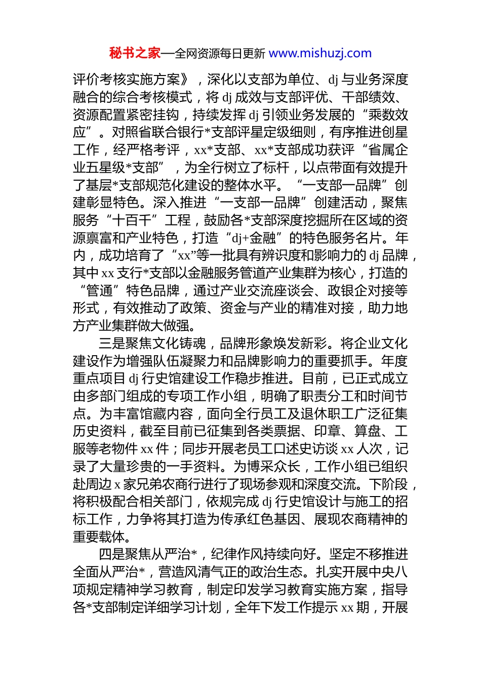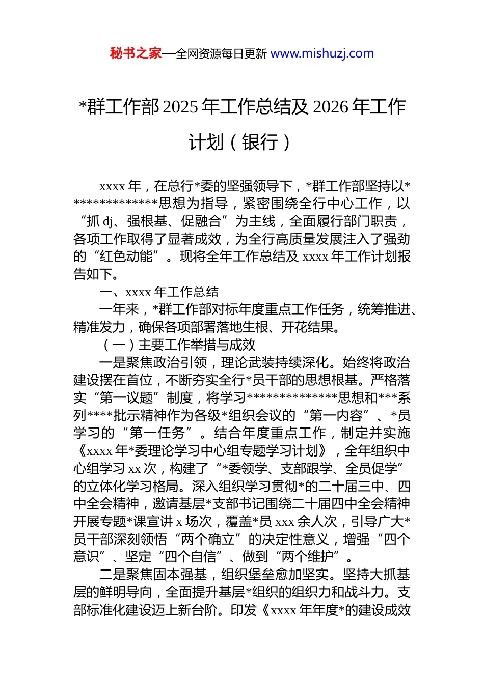 秘书之家—全网资源每日更新 www.mishuzj.com*群工作部 2025 年工作总结及 2026 年工作计划(银行)xxxx 年,在总行*委的坚强领导下,*群工作部坚持以**************思想为指导,紧密围绕全行中心工作,以“抓 dj、强根基、促融合”为主线,全面履行部门职责,各项工作取得了显著成效,为全行高质量发展注入了强劲的“红色动能”。现将全年工作总结及 xxxx 年工作计划报告如下。一、xxxx 年工作总结一年来,*群工作部对标年度重点工作任务,统筹推进、精准发力,确保各项部署落地生根、开花结果。(一)主要工作举措与成效一是聚焦政治引领,理论武装持续深化。始终将政治建设摆在首位,不断夯实全行*员干部的思想根基。严格落实“第一议题”制度,将学习**************思想和***系列****批示精神作为各级*组织会议的“第一内容”、*员学习的“第一任务”。结合年度重点工作,制定并实施《xxxx 年*委理论学习中心组专题学习计划》,全年组织中心组学习 xx 次,构建了“*委领学、支部跟学、全员促学”的立体化学习格局。深入组织学习贯彻*的二十届三中、四中全会精神,邀请基层*支部书记围绕二十届四中全会精神开展专题*课宣讲 x 场次,覆盖*员 xxx 余人次,引导广大*员干部深刻领悟“两个确立”的决定性意义,增强“四个意识”、坚定“四个自信”、做到“两个维护”。二是聚焦固本强基,组织堡垒愈加坚实。坚持大抓基层的鲜明导向,全面提升基层*组织的组织力和战斗力。支部标准化建设迈上新台阶。印发《xxxx 年年度*的建设成效秘书之家—全网资源每日更新 www.mishuzj.com评价考核实施方案》,深化以支部为单位、dj 与业务深度融合的综合考核模式,将 dj 成效与支部评优、干部绩效、资源配置紧密挂钩,持续发挥 dj 引领业务发展的“乘数效应”。对照省联合银行*支部评星定级细则,有序推进创星工作,经严格考评,xx*支部、xx*支部成功获评“省属企业五星级*支部”,为全行树立了标杆,以点带面有效提升了基层*支部规范化建设的整体水平。“一支部一品牌”创建彰显特色。深入推进“一支部一品牌”创建活动,聚焦服务“十百千”工程,鼓励各*支部深度挖掘所在区域的资源禀富和产业特色,打造“dj+金融”的特色服务名片。年内,成功培育了“xx”等一批具有辨识度和影响力的 dj 品牌,其中 xx 支行*支部以金融服务管道产业集群为核心,打造的“管通”特色品牌,通过产业交流座谈会、政银企对接等形式,有效推动了政策、资金与产业的精准对接,助力地方产业集群做大做强。三是聚焦文化铸魂,品牌形象焕发新彩。将企业文化建设作为增强队伍凝聚力和品牌影响力的重要抓手。年度重点项目 dj 行史馆建设工作稳步推进。目前,已正式成立由多部门组成的专项工作小组,明确了职责分工和时间节点。为丰富馆藏内容,面向全行员工及退休职工广泛征集历史资料,截至目前已征集到各类票据、印章、算盘、工服等老物件 xx 件;同步开展老员工口述史访谈 xx 人次,记录了大量珍贵的一手资料。为博采众长,工作小组已组织赴周边 x 家兄弟农商行进行了现场参观和深度交流。下阶段,将积极配合相关部门,依规完成 dj 行史馆设计与施工的招标工作,力争将其打造为传承红色基因、展现农商精神的重要载体。四是聚焦从严治*,纪律作风持续向好。坚定不移推进全面从严治*,营造风清气正的政治生态。扎实开展中央八项规定精神学习教育,制定印发学习教育实施方案,指导各*支部制定详细学习计划,全年下发工作提示 xx 期,开展秘书之家—全网资源每日更新 www.mishuzj.comx 轮全覆盖督导检查。总行*委班子成员带头深入基层开展调查研究,累计搜集意见建议 xx 条,领导班子查摆问题 x条,为精准整改提供了依据。同时,严把*员“入口关”,注重在业务一线和青年员工中发展*员,全年完成 x 名预备*员的转正和发展工作,为*组织注入了新鲜血液。五是聚焦意识形态,思想阵地坚固牢靠。严格落实意识形态工作责任制,将其纳入年度基层 dj 工作培训和 dj 考核,权重由 x%提升至 xx%,与支部评星定级、干部绩效直接挂钩,层层压实责任。定期开展“四级联动”专项排...