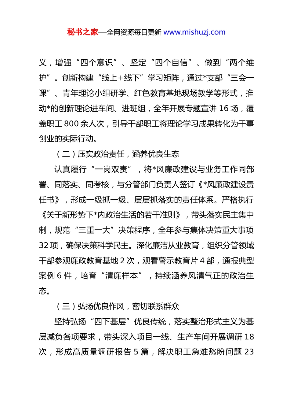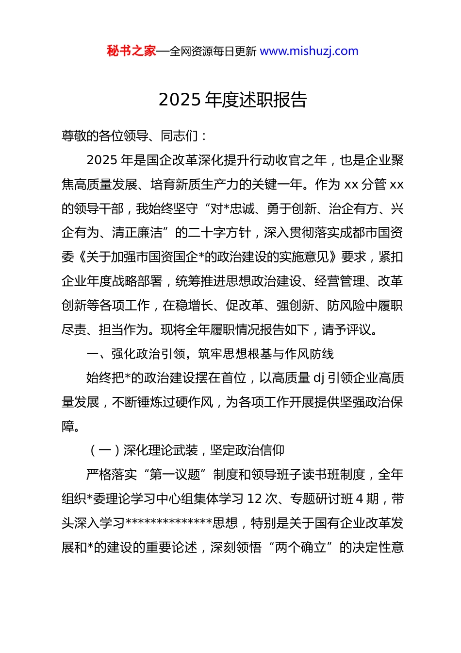 秘书之家—全网资源每日更新 www.mishuzj.com2025 年度述职报告尊敬的各位领导、同志们:2025 年是国企改革深化提升行动收官之年,也是企业聚焦高质量发展、培育新质生产力的关键一年。作为 xx 分管 xx的领导干部,我始终坚守“对*忠诚、勇于创新、治企有方、兴企有为、清正廉洁”的二十字方针,深入贯彻落实成都市国资委《关于加强市国资国企*的政治建设的实施意见》要求,紧扣企业年度战略部署,统筹推进思想政治建设、经营管理、改革创新等各项工作,在稳增长、促改革、强创新、防风险中履职尽责、担当作为。现将全年履职情况报告如下,请予评议。一、强化政治引领,筑牢思想根基与作风防线始终把*的政治建设摆在首位,以高质量 dj 引领企业高质量发展,不断锤炼过硬作风,为各项工作开展提供坚强政治保障。(一)深化理论武装,坚定政治信仰严格落实“第一议题”制度和领导班子读书班制度,全年组织*委理论学习中心组集体学习 12 次、专题研讨班 4 期,带头深入学习**************思想,特别是关于国有企业改革发展和*的建设的重要论述,深刻领悟“两个确立”的决定性意秘书之家—全网资源每日更新 www.mishuzj.com义,增强“四个意识”、坚定“四个自信”、做到“两个维护”。创新构建“线上+线下”学习矩阵,通过*支部“三会一课”、青年理论小组研学、红色教育基地现场教学等形式,推动*的创新理论进车间、进班组,全年开展专题宣讲 16 场,覆盖职工 800 余人次,引导干部职工将理论学习成果转化为干事创业的实际行动。(二)压实政治责任,涵养优良生态认真履行“一岗双责”,将*风廉政建设与业务工作同部署、同落实、同考核,与分管部门负责人签订《*风廉政建设责任书》,形成一级抓一级、层层抓落实的责任体系。严格执行《关于新形势下*内政治生活的若干准则》,带头落实民主集中制,规范“三重一大”决策程序,全年参与集体决策重大事项32 项,确保决策科学民主。深化廉洁从业教育,组织分管领域干部参观廉政教育基地 2 次,观看警示教育片 4 部,通报典型案例 6 件,培育“清廉样本”,持续涵养风清气正的政治生态。(三)弘扬优良作风,密切联系群众坚持弘扬“四下基层”优良传统,落实整治形式主义为基层减负各项要求,带头深入项目一线、生产车间开展调研 18次,形成高质量调研报告 5 篇,解决职工急难愁盼问题 23秘书之家—全网资源每日更新 www.mishuzj.com件,包括优化职工福利保障、改善生产作业环境等具体事项。建立分管部门干部谈心谈话机制,全年与中层干部、关键岗位人员谈话 40 余人次,及时掌握思想动态,化解矛盾隐患,凝聚工作合力。二、聚焦主责主业,彰显工作亮点与发展成效紧扣企业发展战略和年度经营目标,以国企改革深化提升行动为抓手,在科技创新、产业升级、项目建设等方面攻坚克难,推动各项工作取得显著成效,企业核心竞争力持续增强。(一)锚定稳增长目标,经营效益稳步提升面对复杂多变的市场环境,牵头制定“清单化管理、责任化推进”工作机制,紧盯营业收入、利润总额、国有资产保值增值率等核心指标,强化成本管控和预算管理,推动经营业绩逆势上扬。2025 年,分管业务板块实现营业收入 xx 亿元,完成利润总额 xx 万元,国有资产保值增值率达到 xx%,超额完成年度计划目标。其中,重点推进的 xx 民生工程提前 15 天竣工交付,有效提升了区域公共服务能力,获得上级主管部门和群众的高度认可。(二)深化改革创新,内生动力持续激发以国企改革深化提升行动为契机,推动体制机制创新走深走实。完善市场化经营机制,全面推行经理层成员任期制和契秘书之家—全网资源每日更新 www.mishuzj.com约化管理,实现分管部门中层干部竞争上岗率 100%,落实末等调整和不胜任退出机制,优化干部队伍结构。加大科技创新投入,全年科研投入占营业收入比重达 3.2%,牵头开展关键核心技术攻关 8 项,获得国家专利 12 项,其中发明专利 3项,成功研发 xx 新型技术产品,填补了区域行业空白,推动科技创新转化为发展动能。(三)优化产业布局,发展质效不断提升立足企业传统优势,推动产业高端化、智能...