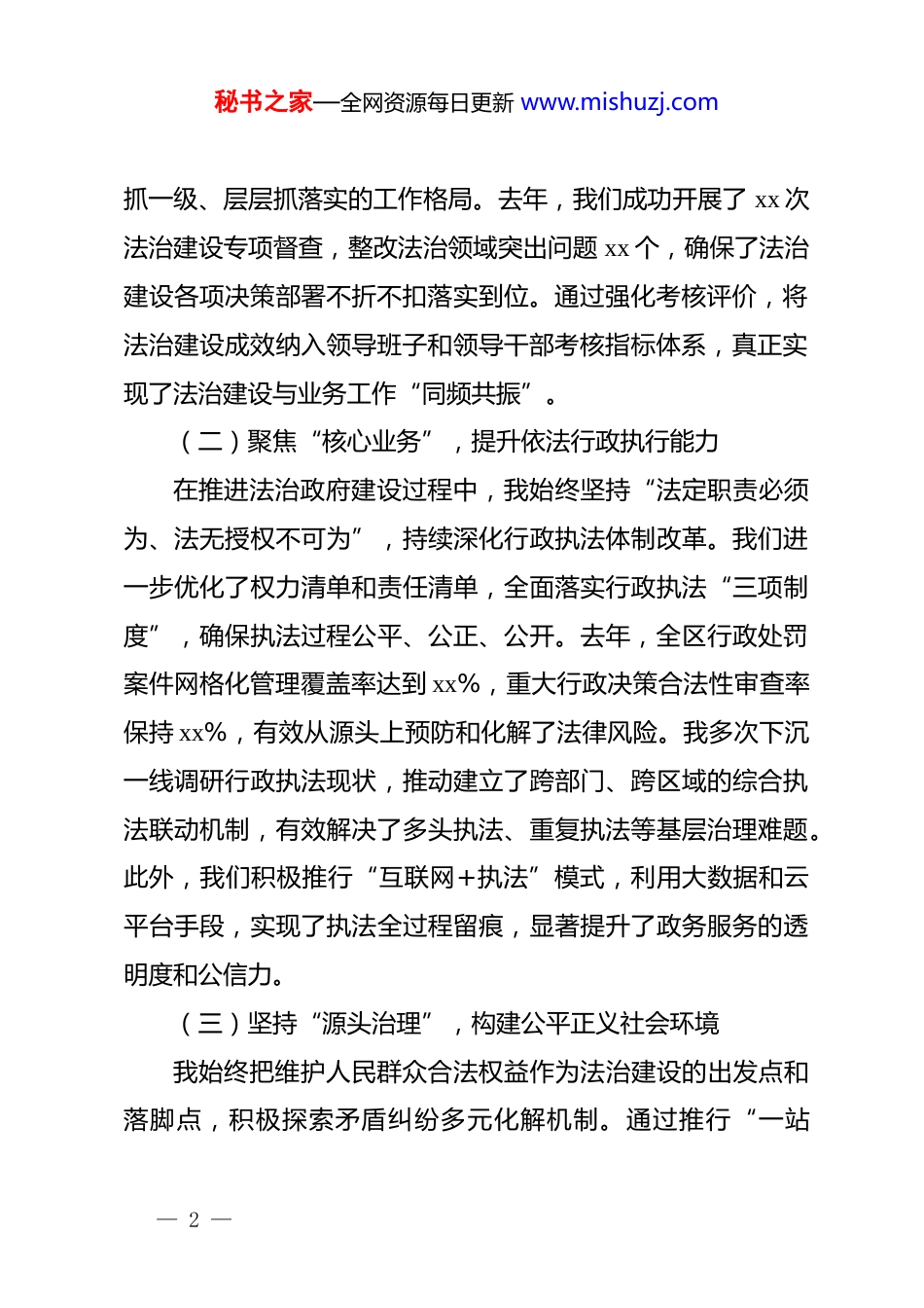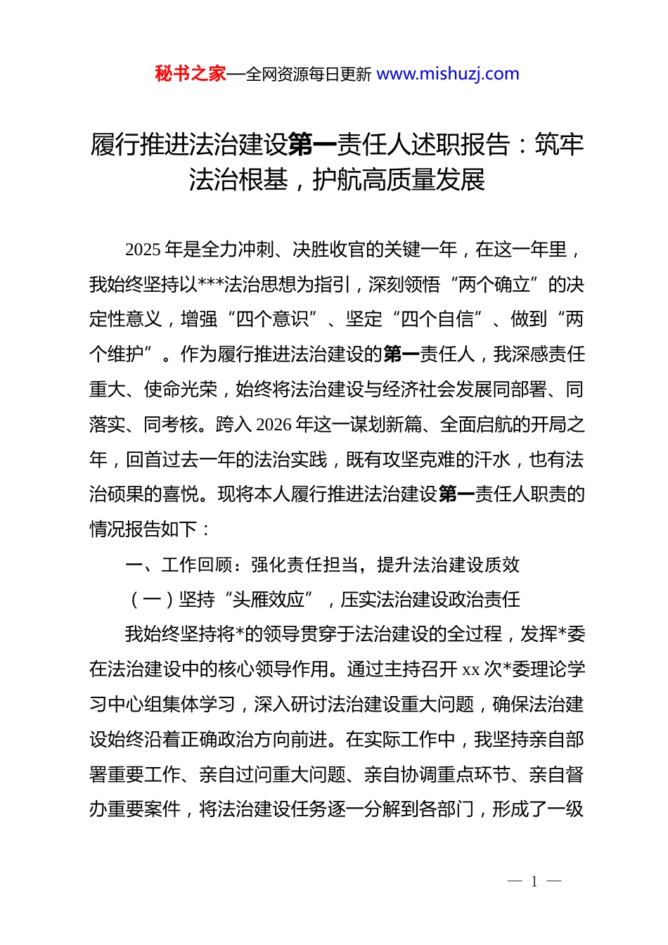 秘书之家—全网资源每日更新 www.mishuzj.com履行推进法治建设第一责任人述职报告:筑牢法治根基,护航高质量发展2025 年是全力冲刺、决胜收官的关键一年,在这一年里,我始终坚持以***法治思想为指引,深刻领悟“两个确立”的决定性意义,增强“四个意识”、坚定“四个自信”、做到“两个维护”。作为履行推进法治建设的第一责任人,我深感责任重大、使命光荣,始终将法治建设与经济社会发展同部署、同落实、同考核。跨入 2026 年这一谋划新篇、全面启航的开局之年,回首过去一年的法治实践,既有攻坚克难的汗水,也有法治硕果的喜悦。现将本人履行推进法治建设第一责任人职责的情况报告如下:一、工作回顾:强化责任担当,提升法治建设质效(一)坚持“头雁效应”,压实法治建设政治责任我始终坚持将*的领导贯穿于法治建设的全过程,发挥*委在法治建设中的核心领导作用。通过主持召开 xx 次*委理论学习中心组集体学习,深入研讨法治建设重大问题,确保法治建设始终沿着正确政治方向前进。在实际工作中,我坚持亲自部署重要工作、亲自过问重大问题、亲自协调重点环节、亲自督办重要案件,将法治建设任务逐一分解到各部门,形成了一级— 1 —秘书之家—全网资源每日更新 www.mishuzj.com抓一级、层层抓落实的工作格局。去年,我们成功开展了 xx 次法治建设专项督查,整改法治领域突出问题 xx 个,确保了法治建设各项决策部署不折不扣落实到位。通过强化考核评价,将法治建设成效纳入领导班子和领导干部考核指标体系,真正实现了法治建设与业务工作“同频共振”。(二)聚焦“核心业务”,提升依法行政执行能力在推进法治政府建设过程中,我始终坚持“法定职责必须为、法无授权不可为”,持续深化行政执法体制改革。我们进一步优化了权力清单和责任清单,全面落实行政执法“三项制度”,确保执法过程公平、公正、公开。去年,全区行政处罚案件网格化管理覆盖率达到 xx%,重大行政决策合法性审查率保持 xx%,有效从源头上预防和化解了法律风险。我多次下沉一线调研行政执法现状,推动建立了跨部门、跨区域的综合执法联动机制,有效解决了多头执法、重复执法等基层治理难题。此外,我们积极推行“互联网+执法”模式,利用大数据和云平台手段,实现了执法全过程留痕,显著提升了政务服务的透明度和公信力。(三)坚持“源头治理”,构建公平正义社会环境我始终把维护人民群众合法权益作为法治建设的出发点和落脚点,积极探索矛盾纠纷多元化解机制。通过推行“一站— 2 —秘书之家—全网资源每日更新 www.mishuzj.com式”矛盾纠纷调处化解中心建设,我们实现了矛盾纠纷化解率达 xx%的目标,真正做到了“矛盾不下山、平安不出事”。在社会治理中,我注重发挥法治的引领和规范作用,组织开展了xx 场次“法治进社区”活动,引导群众养成遇事找法、解决问题靠法的良好习惯。我们还加强了对弱势群体的法律援助,全年共办理法律援助案件 xx 件,为受援人挽回经济损失 xx 万元。法治与德治的深度融合,有效净化了社会风气,让公平正义的阳光照进千家万户,构建起平安和谐的法治社会新图景。二、存在问题:正视短板弱项,剖析法治实践症结(一)认知水平“不够高”,法治思维转换存在滞后尽管我们在法治建设上取得了一定成效,但仍有部分领导干部对法治建设的战略地位认识不足。在实际决策中,偶尔仍存在“重行政效率、轻法治程序”的现象,尚未完全养成凡事必求法有据的思维惯性。理论学习与实践运用之间存在“脱节”现象,虽然学习了大量法治理论,但在处理复杂社会矛盾时,仍倾向于依靠传统经验和行政命令,缺乏运用法治手段解决棘手问题的创新思路。这种思维定式的存在,在一定程度上制约了法治建设向纵深发展,导致部分制度设计在落地执行时出现了偏差,亟需在今后的工作中通过深入的培训与实践加以克服。— 3 —秘书之家—全网资源每日更新 www.mishuzj.com(二)制度执行“不彻底”,监督制约机制仍需完善在法治建设的制度执行层面,仍然存在制度建设与执行力度不匹配的问题。虽然我们建立了一系列规章制度,但在具体落实环节中,仍有“打折扣、搞变通”的情...