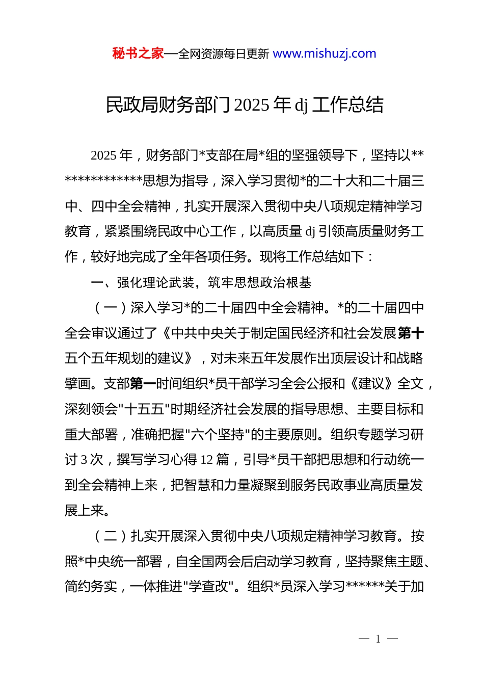 秘书之家—全网资源每日更新 www.mishuzj.com民政局财务部门 2025 年 dj 工作总结2025 年,财务部门*支部在局*组的坚强领导下,坚持以**************思想为指导,深入学习贯彻*的二十大和二十届三中、四中全会精神,扎实开展深入贯彻中央八项规定精神学习教育,紧紧围绕民政中心工作,以高质量 dj 引领高质量财务工作,较好地完成了全年各项任务。现将工作总结如下:一、强化理论武装,筑牢思想政治根基(一)深入学习*的二十届四中全会精神。*的二十届四中全会审议通过了《中共中央关于制定国民经济和社会发展第十五个五年规划的建议》,对未来五年发展作出顶层设计和战略擘画。支部第一时间组织*员干部学习全会公报和《建议》全文,深刻领会"十五五"时期经济社会发展的指导思想、主要目标和重大部署,准确把握"六个坚持"的主要原则。组织专题学习研讨 3 次,撰写学习心得 12 篇,引导*员干部把思想和行动统一到全会精神上来,把智慧和力量凝聚到服务民政事业高质量发展上来。(二)扎实开展深入贯彻中央八项规定精神学习教育。按照*中央统一部署,自全国两会后启动学习教育,坚持聚焦主题、简约务实,一体推进"学查改"。组织*员深入学习******关于加— 1 —秘书之家—全网资源每日更新 www.mishuzj.com强*的作风建设的重要论述和中央八项规定及其实施细则精神,系统总结*的十八大以来深入贯彻中央八项规定精神的成效和经验。全年组织集中学习 8 次,观看警示教育专题片《八项规定改变中国》,开展专题研讨 4 次,做到学有质量、学出实效。坚持问题导向,对照中央八项规定及其实施细则精神,结合财务工作实际,全面深入查找作风建设方面存在的问题,建立问题清单,明确整改措施,做到立查立改、即知即改。(三)持续巩固深化理论学习成果。严格落实"第一议题"制度,及时跟进学习******最新重要讲话和****批示精神。巩固拓展学习贯彻**************思想 zt 教育成果,巩固深化dj 学习教育成果,推动 dj 学习教育常态化长效化。全年组织*员学习*章*规 dj 专题培训 2 期,持续推进学纪知纪明纪守纪,教育引导*员干部做到忠诚干净担当。二、严格组织生活,夯实基层组织基础(一)规范落实组织生活制度。严格执行"三会一课"制度,全年召开支部*员大会 4 次、支部委员会 12 次、*小组会 12 次。支部书记带头讲授专题*课 2 次,围绕学习贯彻*的二十届四中全会精神、深入贯彻中央八项规定精神等主题进行深入阐释。严格执行主题*日制度,组织开展"重温入*誓词""廉政警示教育""财务人员职业道德"等主题*日活动 12 次,确保组织生活规— 2 —秘书之家—全网资源每日更新 www.mishuzj.com范化、常态化。(二)扎实开展民主评议*员工作。认真组织召开组织生活会,支部班子和*员个人对照检查,开展批评与自我批评,真正做到红脸出汗、咬耳扯袖。在民主评议*员工作中,坚持客观公正、实事求是,全体*员均被评为合格及以上等次。注重谈心谈话,支部书记与每名*员谈心谈话不少于 2 次,及时了解掌握*员思想动态,帮助解决实际困难。(三)加强*员教育管理。组织*员参加局机关*委举办的各类培训 3 期,提升*员综合素质。加强流动*员管理,做到底数清、情况明。做好发展*员工作,全年培养入*积极分子 1 名。关心关爱老*员,在重要节日走访慰问。三、坚持从严治*,营造风清气正氛围(一)压紧压实*风廉政建设责任。认真落实全面从严治*主体责任,支部书记切实履行第一责任人职责,班子成员认真履行"一岗双责"。年初与支部*员签订*风廉政建设责任书,明确责任内容和工作要求。定期研究分析支部*风廉政建设形势,全年专题研究 2 次,及时发现和解决存在的问题。(二)扎实推进作风建设常态化长效化。以深入贯彻中央八项规定精神学习教育为契机,持续纠治"四风"问题。严格执行财务管理制度,规范资金审批流程,强化"三公"经费管理,— 3 —秘书之家—全网资源每日更新 www.mishuzj.com全年"三公"经费较上年压减 10%。坚持开门教育,自觉接受群众监督评判,组织*员干部走好新时代*的群众路线,深入基层了解民政资金使用情况,确保民政惠民资金精准发...