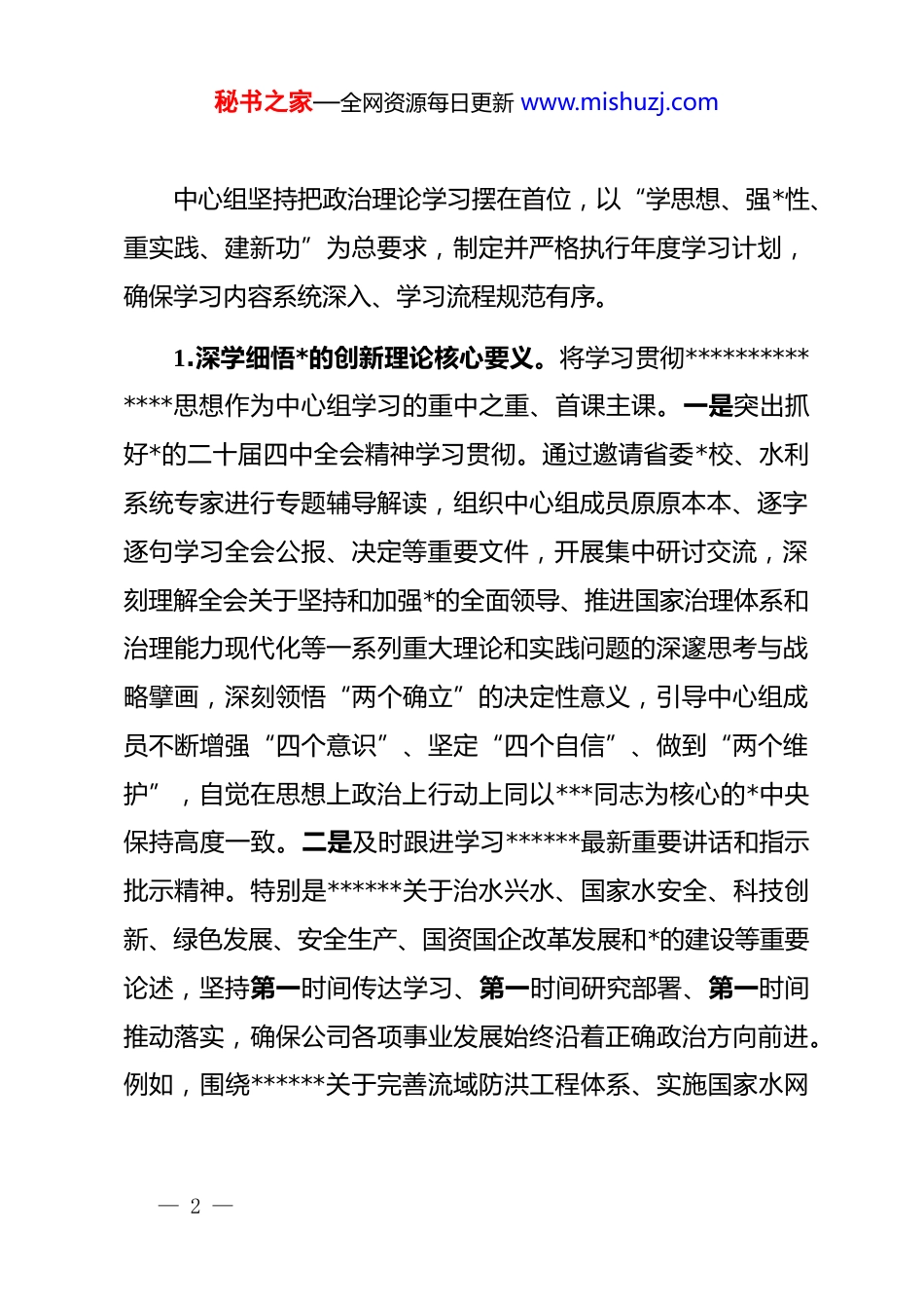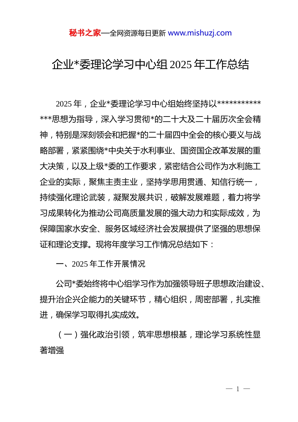 秘书之家—全网资源每日更新 www.mishuzj.com企业*委理论学习中心组 2025 年工作总结2025 年,企业*委理论学习中心组始终坚持以**************思想为指导,深入学习贯彻*的二十大及二十届历次全会精神,特别是深刻领会和把握*的二十届四中全会的核心要义与战略部署,紧紧围绕*中央关于水利事业、国资国企改革发展的重大决策,以及上级*委的工作要求,紧密结合公司作为水利施工企业的实际,聚焦主责主业,坚持学思用贯通、知信行统一,持续强化理论武装,凝聚发展共识,破解发展难题,着力将学习成果转化为推动公司高质量发展的强大动力和实际成效,为保障国家水安全、服务区域经济社会发展提供了坚强的思想保证和理论支撑。现将年度学习工作情况总结如下:一、2025 年工作开展情况公司*委始终将中心组学习作为加强领导班子思想政治建设、提升治企兴企能力的关键环节,精心组织,周密部署,扎实推进,确保学习取得扎实成效。(一)强化政治引领,筑牢思想根基,理论学习系统性显著增强— 1 —秘书之家—全网资源每日更新 www.mishuzj.com中心组坚持把政治理论学习摆在首位,以“学思想、强*性、重实践、建新功”为总要求,制定并严格执行年度学习计划,确保学习内容系统深入、学习流程规范有序。1.深学细悟*的创新理论核心要义。将学习贯彻**************思想作为中心组学习的重中之重、首课主课。一是突出抓好*的二十届四中全会精神学习贯彻。通过邀请省委*校、水利系统专家进行专题辅导解读,组织中心组成员原原本本、逐字逐句学习全会公报、决定等重要文件,开展集中研讨交流,深刻理解全会关于坚持和加强*的全面领导、推进国家治理体系和治理能力现代化等一系列重大理论和实践问题的深邃思考与战略擘画,深刻领悟“两个确立”的决定性意义,引导中心组成员不断增强“四个意识”、坚定“四个自信”、做到“两个维护”,自觉在思想上政治上行动上同以***同志为核心的*中央保持高度一致。二是及时跟进学习******最新重要讲话和指示批示精神。特别是******关于治水兴水、国家水安全、科技创新、绿色发展、安全生产、国资国企改革发展和*的建设等重要论述,坚持第一时间传达学习、第一时间研究部署、第一时间推动落实,确保公司各项事业发展始终沿着正确政治方向前进。例如,围绕******关于完善流域防洪工程体系、实施国家水网— 2 —秘书之家—全网资源每日更新 www.mishuzj.com重大工程等指示要求,组织专题学习,研究公司参与国家水网建设的切入点和着力点。三是系统研读权威著作和重要文献。坚持读原著、学原文、悟原理,组织中心组成员系统学习《***著作选读》、《**************思想专题摘编》、《***关于国家粮食安全论述摘编》中涉及水利相关内容等,通过精读深研、交流心得,努力掌握贯穿其中的立场观点方法,不断提升政治判断力、政治领悟力、政治执行力。2.扎实开展*内法规和纪律学习教育。将深入学习*章*规 dj作为强化纪律意识、规矩意识的重要途径。一是持续深入贯彻中央八项规定精神。中心组将中央八项规定及其实施细则精神作为常学常新、严格执行的重要内容。组织专题学习会,重温中央八项规定精神,学习上级*委关于作风建设的最新部署要求,通报违反中央八项规定精神的典型案例,开展警示教育。中心组成员带头对照检查,深刻剖析在调查研究、会议活动、文件简报、公务接待、勤俭节约等方面可能存在的薄弱环节,明确改进措施。结合水利施工企业特点,特别强调在工程项目管理、招标采购、公务用车等方面严格执行规定,坚决反对“四风”特别是形式主义、官僚主义,倡导求真务实、勤俭节约的工作作风,营造风清气正的政治生态。二是强化其他重点*内法规学— 3 —秘书之家—全网资源每日更新 www.mishuzj.com习。深入学习《中国共产 dj 律处分条例》、《中国共产*问责条例》、《中国共产*国有企业基层组织工作条例(试行)》等,引导中心组成员知敬畏、存戒惧、守底线,习惯在受监督和约束的环境中工作生活,筑牢拒腐防变的思想防线。全年组织开展*风廉政专题学习**次,警示教育**次。3.紧扣政策要求与行业特点,提升合规经营与专业能力。围绕国家宏观政...
