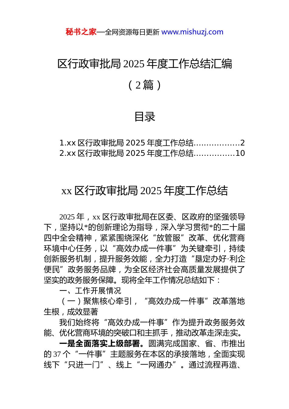 秘书之家—全网资源每日更新 www.mishuzj.com区行政审批局 2025 年度工作总结汇编(2 篇)目录1.xx 区行政审批局 2025 年度工作总结..................22.xx 区行政审批局 2025 年度工作总结................10xx 区行政审批局 2025 年度工作总结2025 年,xx 区行政审批局在区委、区政府的坚强领导下,坚持以*的创新理论为指导,深入学习贯彻*的二十届四中全会精神,紧紧围绕深化“放管服”改革、优化营商环境中心任务,以“高效办成一件事”为关键牵引,持续创新服务机制,提升服务效能,全力打造“垦定办好·利企便民”政务服务品牌,为全区经济社会高质量发展提供了坚实的政务服务保障。现将全年工作情况总结如下:一、工作开展情况(一)聚焦核心牵引,“高效办成一件事”改革落地生根,成效显著我们始终将“高效办成一件事”作为提升政务服务效能、优化营商环境的突破口和主抓手,推动改革走深走实。一是全面落实上级部署。圆满完成国家、省、市推出的 37 个“一件事”主题服务在本区的承接落地,全面实现线下“只进一门”、线上“一网通办”。通过流程再造、秘书之家—全网资源每日更新 www.mishuzj.com数据共享、业务协同,相关主题服务平均办理时长压减67%,办事群众跑动次数压减 90%,企业群众办事便捷度、获得感大幅提升。二是创新推出特色场景。立足我区资源禀赋和产业特点,主动谋划、精准施策,创新推出“养殖场一件事”、“城市建筑垃圾处置核准一件事”等一批具有 xx 特色的“一件事”集成服务。其中,“农药经营许可一件事”、“农作物种子生产经营许可一件事”改革案例因其显著成效和示范意义,成功入选《山东省农业农村系统深化“高效办成一件事”改革优化营商环境典型案例汇编》。三是改革成果获得广泛认可。我局探索形成的《xx 区“三位一体”优化营商环境赋能新能源产业高质量发展》经验做法,被东营市委深化改革委员会办公室《改革动态》刊发推广。《“创优服务+多元赋能”助推黄河口大闸蟹产业高质量发展》实践案例,在全市深化“高效办成一件事”改革暨优化营商环境创新实践案例评选中荣获“最佳案例”。这些荣誉充分证明了我区“一件事”改革的深度和实效。(二)聚力标准规范,政务服务基础不断夯实,全面提档我们坚持标准引领、规范运行,推动政务服务 从“有”向“优”、从“可办”向“好办易办”转变。一是标准化建设取得里程碑成果。系统编制涵盖业务流程、机制保障等 4 个方面的政务服务标准文件 438 件,构建起较为完备的政务服务标准体系,确保各项工作有标可依、有规可循。2025 年 12 月 19 日,我局承担的政务服务标准化试点项目高标准通过省级验收,标志着我区政务服务标准化、规范化水平迈上新台阶。二是事项管理精准高效。常态化开展政务服务事项网上办理能力核验,组织业务骨干对全区 37 个部门的 1615 项政务服务事项要素准确性、网办通畅度进行全面“体检”秘书之家—全网资源每日更新 www.mishuzj.com实现事项认领率、清单编制率、办事指南和网办深度对外公开准确率三个 100%。建立“问题反馈-整改跟踪-成效复查”闭环管理机制,确保问题即时发现、快速整改。三是智慧服务模式深入人心。创新打造“垦云办”智慧政务服务体系,推出“云评审”、“云管家”、“视频办”、“云导服”等一批“不见面”办事新模式。策划制作的“晶豆子带你看大厅”系列微视频达 109 期,总点播量突破 160 万次,以生动直观的方式解读政策、演示流程,有效回应了社会关切,降低了企业群众的学习成本。(三)深化关键改革,重点领域审批效能实现突破,活力迸发我们紧盯企业关切和项目需求,在关键领域推行一系列突破性改革,激发市场主体活力。一是企业全生命周期服务持续优化。纵深推进企业开办领域“6170”服务机制,深化“多证合一”、住所(经营场所)标准化登记、企业迁移“一件事”等改革。创新推出经营主体登记地址库“预备案”制度,大力推行市场主体设立、变更、注销等业务“全程网办”。企业迁移实现“一件事”办理后,办理时限压缩 66.7%。全年累计为新开办企业发放“大礼包”1329 套,为企业节约成本...