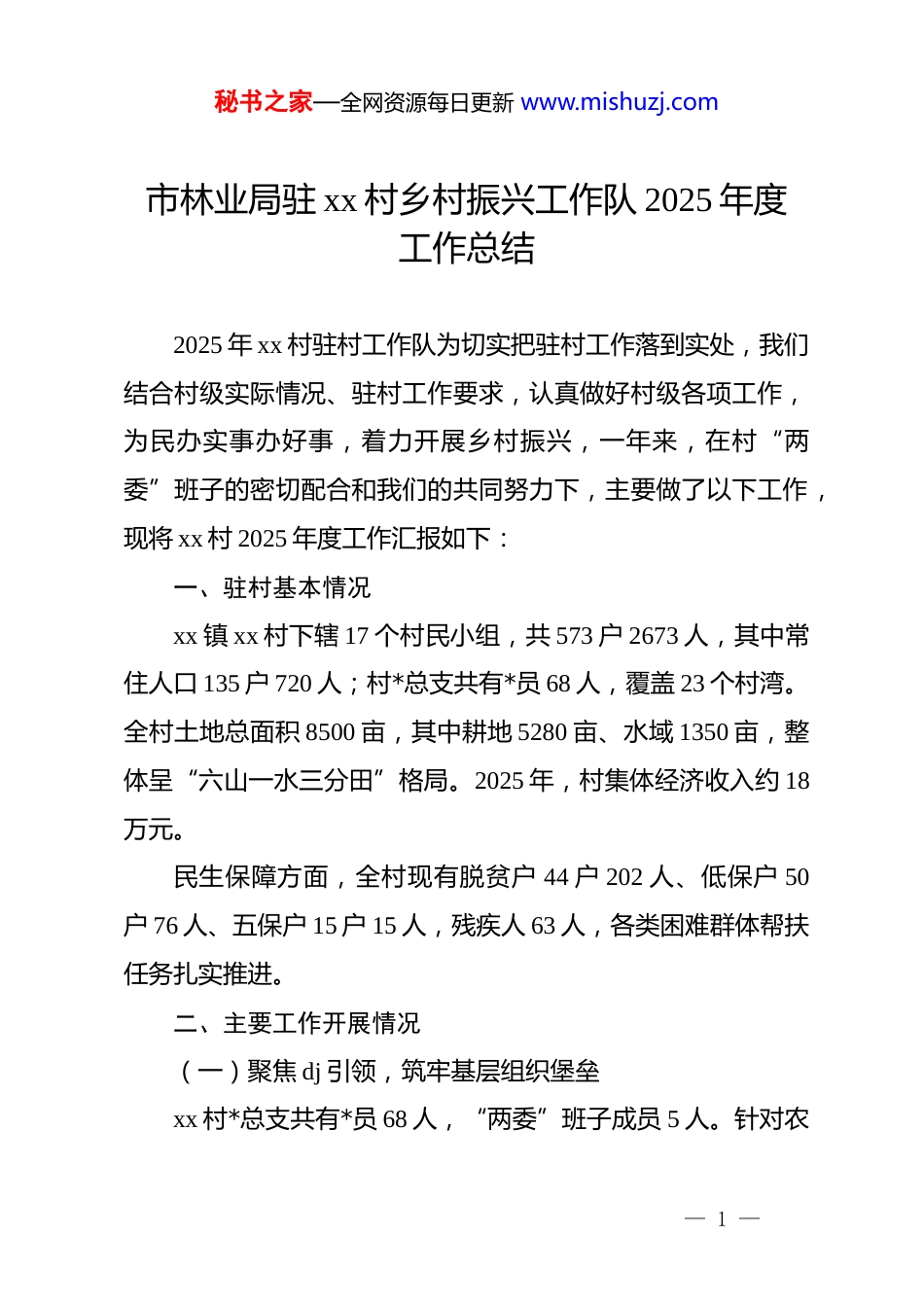 秘书之家—全网资源每日更新 www.mishuzj.com市林业局驻 xx 村乡村振兴工作队 2025 年度工作总结2025 年 xx 村驻村工作队为切实把驻村工作落到实处,我们结合村级实际情况、驻村工作要求,认真做好村级各项工作,为民办实事办好事,着力开展乡村振兴,一年来,在村“两委”班子的密切配合和我们的共同努力下,主要做了以下工作,现将 xx 村 2025 年度工作汇报如下:一、驻村基本情况xx 镇 xx 村下辖 17 个村民小组,共 573 户 2673 人,其中常住人口 135 户 720 人;村*总支共有*员 68 人,覆盖 23 个村湾。全村土地总面积 8500 亩,其中耕地 5280 亩、水域 1350 亩,整体呈“六山一水三分田”格局。2025 年,村集体经济收入约 18万元。民生保障方面,全村现有脱贫户 44 户 202 人、低保户 50户 76 人、五保户 15 户 15 人,残疾人 63 人,各类困难群体帮扶任务扎实推进。二、主要工作开展情况(一)聚焦 dj 引领,筑牢基层组织堡垒xx 村*总支共有*员 68 人,“两委”班子成员 5 人。针对农— 1 —秘书之家—全网资源每日更新 www.mishuzj.com村*员多外出务工、经商,常住村内*员较少的实际情况,协助村*总支搭建*员线上交流平台,建立*员微信群,常态化发布上级精神、会议通知、中心工作部署及政策法规等内容,切实加强农村基层*组织日常建设。强化理论武装与组织建设,全力推动“三会一课”、主题*日等组织生活常态化开展,有序推进新*员转接、纳新等工作。2025 年 10 月,见义勇为英雄 xxx 同志按期转为中共正式*员;带领村民探索黑斑蛙、牛蛙养殖技术致富的优秀青年 xxx 发展为中共预备*员,另有 3 人确定为入*积极分子,为村*组织注入新鲜活力。(二)聚力强村富民,激活产业发展动能依托 xx 村临近城区的区位优势,立足村内种养殖业发展基础,重点培育特色产业基地,带动村民增收致富。目前,村内已建成规模猕猴桃种植基地 2 家(xx、xx)、苗木基地 3 家(xx、xx、xx)、中药材种植基地 2 处(xx、xx)。各类产业基地不仅为村民提供土地租金收益,还吸纳当地农民就近务工,帮助村民掌握种植技术,为后续产业升级奠定坚实基础。养殖产业稳步发展,村内现有 5000 头以上规模牲猪场 1 处、藏香猪养殖场 1 处、黑斑蛙及牛蛙养殖场 1 处,各养殖项目效益良好,产业培育潜力巨大,为壮大村集体经济、拓宽村民增— 2 —秘书之家—全网资源每日更新 www.mishuzj.com收渠道提供了有力支撑。(三)着眼宜居宜业,提升乡村治理效能协同村“两委”建立“村规民约”积分管理制度,将“参会履职、环境整治、户容清洁、组级卫生、生育支持、升学奖励、好人好事、政策宣传”等行为纳入量化积分范围,以积分激励机制引导村民主动参与乡村振兴、人居环境整治、平安建设等共建共治共享活动,有效激发村民自治活力,取得良好治理成效。健全民主决策机制,建立常态化议事制度,对村组重大事项、产业发展规划、基础设施建设等关键工作,通过村民代表大会、户主会等多种形式广泛征求意见,实现民主决策、公开透明,保障村民的知情权、参与权与监督权。优化矛盾调解机制,秉持“大事不出村、小事不出组”的基层治理理念,牵头组建由*员干部、村民组长、村民代表构成的调解委员会,下沉一线开展矛盾纠纷排查与调解工作,让调解服务更接地气,有效化解邻里矛盾、利益纠纷,助力和谐乡村建设。(四)心系群众冷暖,用心用情为民服务始终把民生实事办好、把民生底线兜牢,协助村“两委”加强农村低收入群体帮扶政策宣传与落实,确保政策公开透明、— 3 —秘书之家—全网资源每日更新 www.mishuzj.com精准落地,在巩固拓展脱贫攻坚成果的同时,推动农民稳定增收,切实保障“三保障”及饮水安全。精准帮扶困难群众,针对六组村民 xxx 家庭 3 人残疾、其子患精神病的特殊困境,多次入户走访了解实际情况,协助办理残疾证明,逐项对照帮扶政策,确保各项救助措施落实到位。针对十三组村民洪应先住房鉴定为危房、经济困难的问题,积极向林业局*组汇报情况,争取到 1 万元危房改造补贴资金,帮助其顺利完成...
