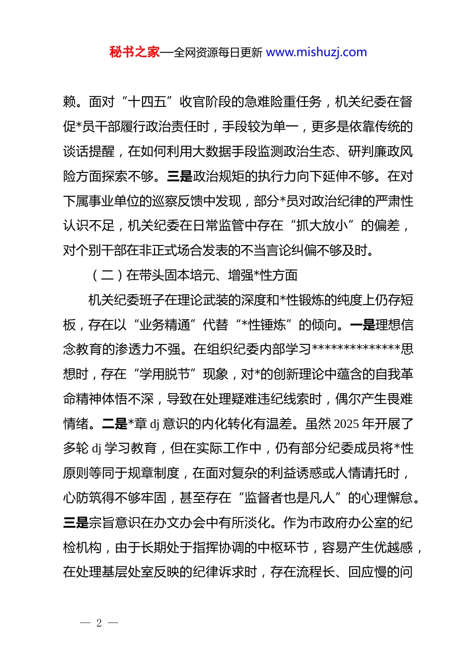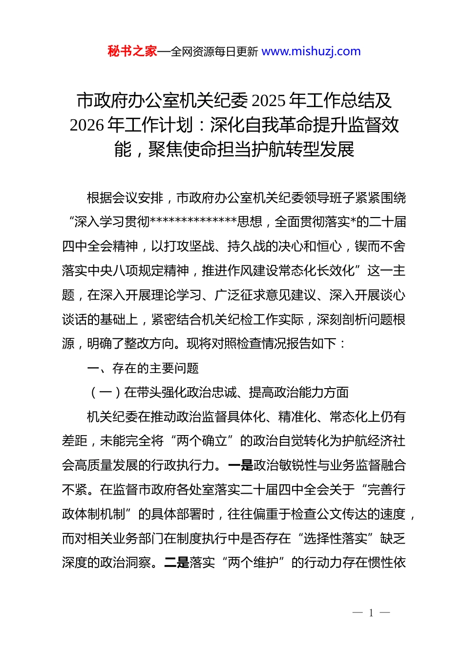 秘书之家—全网资源每日更新 www.mishuzj.com市政府办公室机关纪委 2025 年工作总结及2026 年工作计划:深化自我革命提升监督效能,聚焦使命担当护航转型发展根据会议安排,市政府办公室机关纪委领导班子紧紧围绕“深入学习贯彻**************思想,全面贯彻落实*的二十届四中全会精神,以打攻坚战、持久战的决心和恒心,锲而不舍落实中央八项规定精神,推进作风建设常态化长效化”这一主题,在深入开展理论学习、广泛征求意见建议、深入开展谈心谈话的基础上,紧密结合机关纪检工作实际,深刻剖析问题根源,明确了整改方向。现将对照检查情况报告如下:一、存在的主要问题(一)在带头强化政治忠诚、提高政治能力方面机关纪委在推动政治监督具体化、精准化、常态化上仍有差距,未能完全将“两个确立”的政治自觉转化为护航经济社会高质量发展的行政执行力。一是政治敏锐性与业务监督融合不紧。在监督市政府各处室落实二十届四中全会关于“完善行政体制机制”的具体部署时,往往偏重于检查公文传达的速度,而对相关业务部门在制度执行中是否存在“选择性落实”缺乏深度的政治洞察。二是落实“两个维护”的行动力存在惯性依— 1 —秘书之家—全网资源每日更新 www.mishuzj.com赖。面对“十四五”收官阶段的急难险重任务,机关纪委在督促*员干部履行政治责任时,手段较为单一,更多是依靠传统的谈话提醒,在如何利用大数据手段监测政治生态、研判廉政风险方面探索不够。三是政治规矩的执行力向下延伸不够。在对下属事业单位的巡察反馈中发现,部分*员对政治纪律的严肃性认识不足,机关纪委在日常监管中存在“抓大放小”的偏差,对个别干部在非正式场合发表的不当言论纠偏不够及时。(二)在带头固本培元、增强*性方面机关纪委班子在理论武装的深度和*性锻炼的纯度上仍存短板,存在以“业务精通”代替“*性锤炼”的倾向。一是理想信念教育的渗透力不强。在组织纪委内部学习**************思想时,存在“学用脱节”现象,对*的创新理论中蕴含的自我革命精神体悟不深,导致在处理疑难违纪线索时,偶尔产生畏难情绪。二是*章 dj 意识的内化转化有温差。虽然 2025 年开展了多轮 dj 学习教育,但在实际工作中,仍有部分纪委成员将*性原则等同于规章制度,在面对复杂的利益诱惑或人情请托时,心防筑得不够牢固,甚至存在“监督者也是凡人”的心理懈怠。三是宗旨意识在办文办会中有所淡化。作为市政府办公室的纪检机构,由于长期处于指挥协调的中枢环节,容易产生优越感,在处理基层处室反映的纪律诉求时,存在流程长、回应慢的问— 2 —秘书之家—全网资源每日更新 www.mishuzj.com题,未能完全做到将“为民情怀”融入每一次执纪调研中。(三)在带头敬畏人民、敬畏组织、敬畏法纪方面在规范权力运行、防止特权思想及落实民主集中制上,机关纪委的制约作用发挥不够充分。一是贯彻民主集中制的实效性存在盲区。在审议重大违纪处理建议时,班子成员有时由于顾及“处室关系”,在会上发表独立见解的意愿不强,存在随大流现象,导致集体决策的“纠错机制”未能发挥最大效能。二是权力运行的监督链条存在断档。在对政府办采购、资产管理等高风险环节的监督中,机关纪委更多是参与“事后备案”,对决策前期的风险评估参与度不足,未能有效杜绝个别干部在项目分配上的“微权力”寻租空间。三是落实“四下基层”制度浮于表面。在调研基层政风行风时,存在“为了调研而调研”的现象,走访多在办公室听汇报,深入窗口一线、项目工地实地蹲点少,导致掌握的第一手资料不充分,对群众反映强烈的办事效率低下、特权思想抬头等问题监督不够有力。(四)在带头干事创业、担当作为方面面对“十五五”规划开局的战略机遇,机关纪委在服务大局、激励干部担当作为上的职能发挥不够。一是对正确政绩观的引导力不足。在监督处室完成“十四五”考核指标时,对个别部门为冲刺数据而出现的“数字注水”、形象工程苗头发现— 3 —秘书之家—全网资源每日更新 www.mishuzj.com不及时,没能从纪律高度有效阻断盲目扩张和违规举债的冲动。二是敢于斗争的精气神有所退化。面对政务服务中的“中梗阻”现...