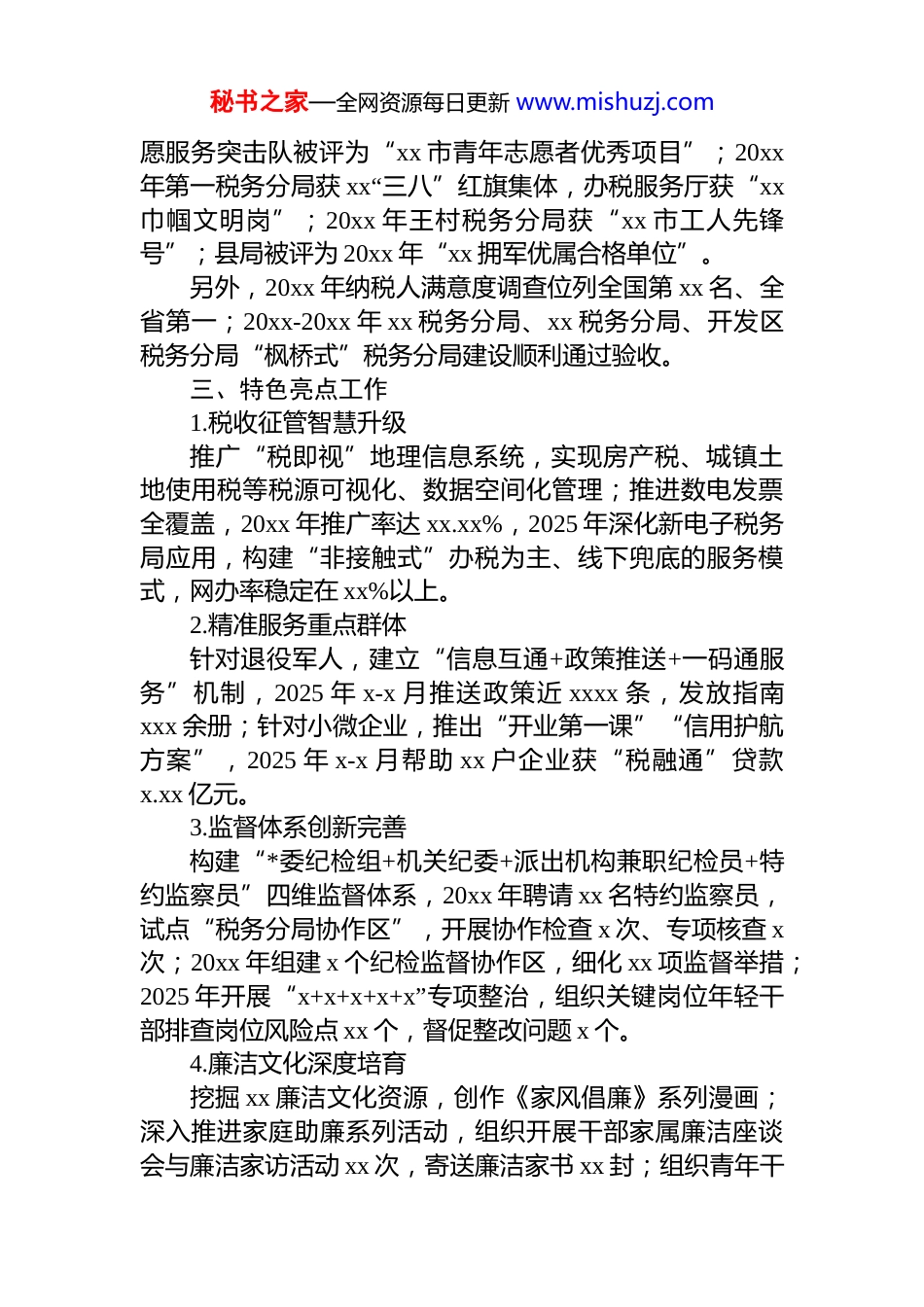 秘书之家—全网资源每日更新 www.mishuzj.com税务局“十四五”以来工作总结一、“十四五”目标任务和重点工作完成情况1.税费收入稳步增长“十四五”以来,坚持依法依规征税收费,严守征收底线,认真组织各项税费收入。2.征管改革持续深化持续推进发票电子化改革,20xx 年 xx 月数电发票顺利上线,20xx 年推广率达 xx.xx%;2025 年持续推进新电子税务局扩围与应用。加强税源精细化管理,开展房产税、城镇土地使用税、耕地占用税等税源清查与管理,推广“税即视”地理信息系统。强化欠税管理,20xx 年欠税清理入库,“欠税增减率”从 xx.xx%降至-x.xx%。落实“法院+税务”联动机制,协同办理 xx 份执行裁定书,并入库税费。3.纳税服务不断优化连续开展“便民办税春风行动”,推出多批创新举措。“十四五”期间接连开展“春雨润苗”“百名税干进千企大走访”等活动,20xx 年走访 xxxx 户企业,收集意见建议xx 条。创建“郑锦霞纳税服务劳模(职工)创新工作室”,通过在线互动、网络直播等解决办税难题。推动税费政策精准落地,依托平台数据整合能力,按企业类型智能筛选适配政策,定向推送政策礼包 xx 批次共 xxxxx 户次。强化纳税信用应用,创新“税绿新安贷”,助力 xx 户绿色低碳企业获融资 x.xx 亿元。二、重大荣誉和主要成绩集体荣誉:20xx 年,国家税务总局 xx 税务局获“全国税务系统文明单位”“拥军优属模范单位(市级)”,徽城税务分局获“全国工人先锋号”;20xx 年国家税务总局xx 税务局获“全省就业工作先进集体”,“燃税青年”志秘书之家—全网资源每日更新 www.mishuzj.com愿服务突击队被评为“xx 市青年志愿者优秀项目”;20xx年第一税务分局获 xx“三八”红旗集体,办税服务厅获“xx巾帼文明岗”;20xx 年王村税务分局获“xx 市工人先锋号”;县局被评为 20xx 年“xx 拥军优属合格单位”。另外,20xx 年纳税人满意度调查位列全国第 xx 名、全省第一;20xx-20xx 年 xx 税务分局、xx 税务分局、开发区税务分局“枫桥式”税务分局建设顺利通过验收。三、特色亮点工作1.税收征管智慧升级推广“税即视”地理信息系统,实现房产税、城镇土地使用税等税源可视化、数据空间化管理;推进数电发票全覆盖,20xx 年推广率达 xx.xx%,2025 年深化新电子税务局应用,构建“非接触式”办税为主、线下兜底的服务模式,网办率稳定在 xx%以上。2.精准服务重点群体针对退役军人,建立“信息互通+政策推送+一码通服务”机制,2025 年 x-x 月推送政策近 xxxx 条,发放指南xxx 余册;针对小微企业,推出“开业第一课”“信用护航方案”,2025 年 x-x 月帮助 xx 户企业获“税融通”贷款x.xx 亿元。3.监督体系创新完善构建“*委纪检组+机关纪委+派出机构兼职纪检员+特约监察员”四维监督体系,20xx 年聘请 xx 名特约监察员,试点“税务分局协作区”,开展协作检查 x 次、专项核查 x次;20xx 年组建 x 个纪检监督协作区,细化 xx 项监督举措;2025 年开展“x+x+x+x+x”专项整治,组织关键岗位年轻干部排查岗位风险点 xx 个,督促整改问题 x 个。4.廉洁文化深度培育挖掘 xx 廉洁文化资源,创作《家风倡廉》系列漫画;深入推进家庭助廉系列活动,组织开展干部家属廉洁座谈会与廉洁家访活动 xx 次,寄送廉洁家书 xx 封;组织青年干秘书之家—全网资源每日更新 www.mishuzj.com部走进 xx 剪纸艺术馆、xx 故居清廉馆开展沉浸式教育。做实“纪检委员履责时间”制度,组织开展“严管就是厚爱”宣讲,加强对*员干部的管理、教育。